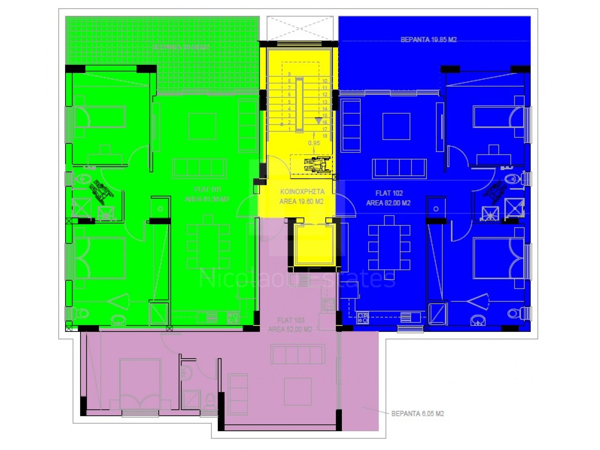 Το διαμέρισμα αυτό βρίσκεται στον πρώτο όροφο ενός μικρού κτηρίου που αποτελείται από 7 διαμερίσματα. Ο πρώτος και ο δεύτερος όροφος αποτελούνται από δύο διαμερίσματα των 2 υπνοδωματίων και ένα διαμέρισμα του 1ος υπνοδωματίου ενώ ο τρίτος όροφος αποτελείται από ένα διαμέρισμα των 3ων υπνοδωματίων.