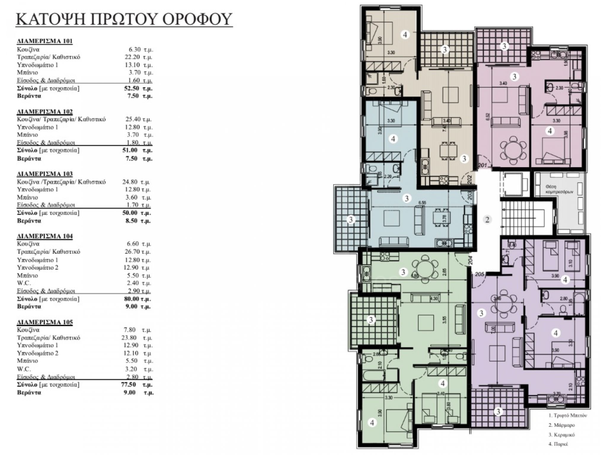 Τα υλικά για την ανέγερση και εξοπλισμό των διαμερισμάτων είναι επιλεγμένα από αξιόπιστους προμηθευτές, με γνώμονα την ασφάλεια, ανθεκτικότητα και την καλαισθησία τόσο των εσωτερικών χώρων των διαμερισμάτων, όσο και των εξωτερικών όψεων της πολυκατοικίας.