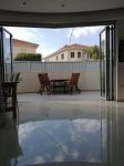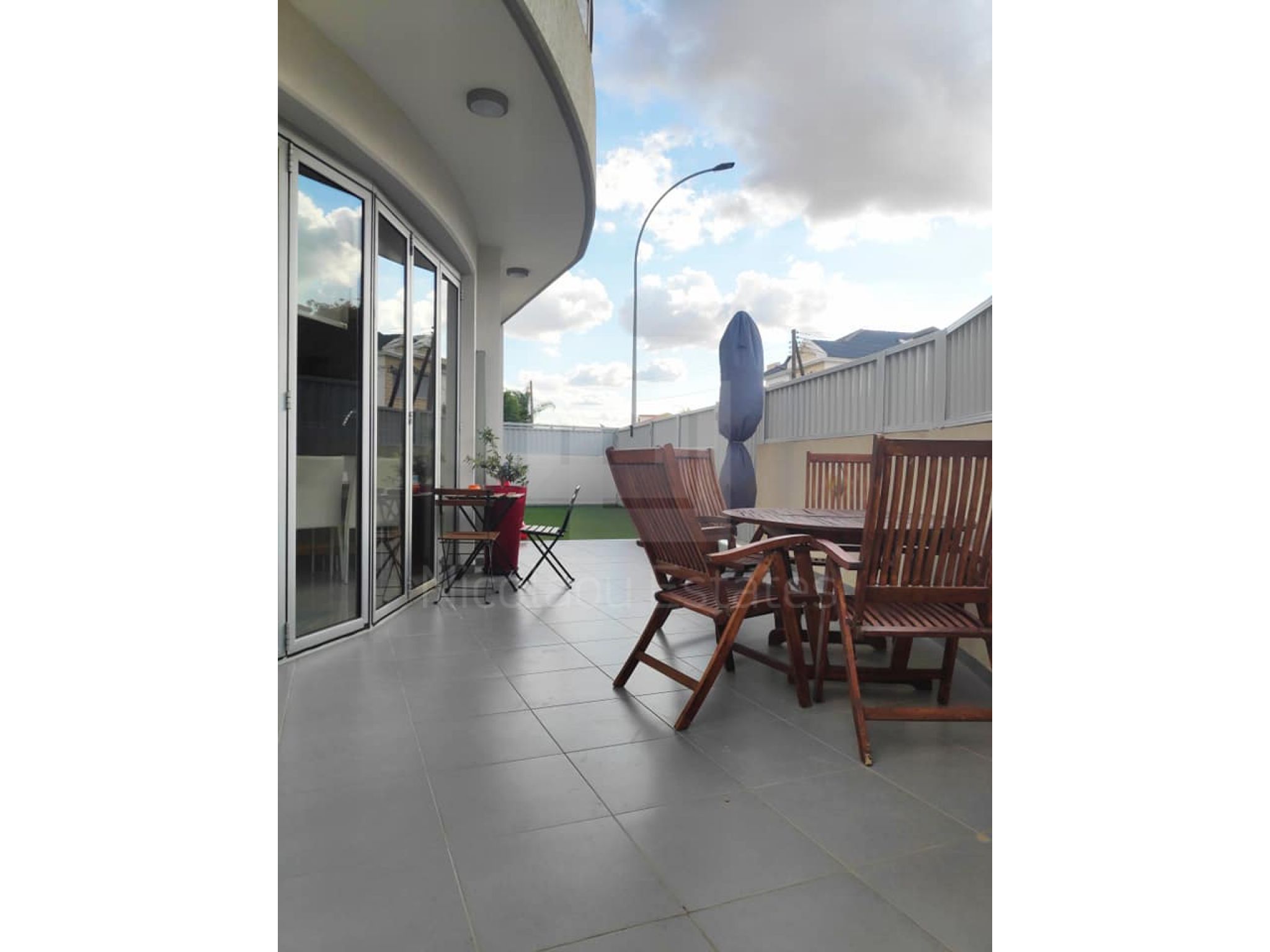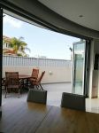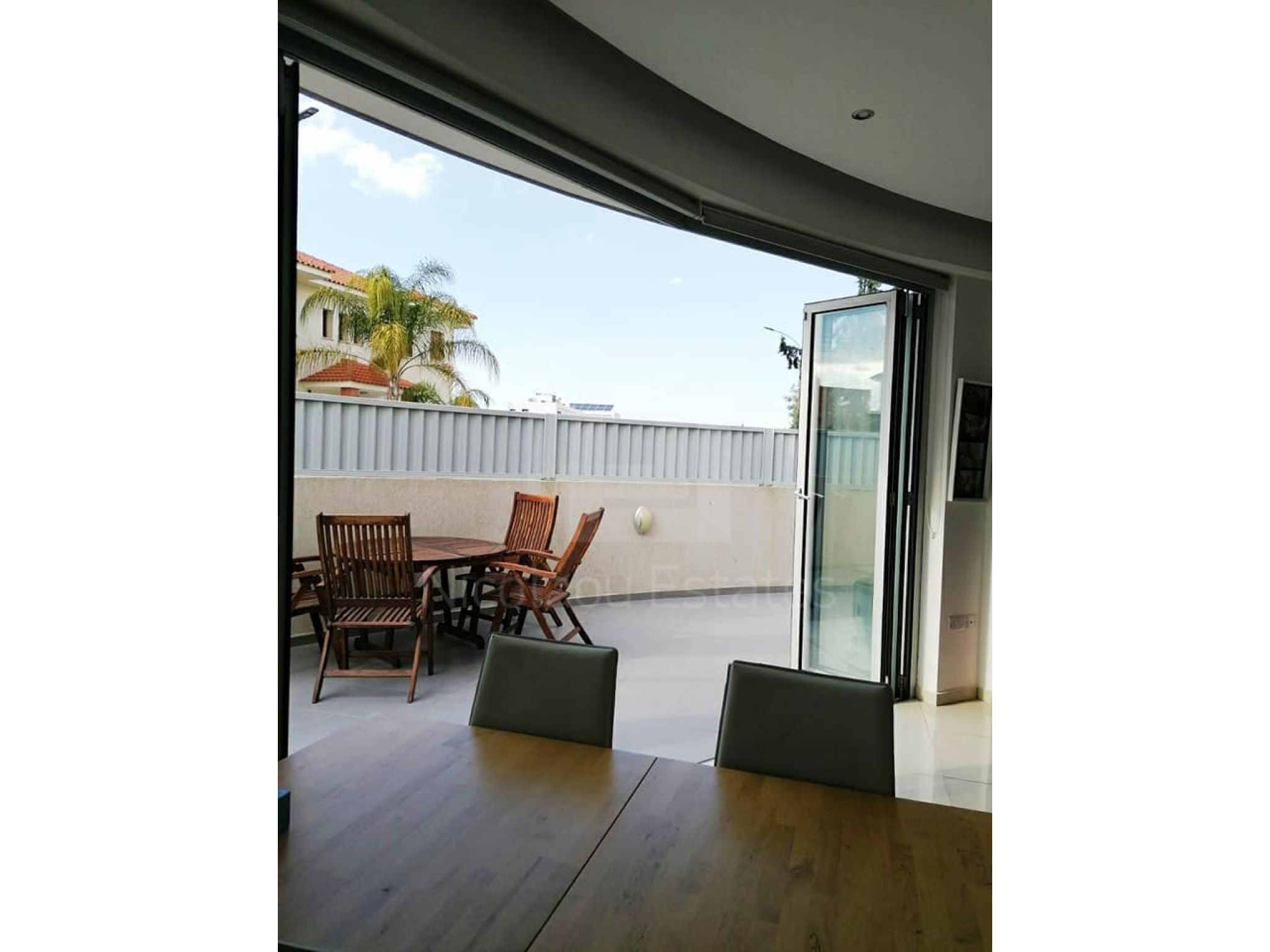 - 6-leaf sliding balcony doors in the living room, fully open, with unobstructed access to the courtyard.