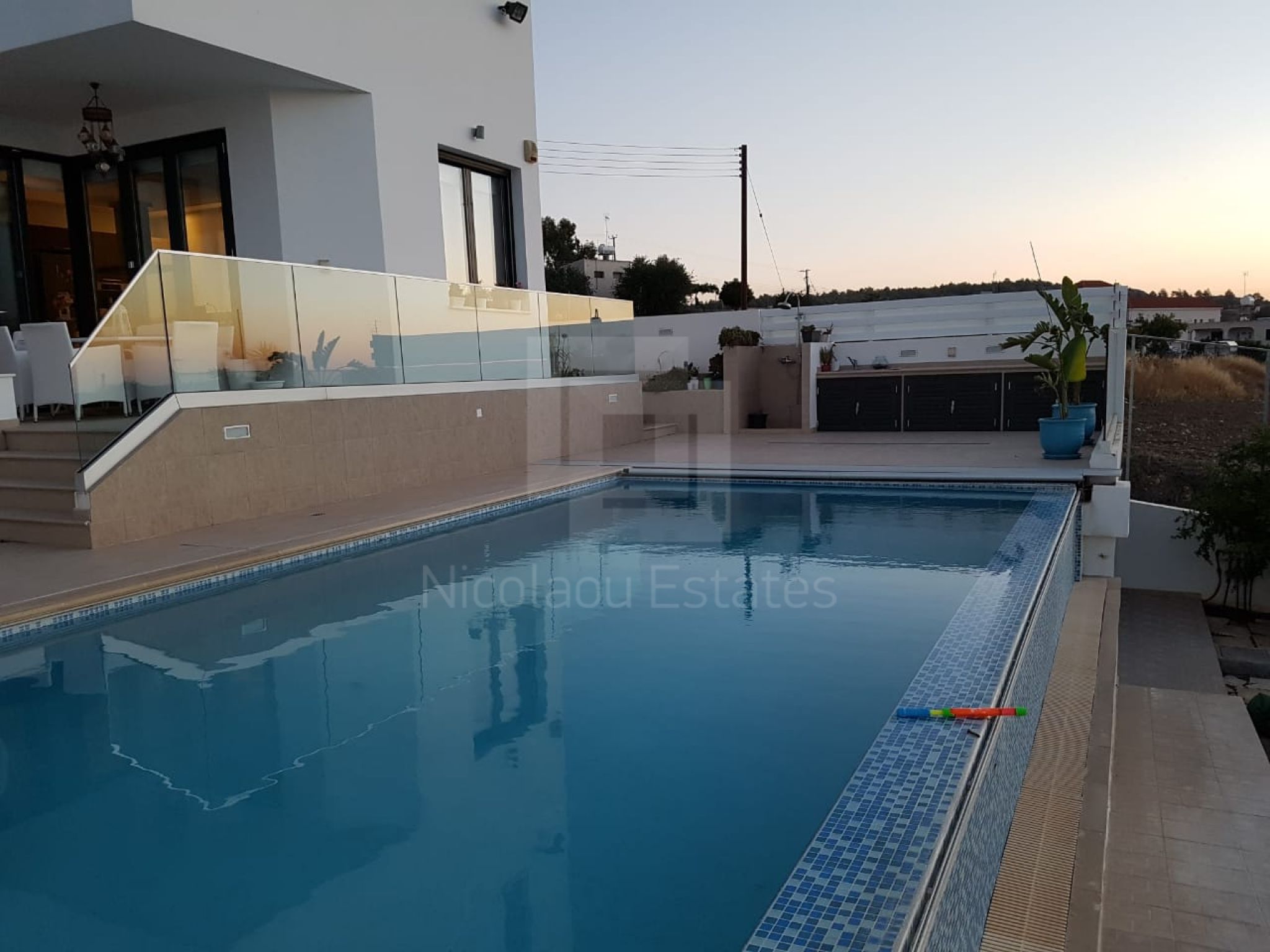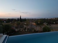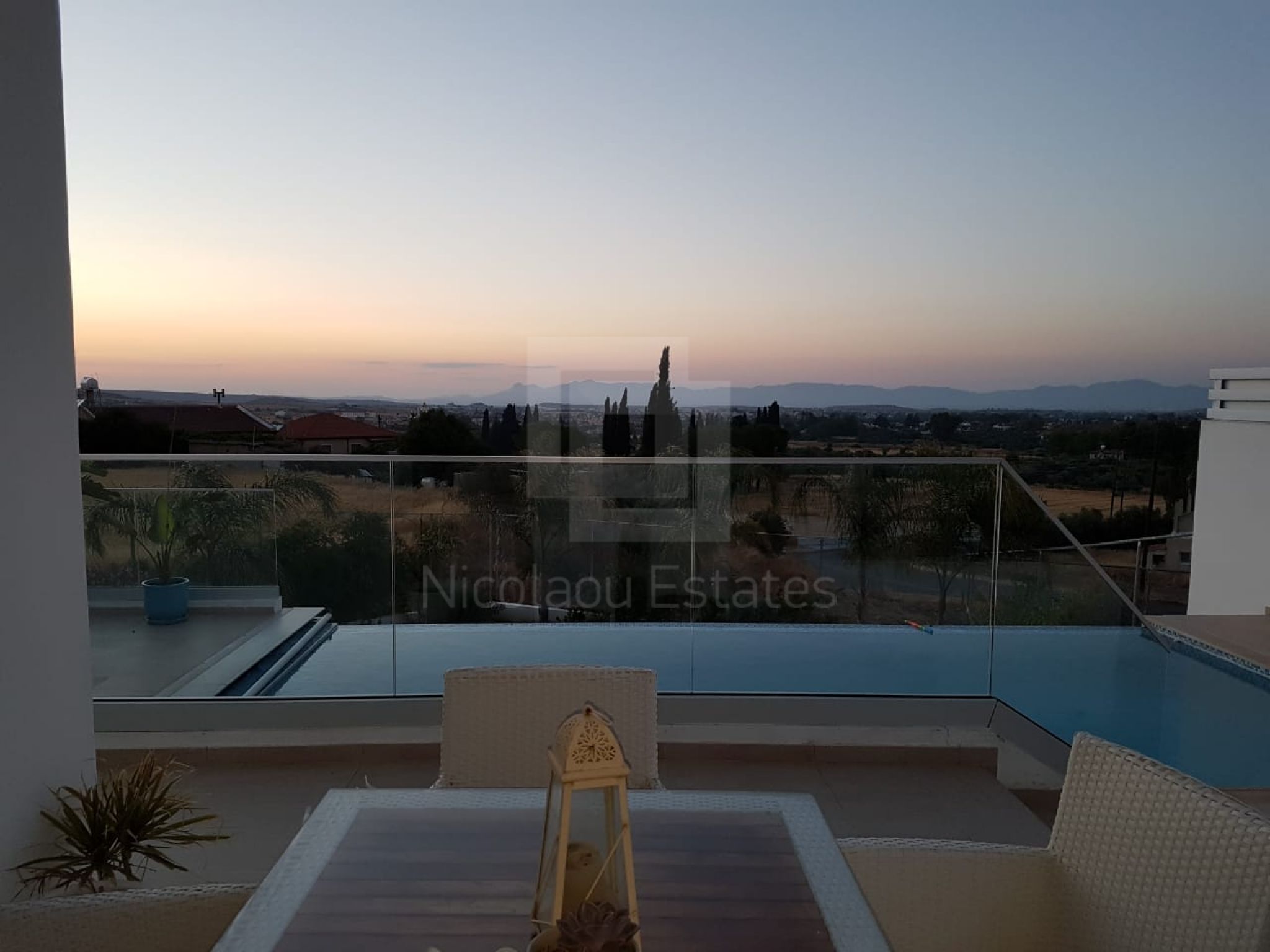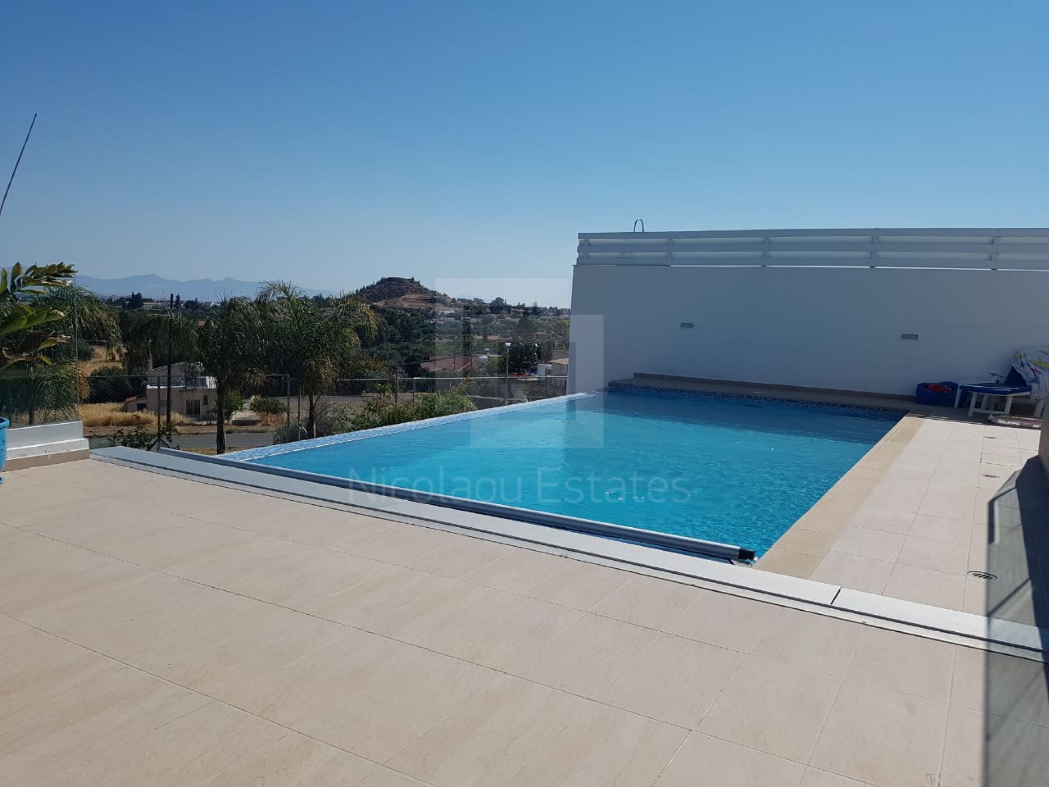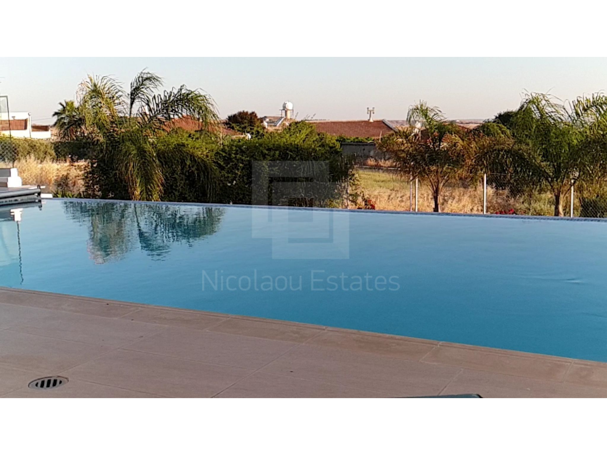 It's build on a hill with spectacular views of Nicosia and the Politiko Russian church in the distance. Totally detached. Automatic irrigation, water flow pool, Central Daikin AC, underfloor heating. Mielle kitchen, including all electrical appliances (coffee machine etc) and furniture/cupboards as well. Thick soundproof and heat proof aluminium.