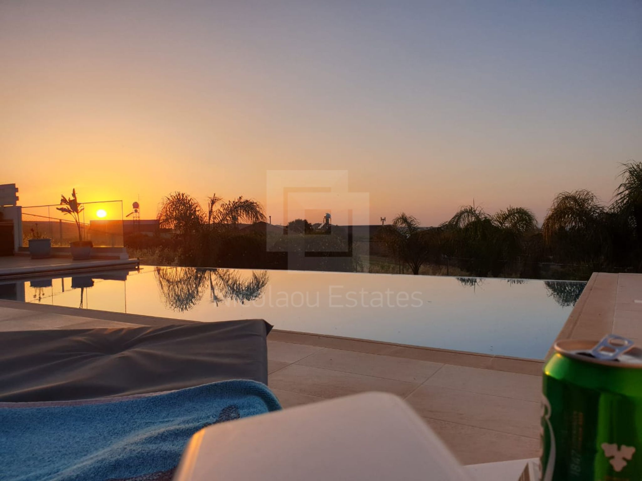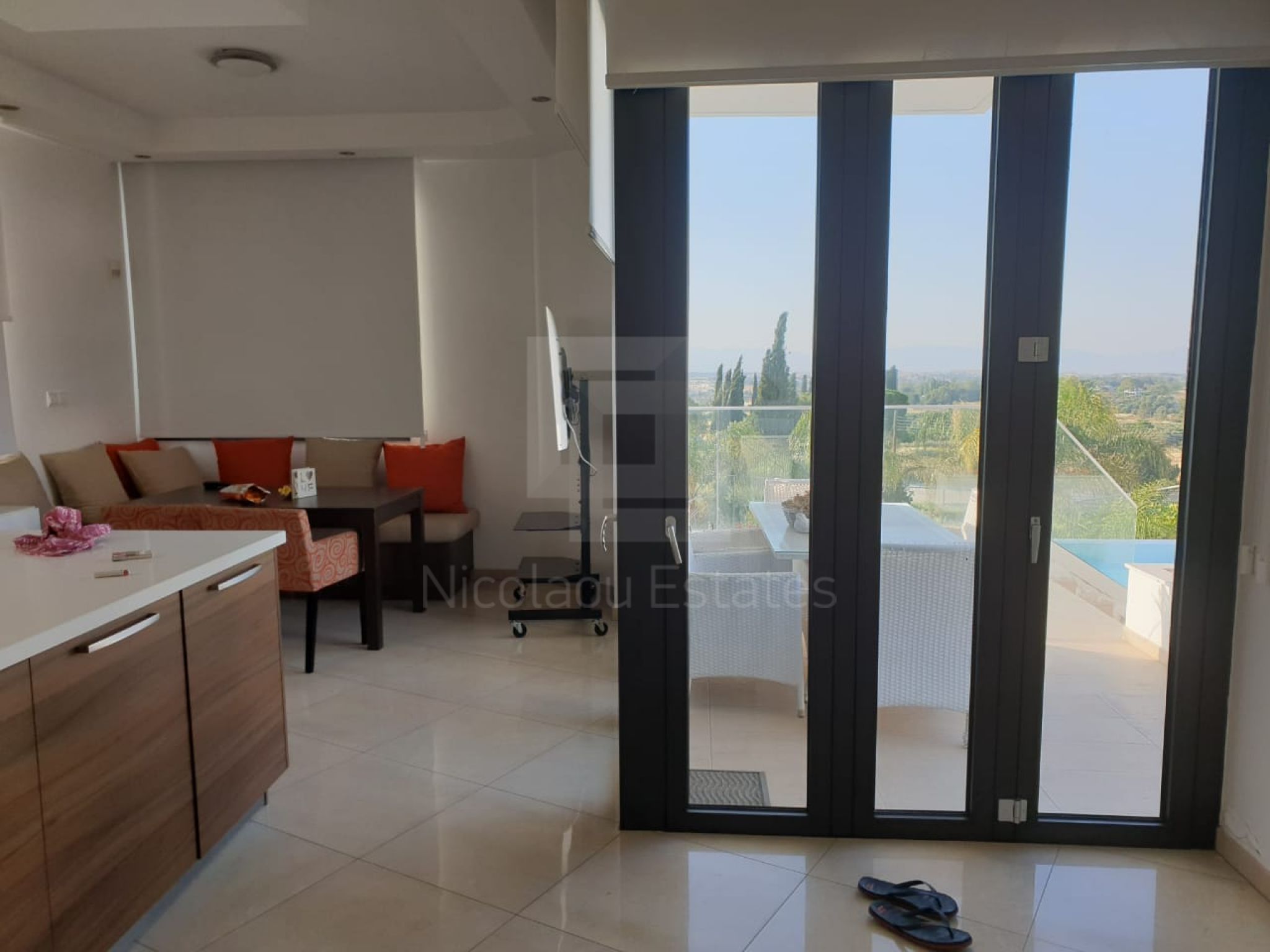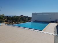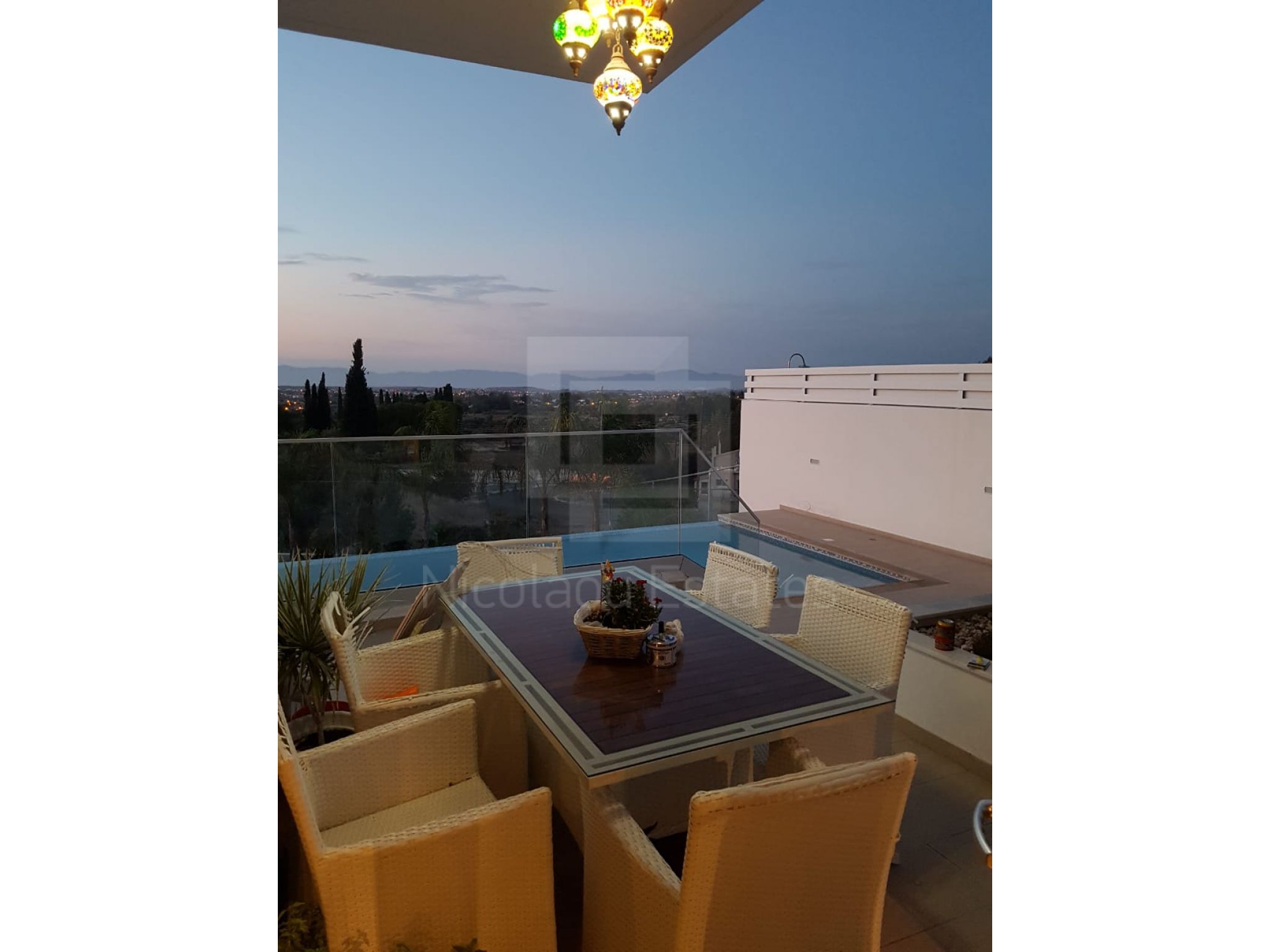 It's build on a hill with spectacular views of Nicosia and the Politiko Russian church in the distance. Totally detached. Automatic irrigation, water flow pool, Central Daikin AC, underfloor heating. Mielle kitchen, including all electrical appliances (coffee machine etc) and furniture/cupboards as well. Thick soundproof and heat proof aluminium.