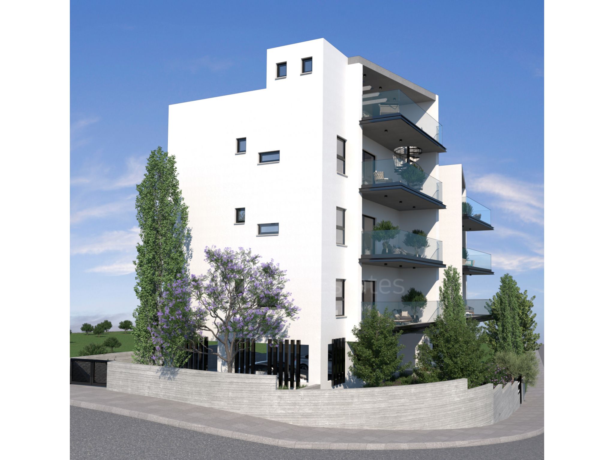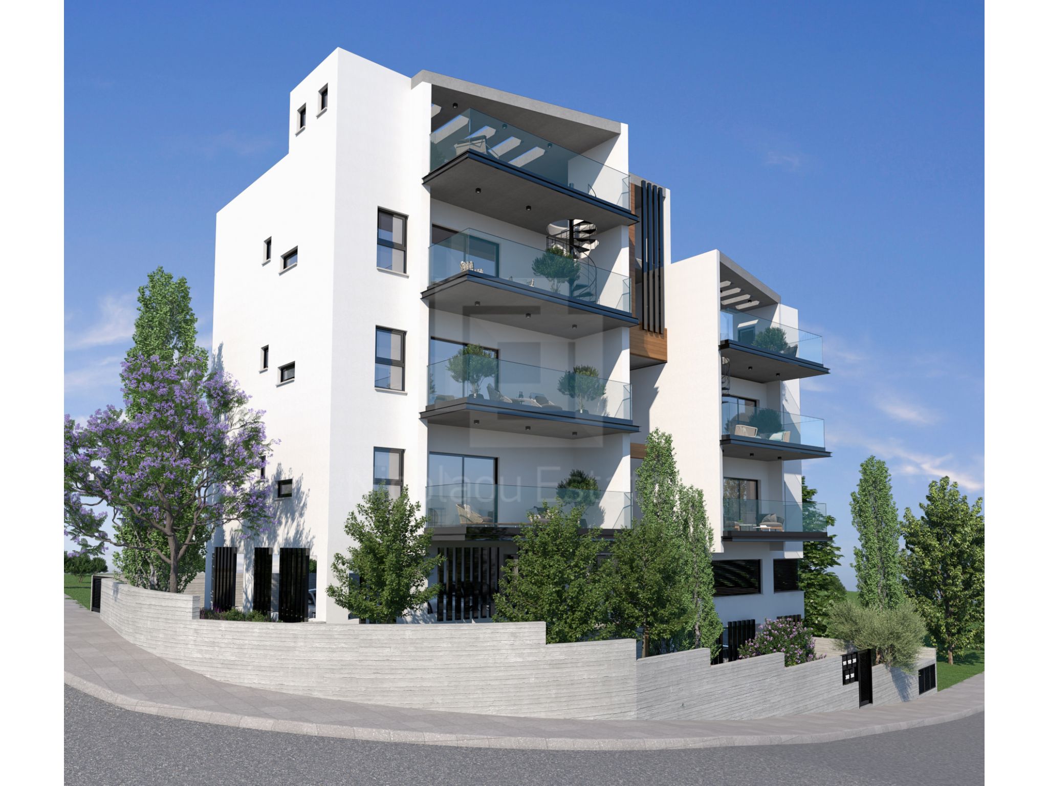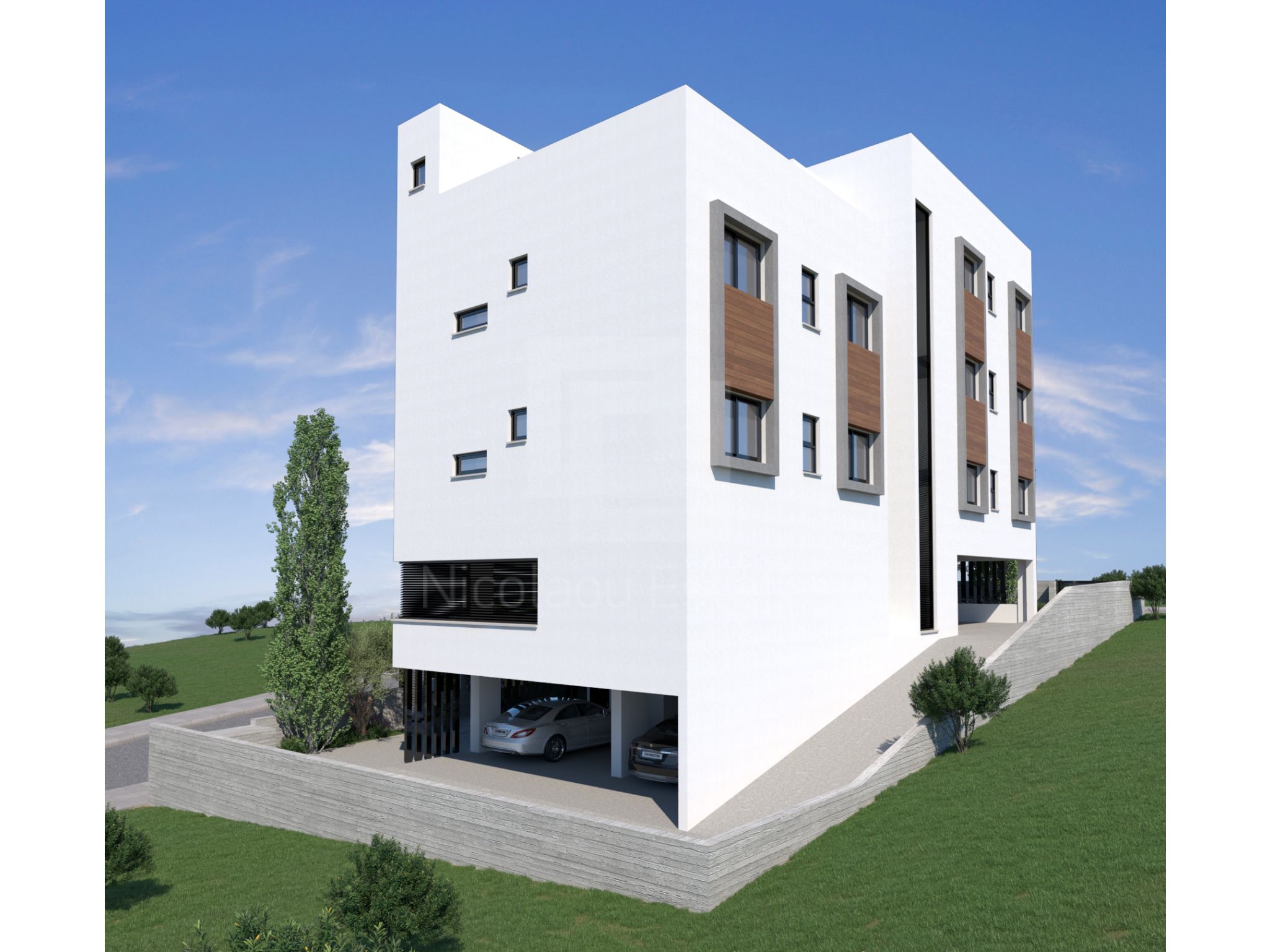 This modern building occupies a corner location next to the private GRAMMAR SCHOOL with panoramic view to the surrounding areas and the city of Limassol. It is characterized by a minimal design and stands out due to its contemporary features.