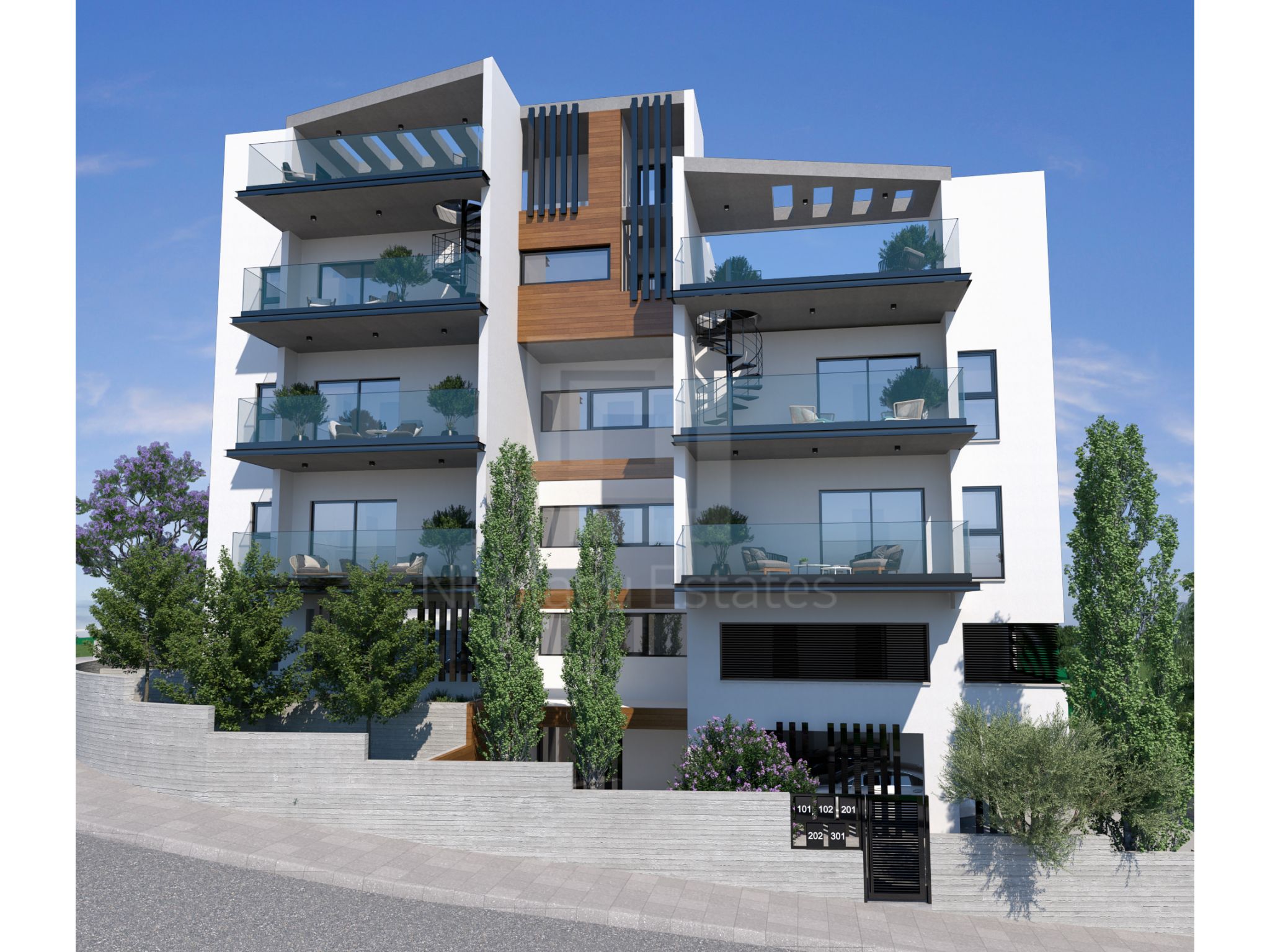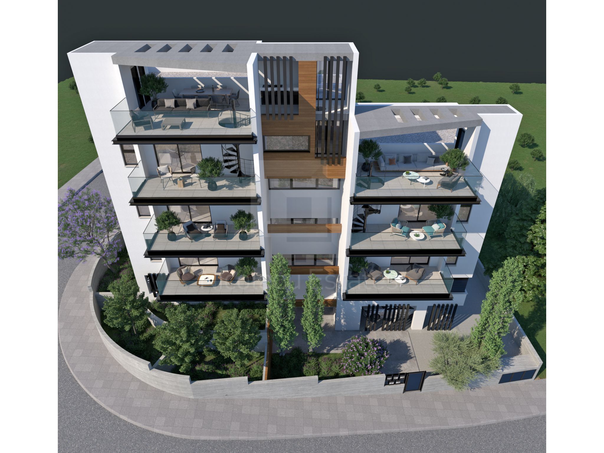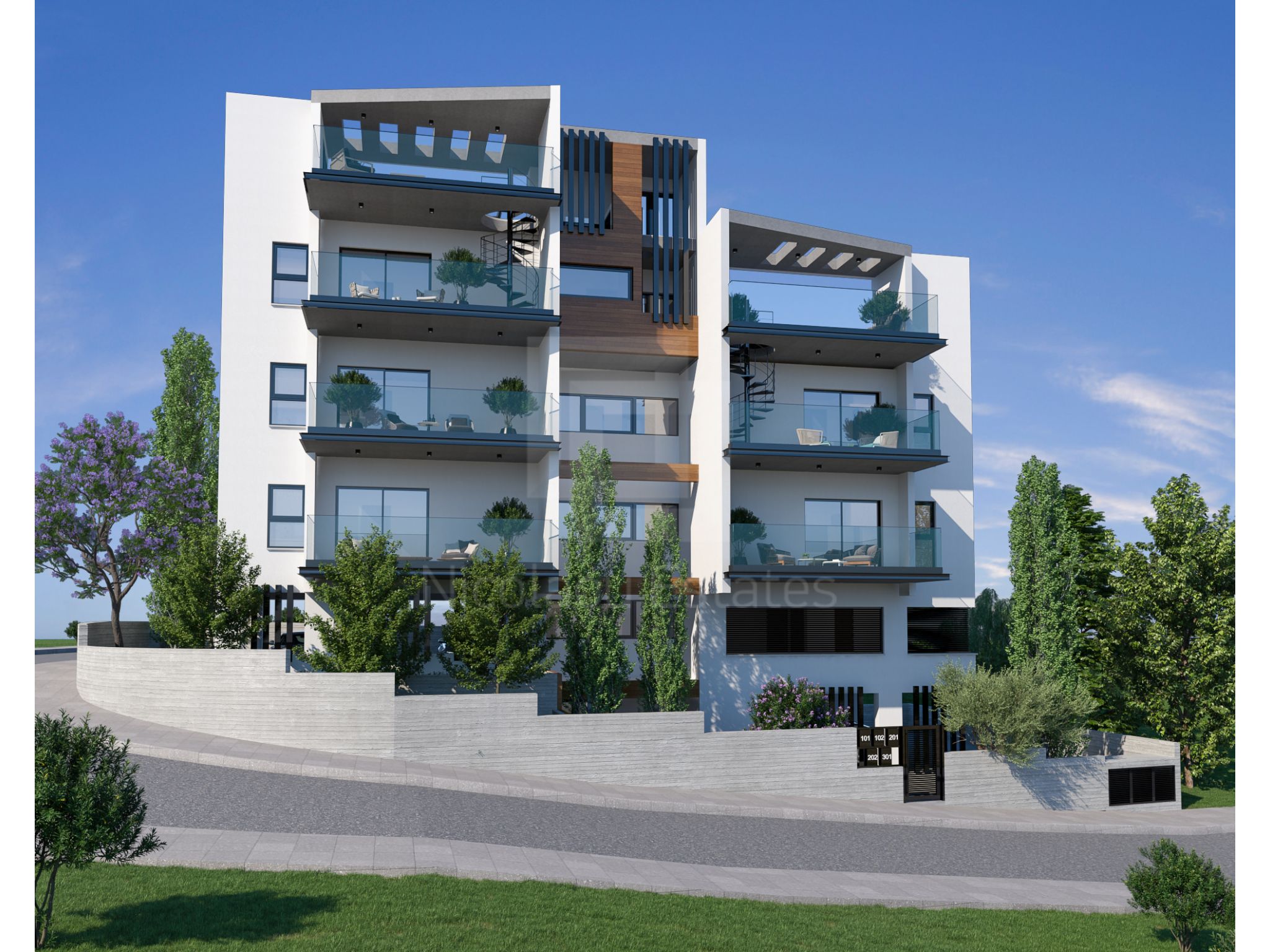 This modern building occupies a corner location next to the private GRAMMAR SCHOOL with panoramic view to the surrounding areas and the city of Limassol. It is characterized by a minimal design and stands out due to its contemporary features.