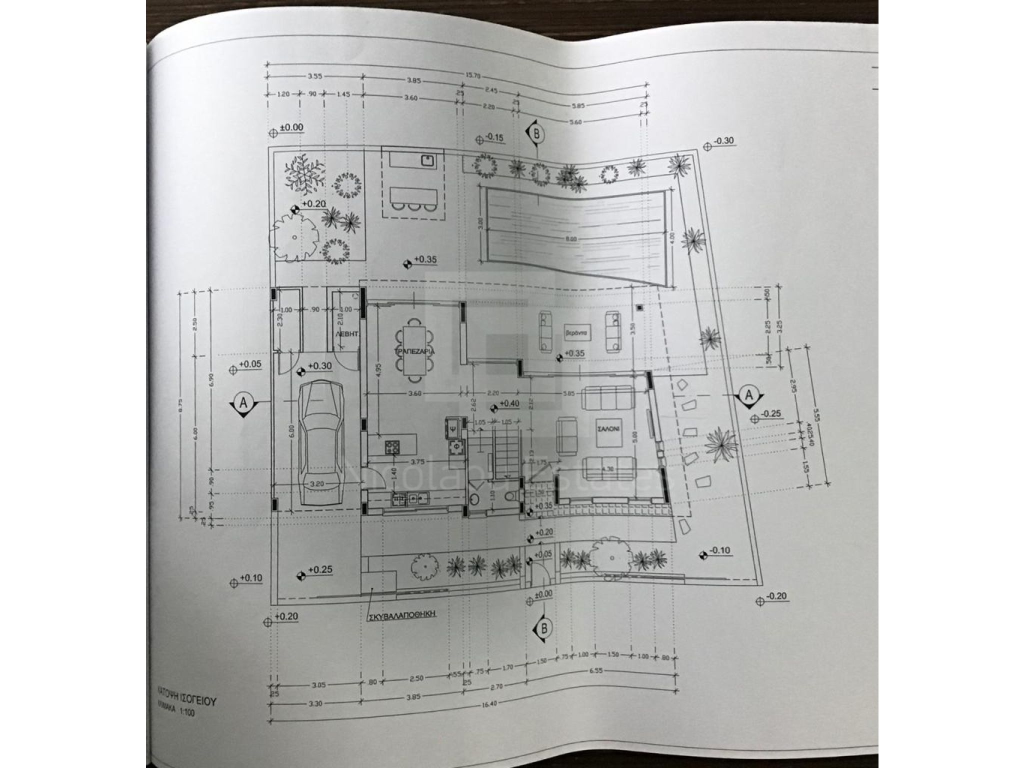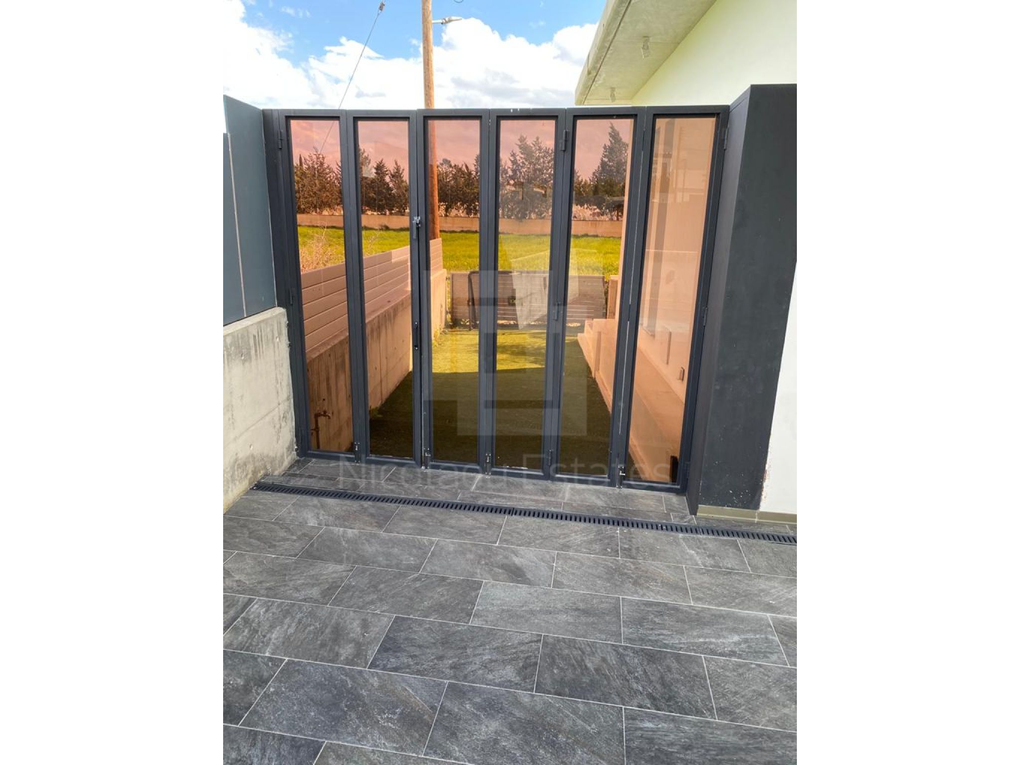 Εξωτερικά υπάρχει μια όμορφη αυλή με μπαρ και μια υπέροχη πισίνα (4 Χ 8 μέτρων) με σύστημα θέρμανσης του νερού, καλυμμένες βεράντες, αποθήκη, καλυμμένο χώρο στάθμευσης και μια όμορφη αυλή με γρασίδι. Ολόκληρη η αυλή είναι περίπου 150 m2. Στην οροφή υπάρχει χώρος για την εγκατάσταση φωτοβολταϊκών πλαισίων.
