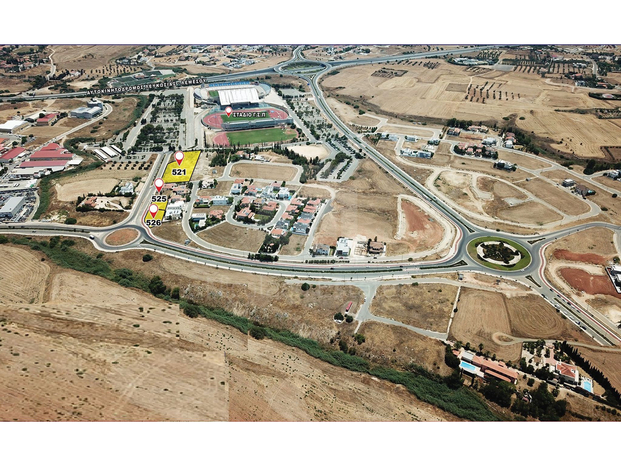 Πωλούνται οικιστικά οικόπεδα σε νεόκτιστη περιοχή, με πολυτελείς κατοικές, πλησίον του νέου γηπέδου Γ.Σ.Π. Σ'αυτά τα οικόπεδα είναι δυνατόν να επιτραπεί η ανέγερση καταστημάτων καθημερινής εξυπηρέτησης, γραφεία, μικρές κλινικές, ιατρεία, νηπιαγωγείο και παιδικός σταθμός.