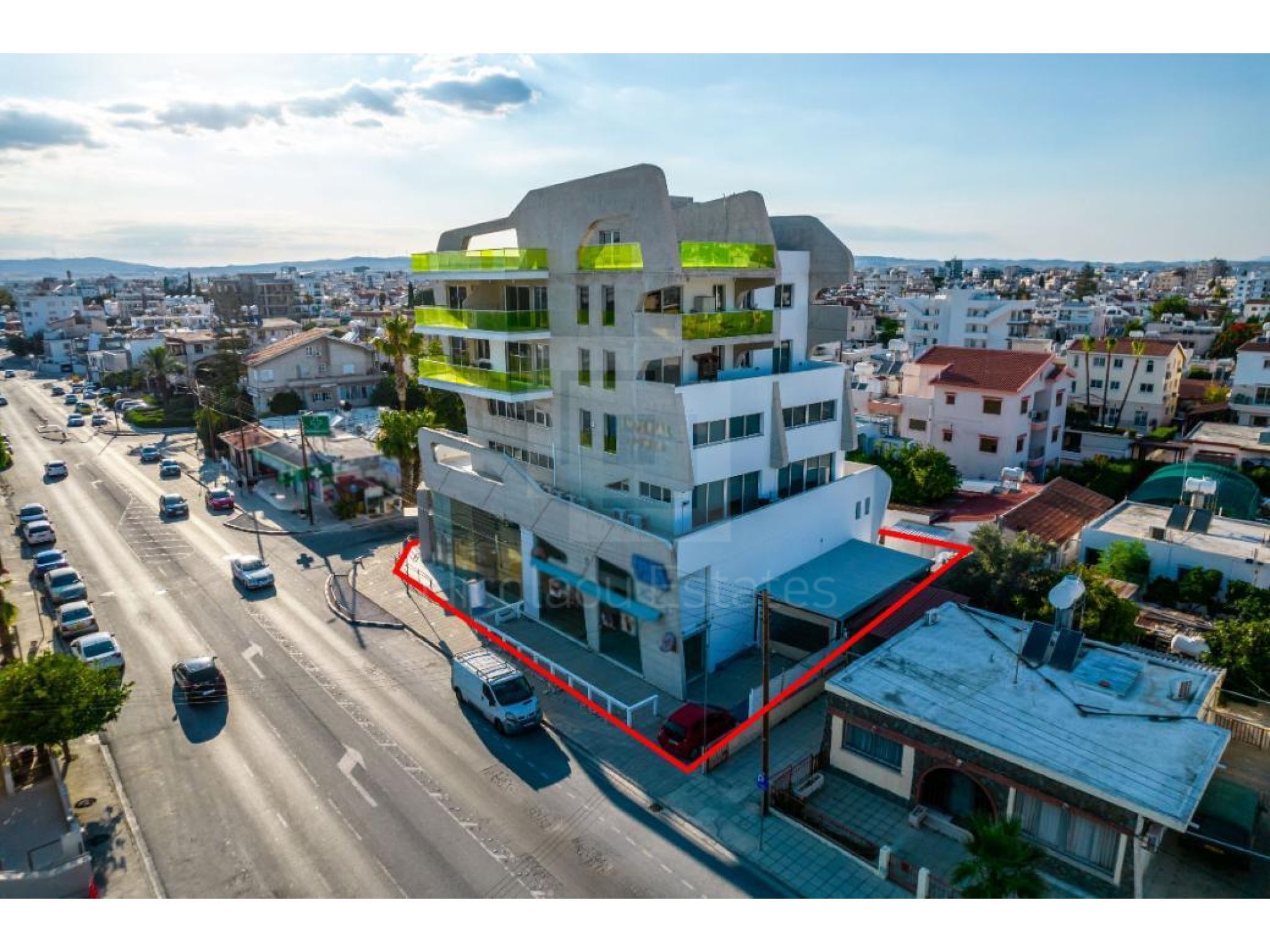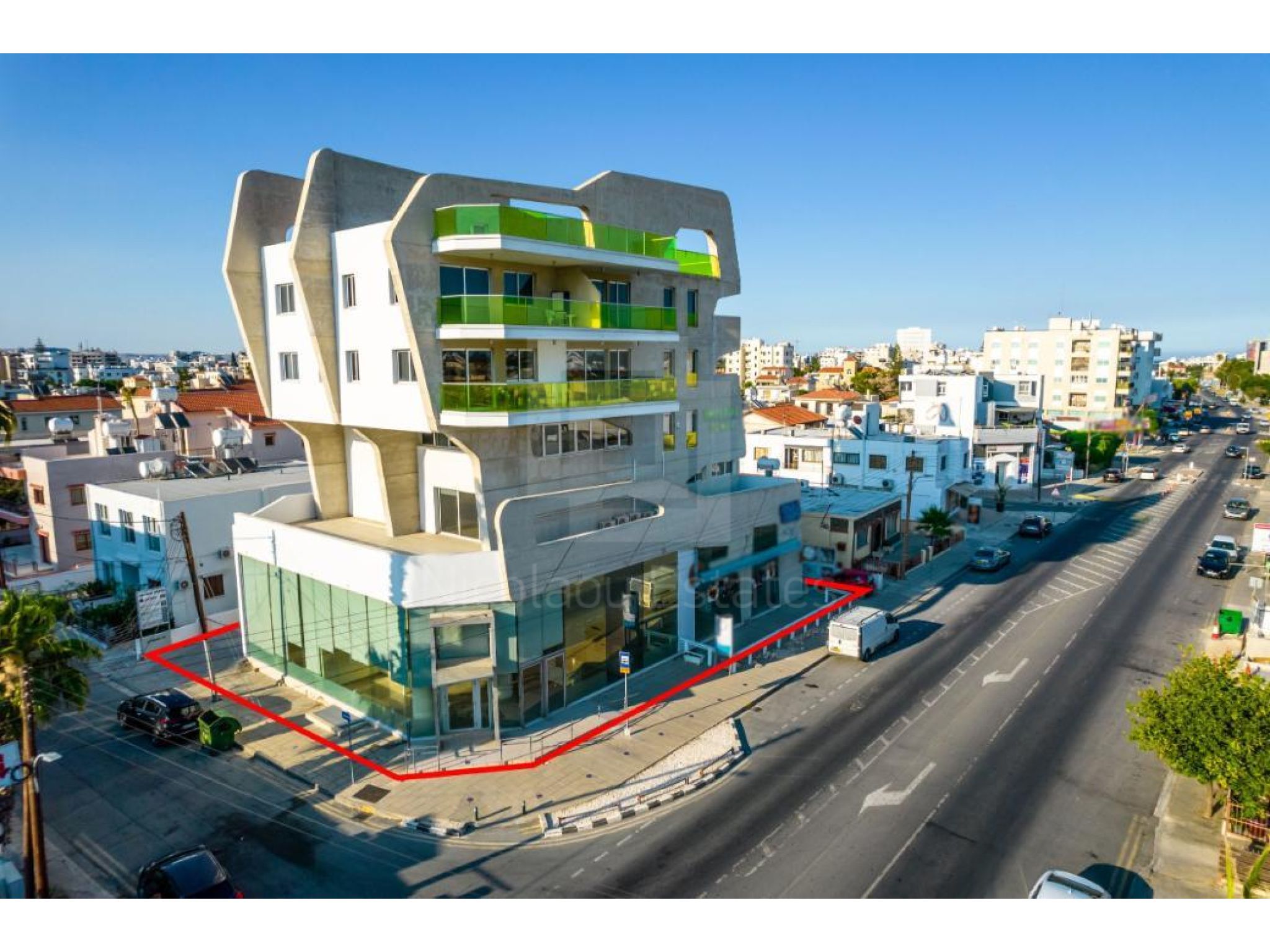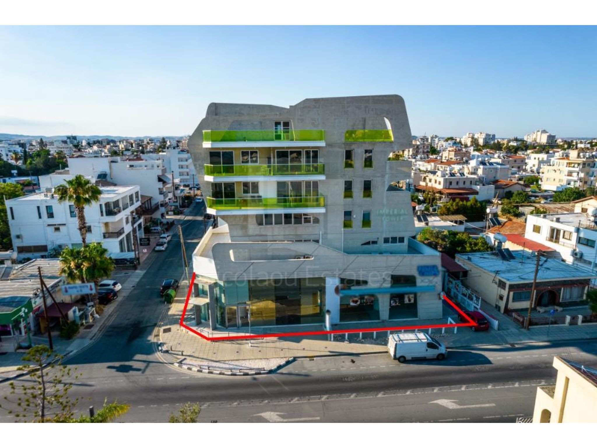 The property is a four storey commercial building named “Imperial Court” in Agios Nicolaos quarter, Larnaca. The building is adjacent to Agias Faneromenis avenue and on Macedonia's street. It is located 700m from the junction of Faneromeni and Artemidos avenues. The building has a covered area of 1,440sqm, a mezzanine of 225sqm, a basement of 650m and 170sqm uncovered verandas. It consists of 2 shops on the ground floor, 6 apartments and 2 offices on the upper floors. It offers close proximity to all amenities and excellent access to Larnaca's city center. The property is partly occupied.