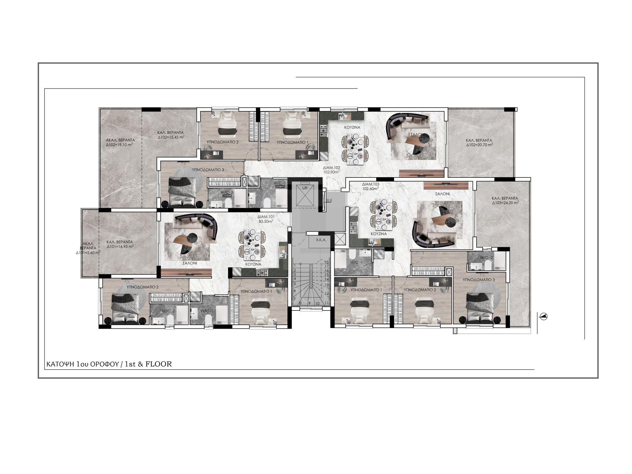 Αυτό το διαμέρισμα βρίσκεται στον 1ο όροφο και αποτελείται από το σαλόνι με τραπεζαρία και ενιαίου τύπου κουζίνα, δύο υπνοδωμάτια και δύο μπάνια (το ένα στο κυρίως υπνοδωμάτιο).