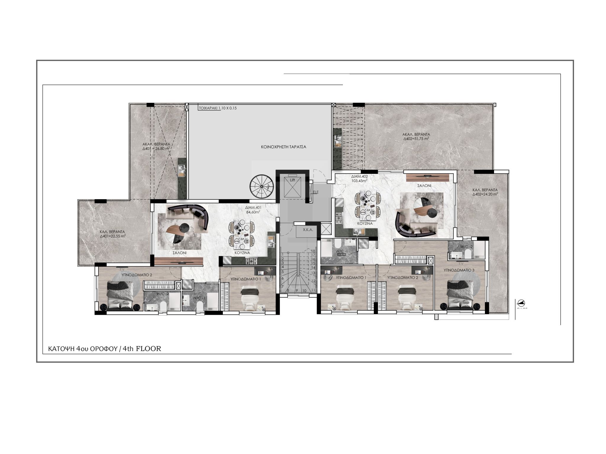 - 22,55 τ.μ. καλυμμένη βεράντα συν 26,80 τ.μ. ακάλυπτη βεράντα