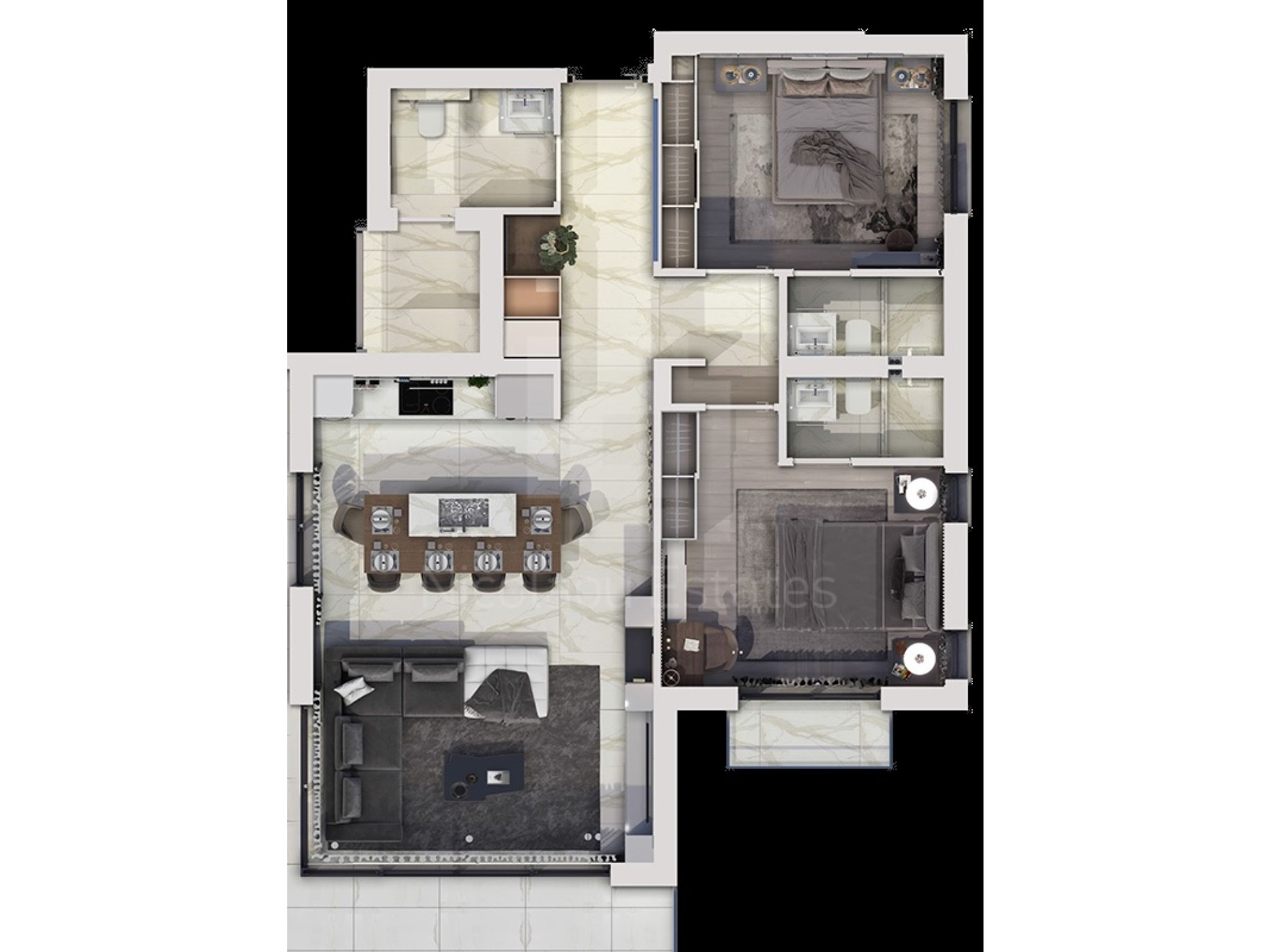 This apartment is on the first floor and consists of a living room with dining area and open plan kitchen, a guest wc, two bedrooms and two bathrooms. It comes also with 45 sq.m. covered veranda, 1 parking space and storage.