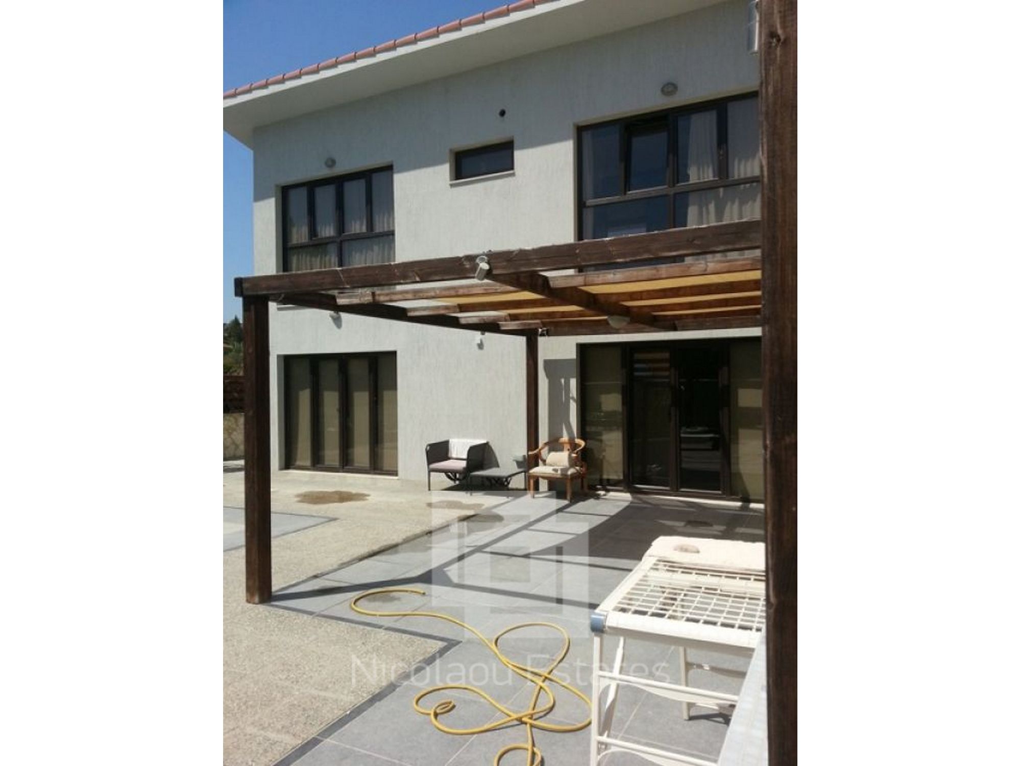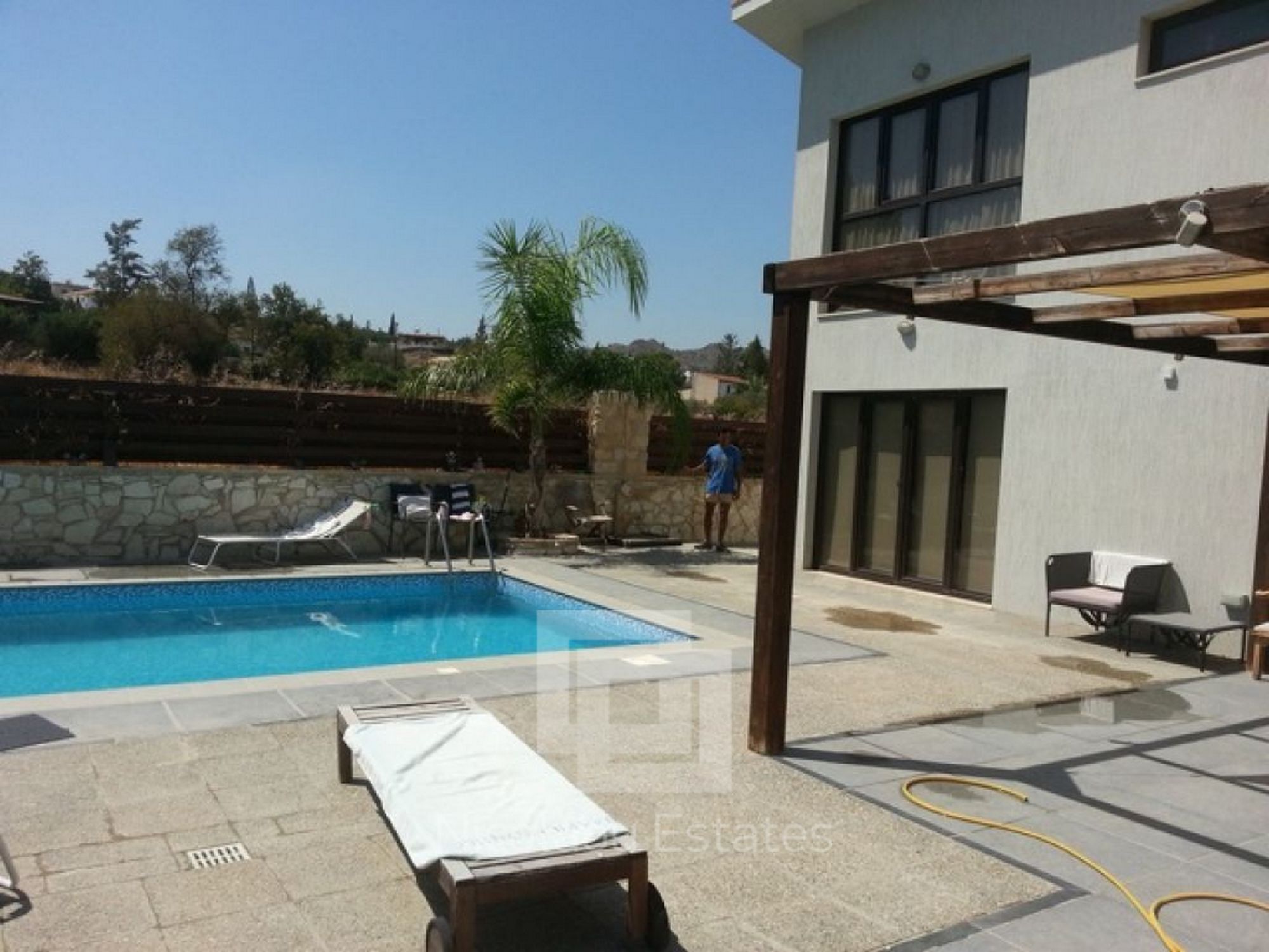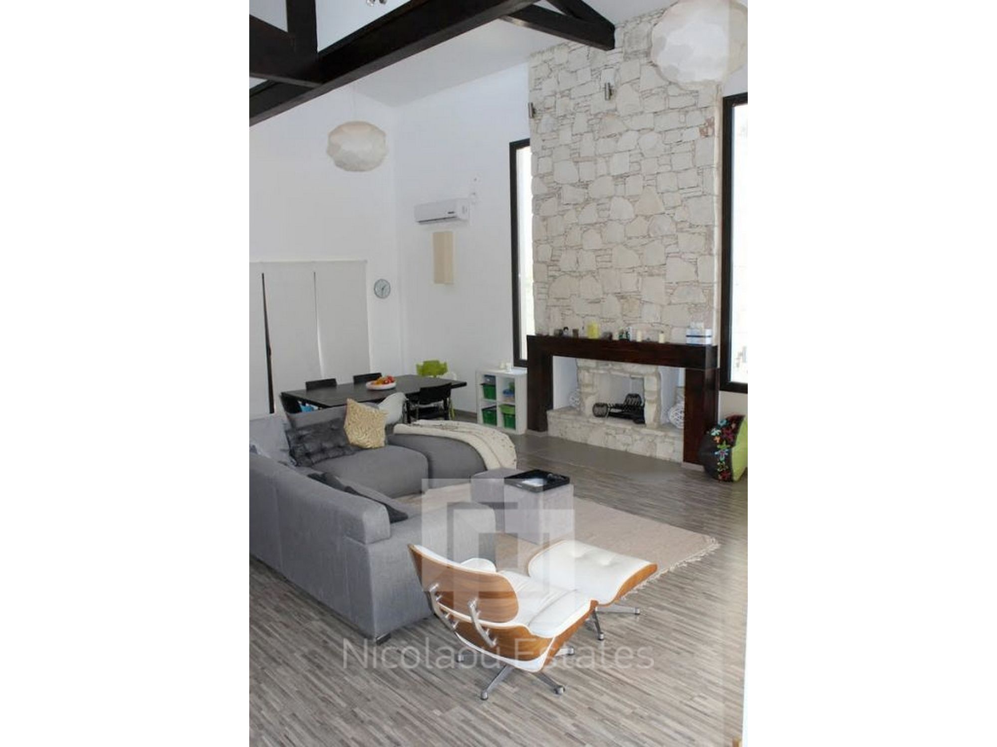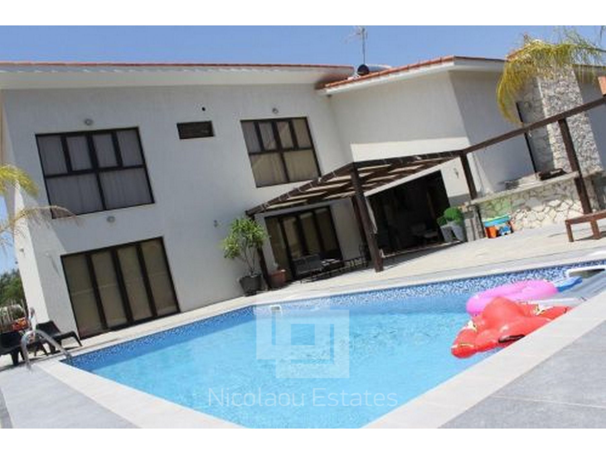 A beautiful, contemporary, modern designed house. Three double bedrooms with ensuite bathrooms, walk in wardrobe, guest WC, large spacious kitchen with all appliances, utility room and spacious lounge. Lots of unique design features. All rooms have AC and wireless internet. Has a great outdoor space for dining and an 8x4 metre swimming pool and shower. Great location with mountain views walking distance to 2 fantastic tavernas, a modern coffee shop, supermarket, park, 5 mins drive from St Raphael beach and beach cafes. Eco built house, cool in summer warm in winter low electricity bills on a large plot.