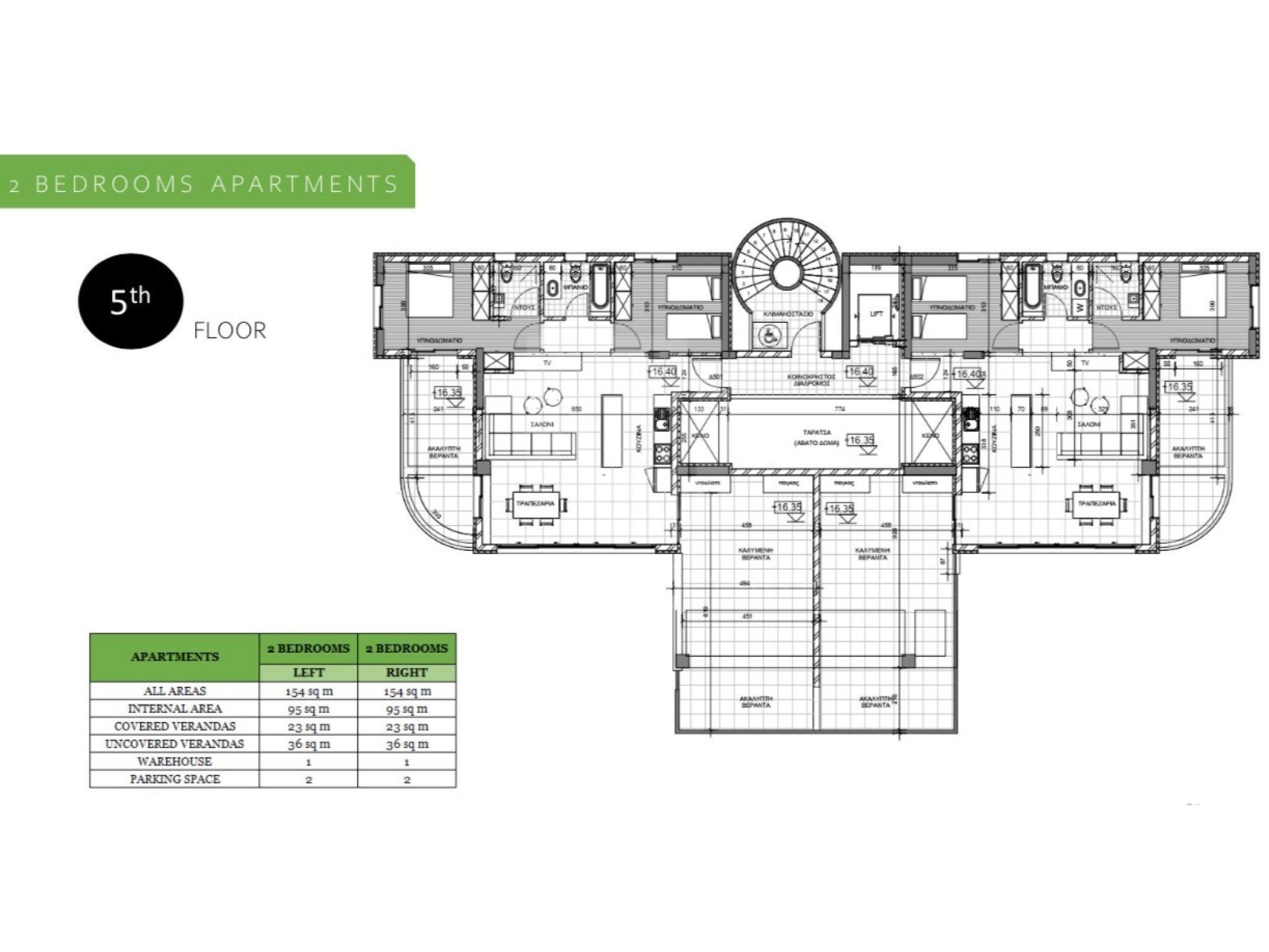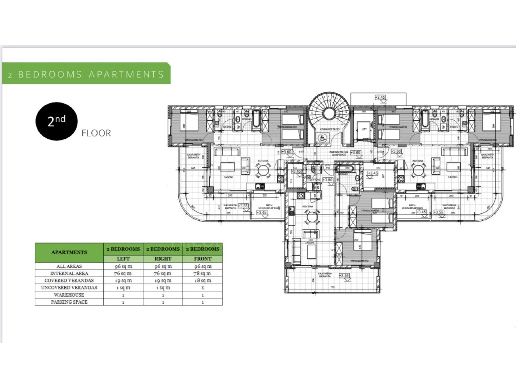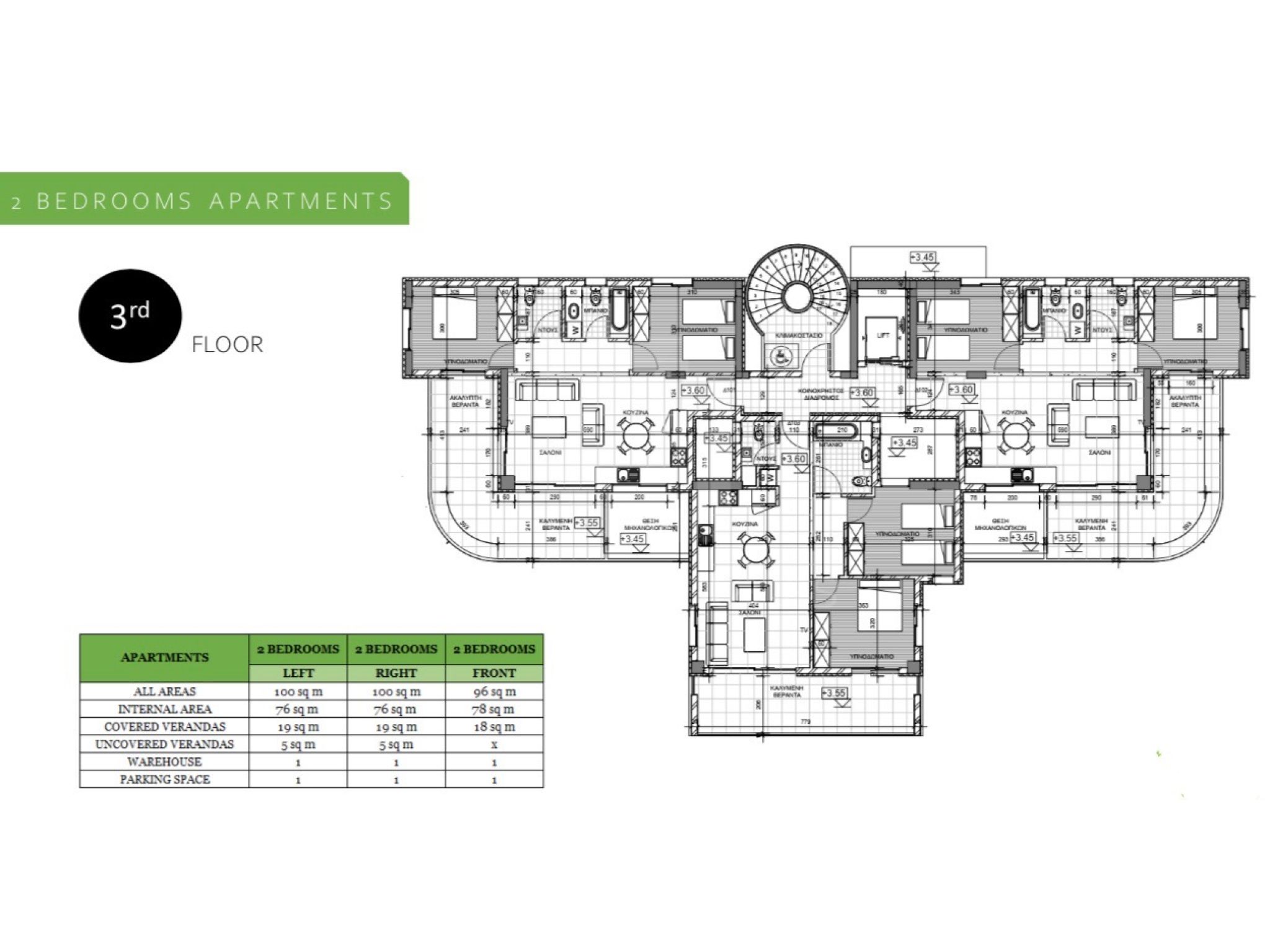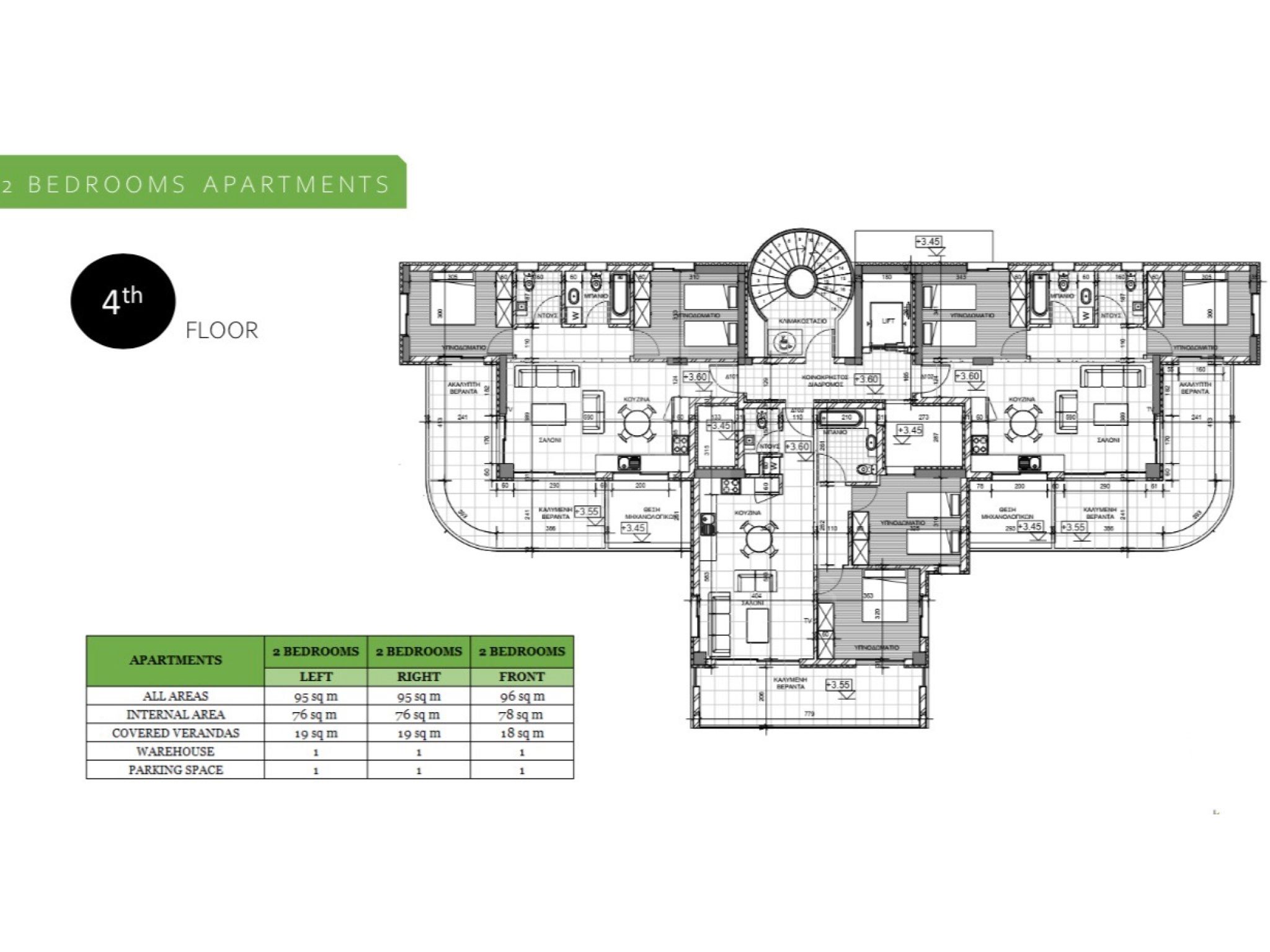 - Διαμέρισμα 402 (247.000 ευρώ συν ΦΠΑ): 76τμ εσωτερικός χώρος, 19τμ καλυμμένη βεράντα, 1 καλυμμένος χώρος στάθμευσης και 1 αποθήκη.