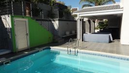 One enters the house into an entrance hall and a very large living/ entertainment area leading out onto the pool and patio and BBQ area.The kitchen is very spacious, modern and comes fully equipped and also leads out onto the pool area.There is also a bedroom with en suite shower room and there is a guest WC.