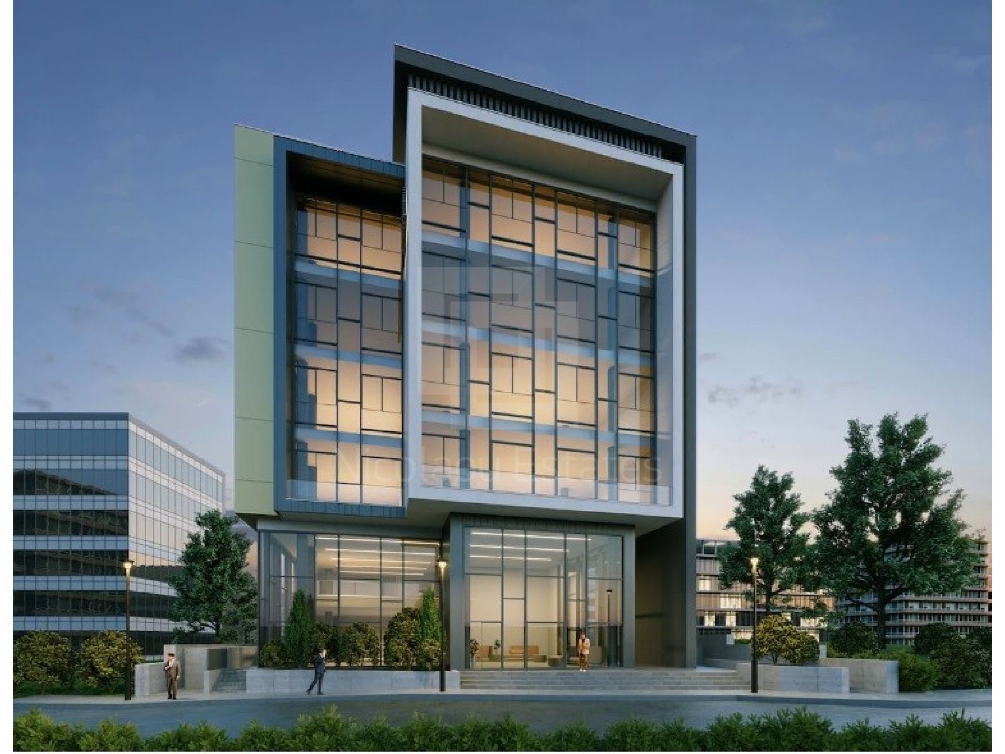 The residential zone offers 16 apartments. The commercial development features a fourth-floor building with 5 modern offices, each occupying its own floor and boasting contemporary layout spaces.