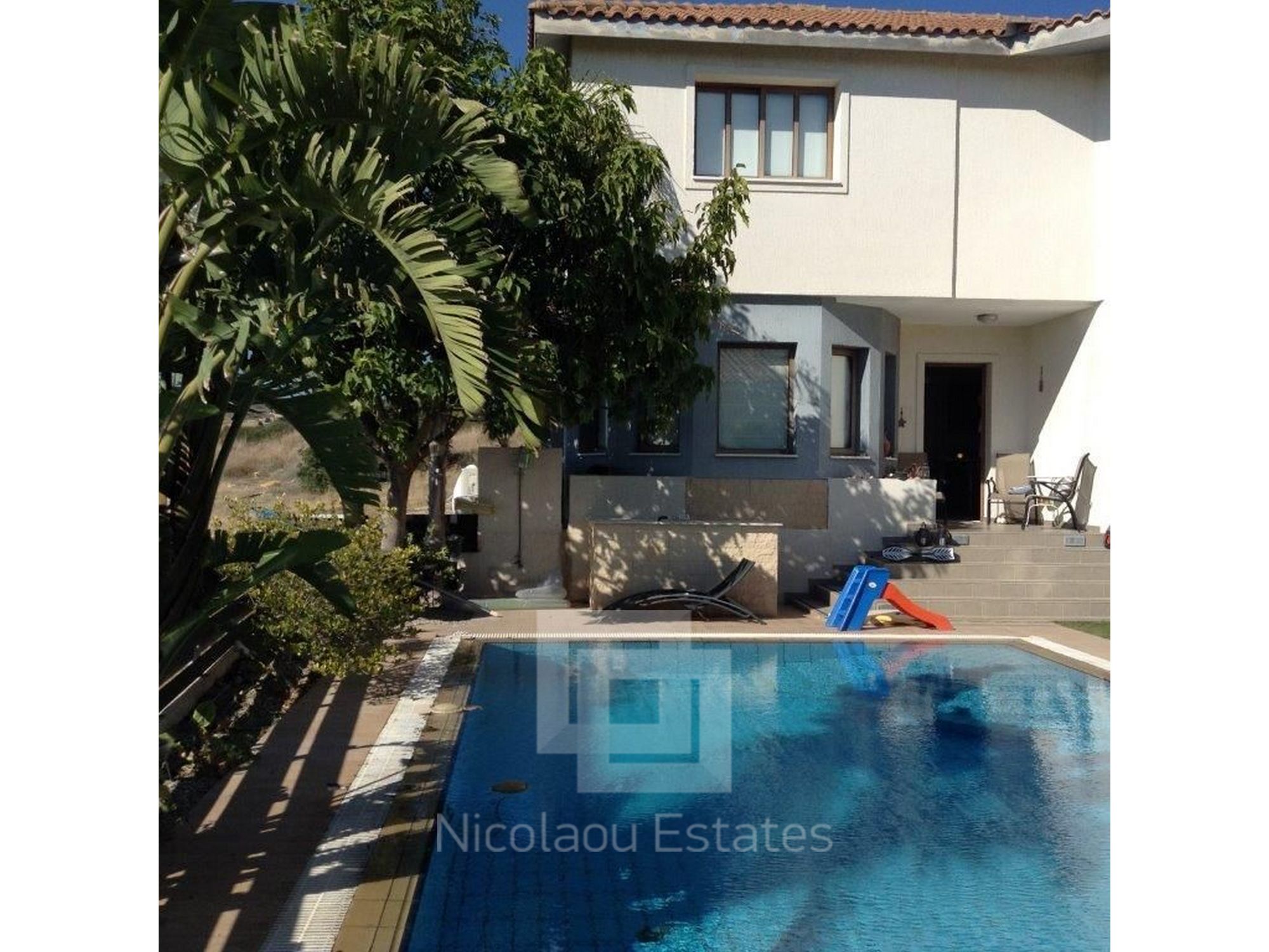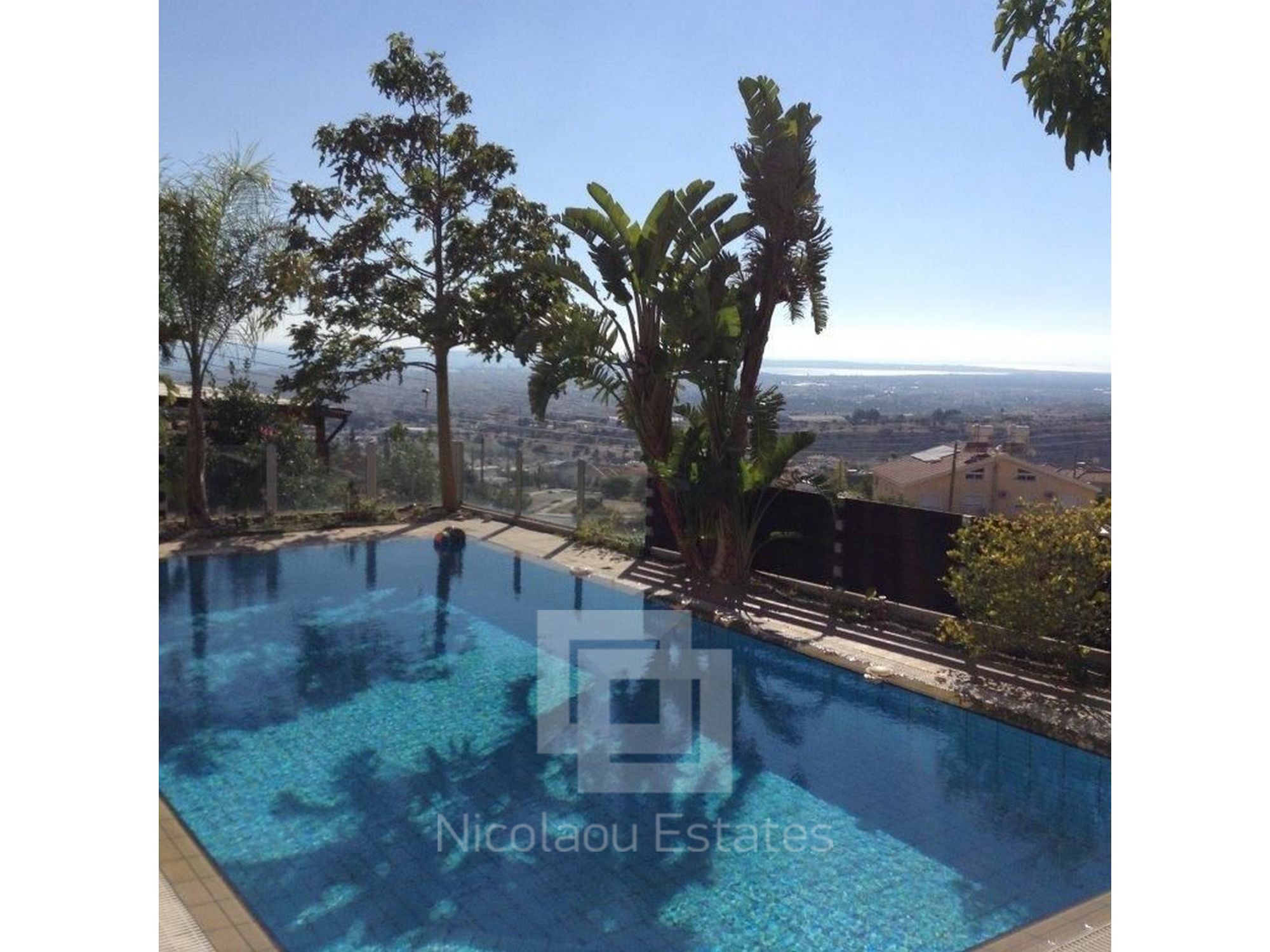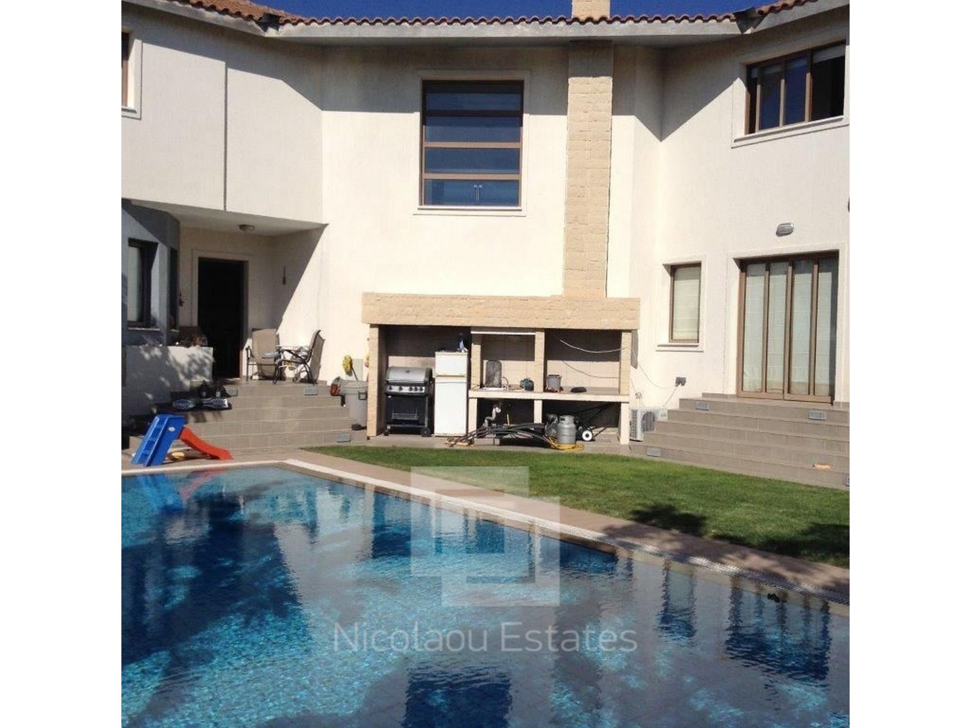 The house is located at Ayia Fyla and is 470m2 the house and 548m2 the land, 4 bedrooms with 2 en-suit showers with bathroom, 2 wc the, one with bath, kitchen, 2 living rooms, dining room, basement, garage, swimming pool 5x10 overflow, full A/C, Full central heating, BBQ, Fire Place, 2 terrace, garden.