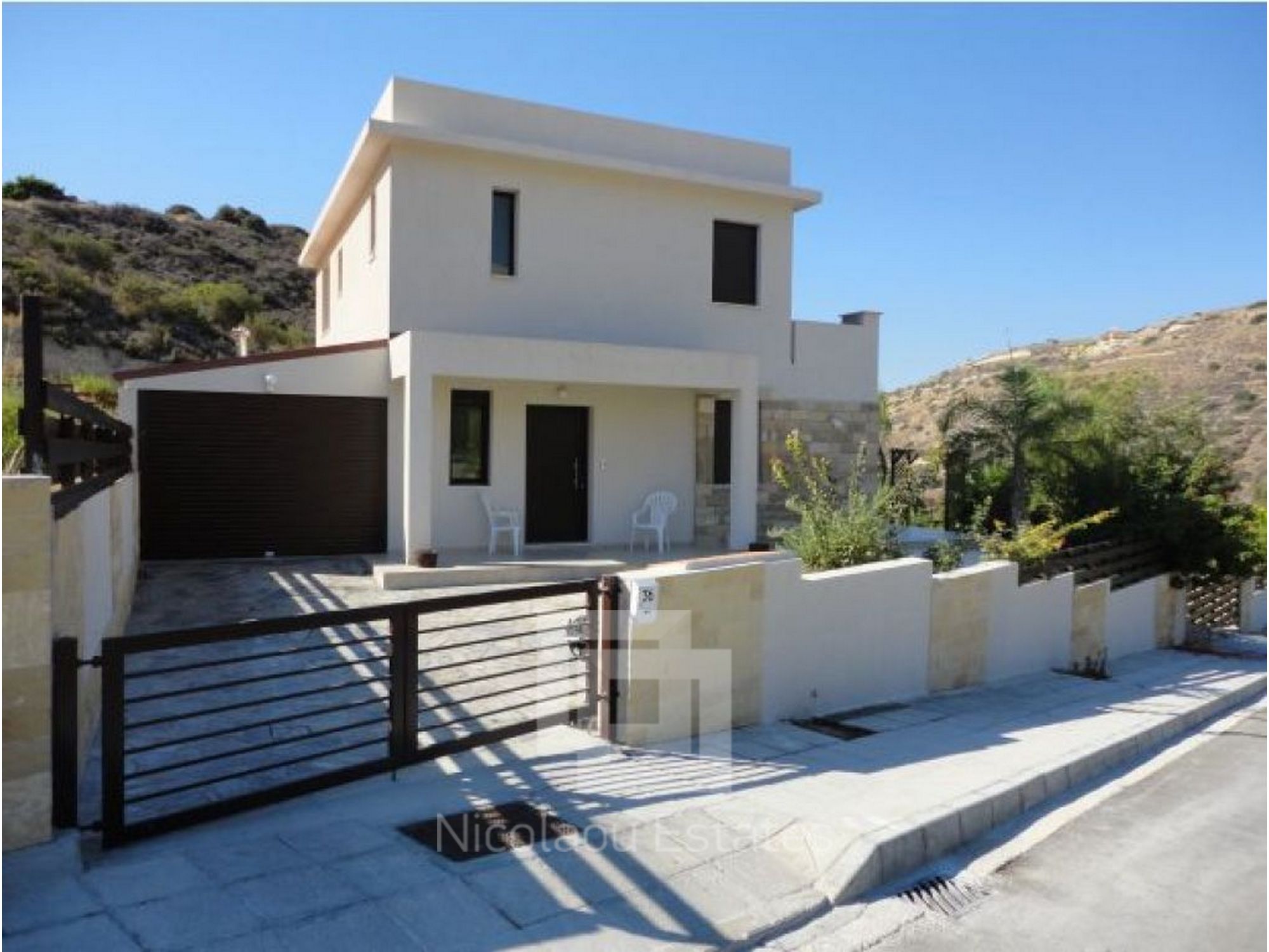 A new detached luxury villa with landscaped gardens and patios with builtin BBQ, and space for swimming pool.