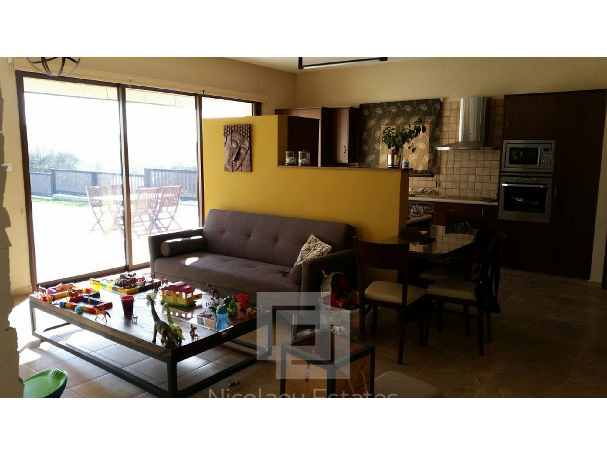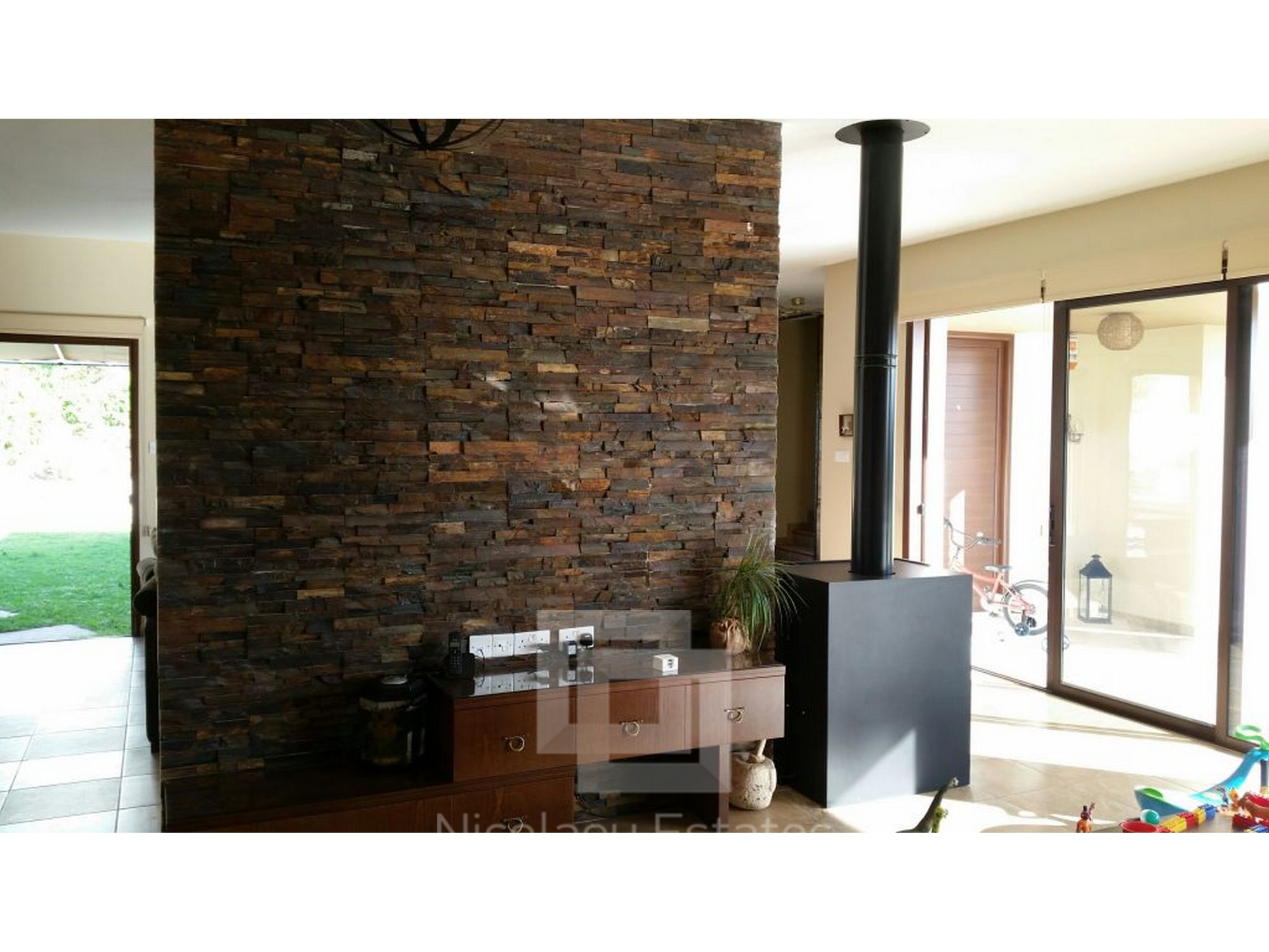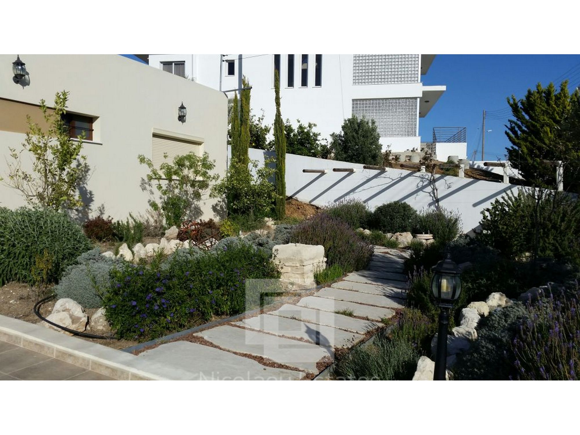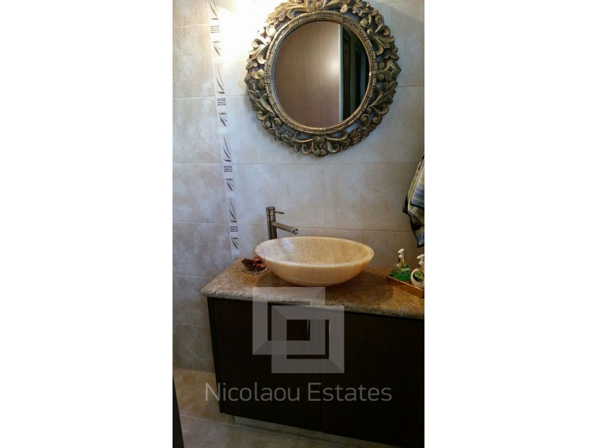 It has 240sq.m covered area and 1001sq.m plot. In the ground floor there is a kitchen, living room/dining room with fire place, guest wc and a laundry room. There is 1 ensuite bedroom with a shower, wardrobe and spacious cabinets. Furthermore there are 3 bedrooms with spacious cabinets, 1 common bathroom and 3 wc, office, and a covered veranda. Outside it has a nice garden with lounge area, with automatic watering system, pergola, 2 covered parking with electric gate.