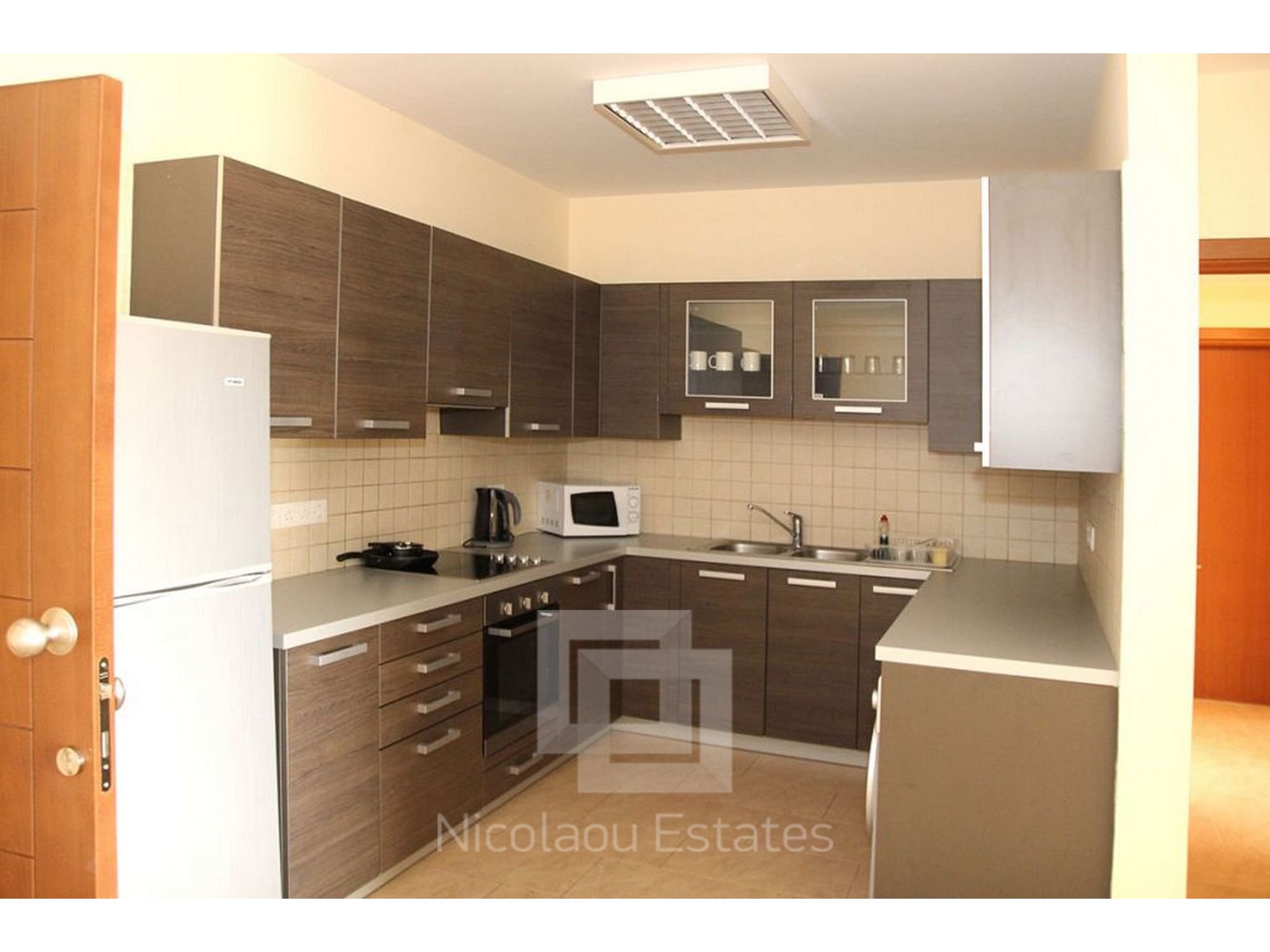 Fully equipped kitchen with built-in appliances, washing machine, fridge