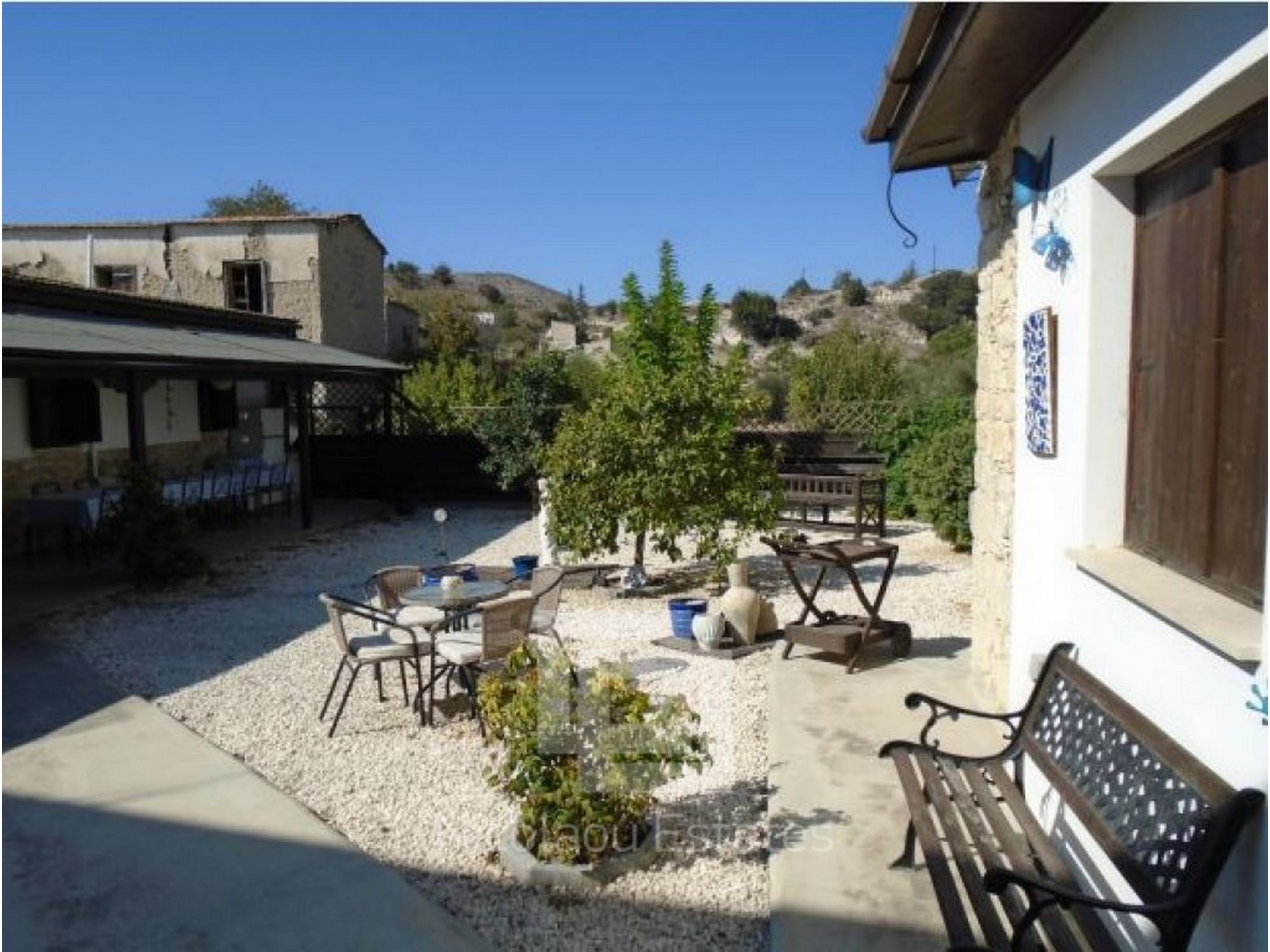 There is driveway and parking, spacious low maintenance garden with space for pool, large covered verandas to front and rear. The spacious square living room has wood burning stove, fitted kitchen, 2 double bedrooms and family bathroom, Guest annex with double bedroom and ensuite bathroom. The property has air condition, ceiling fans and wooden shutters with high ceilings throughout. there is solar hot water. Good broadband internet. The village has coop bank, local shop and coffee shops and is a short drive to the beach.