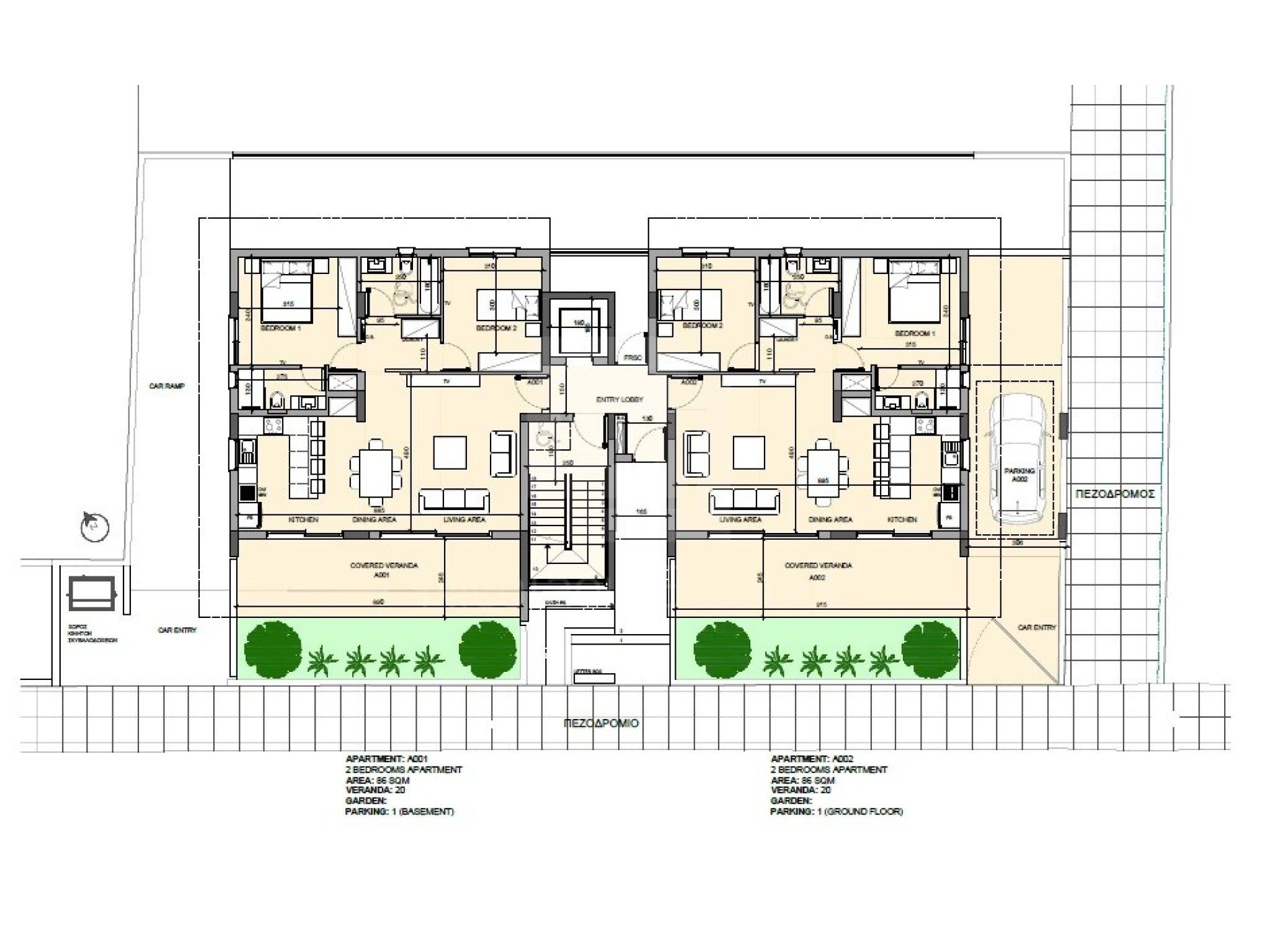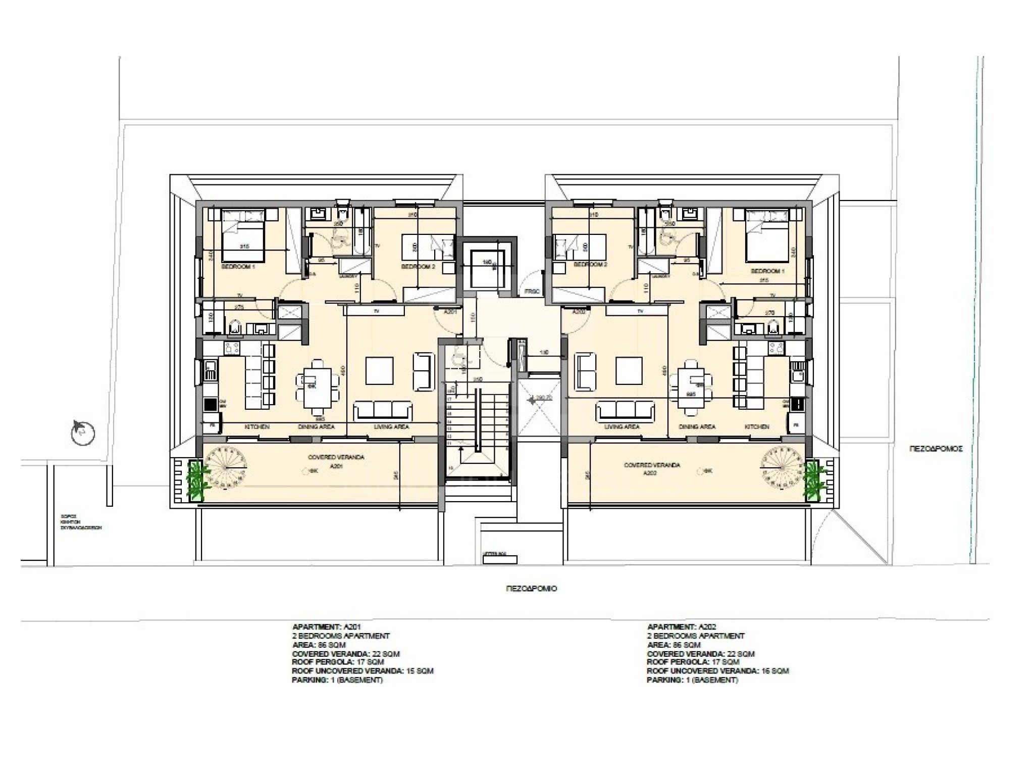 Όλα τα διαμερίσματα έχουν δικό τους χώρο στάθμευσης και αποθήκη.