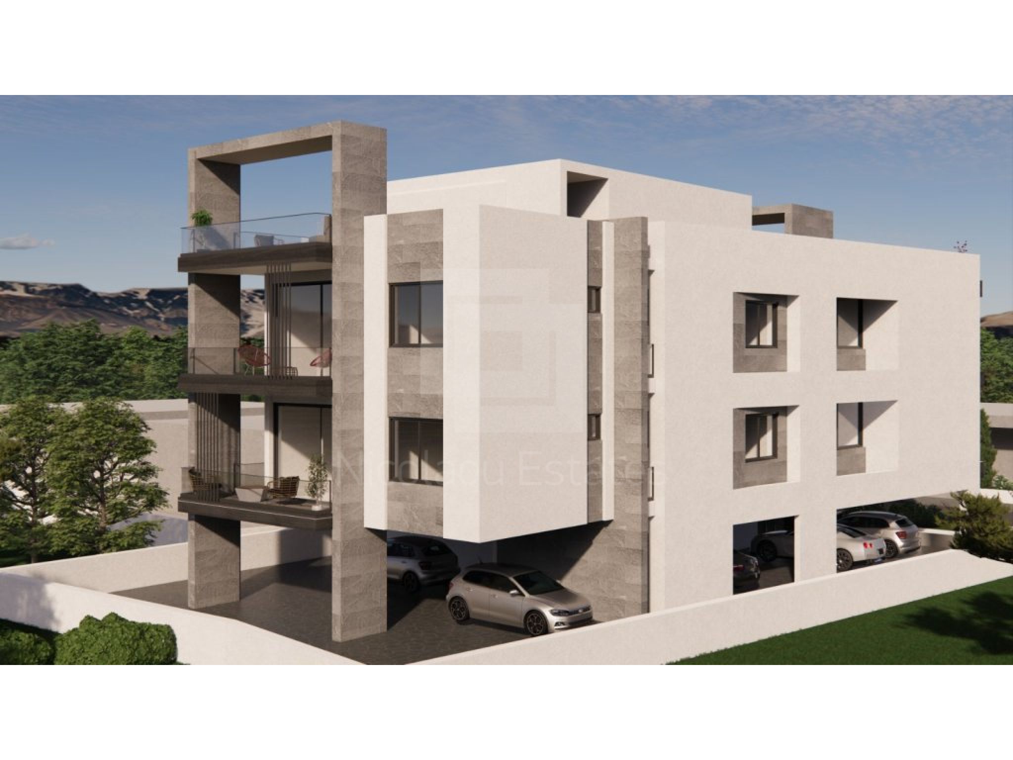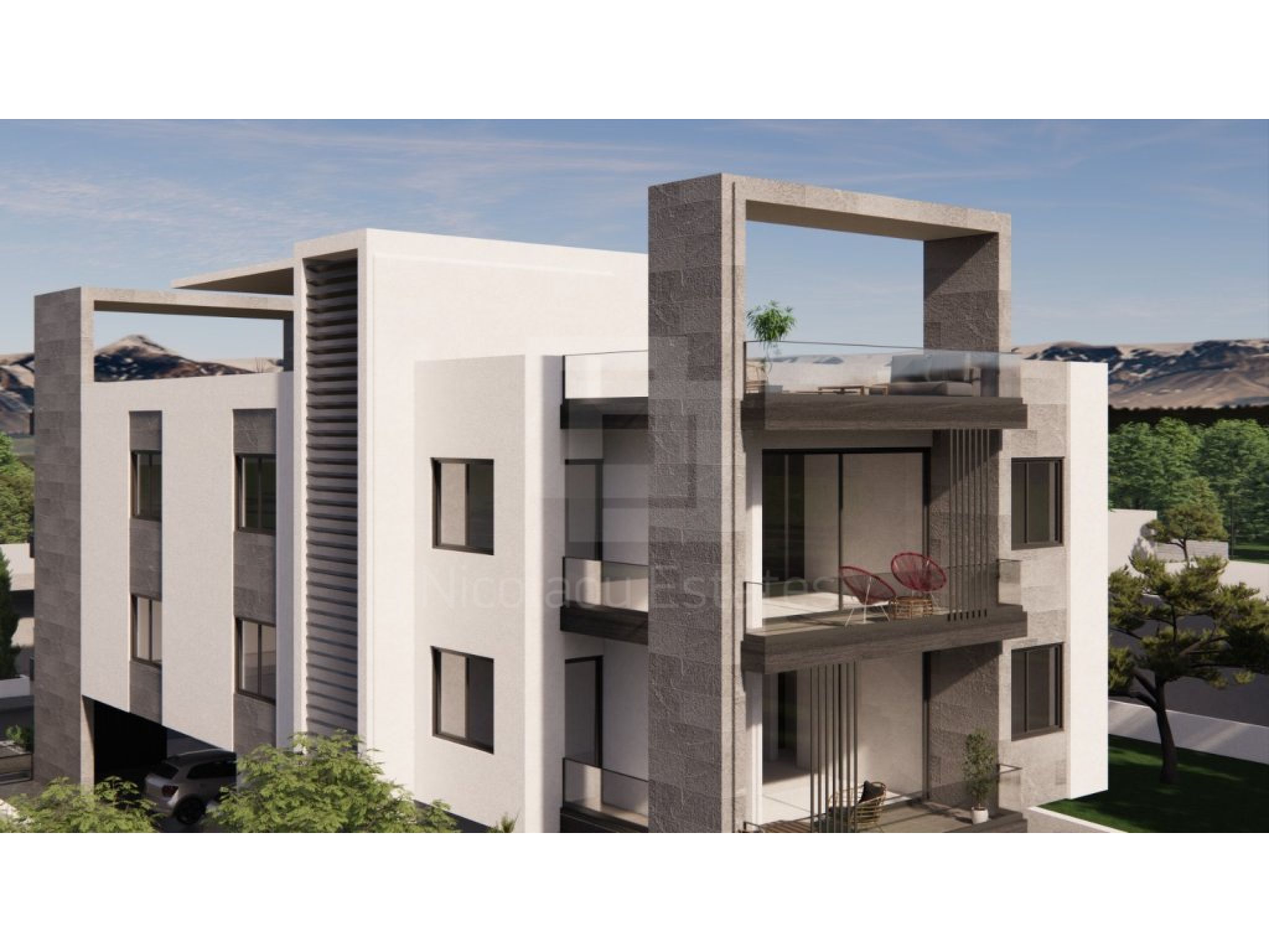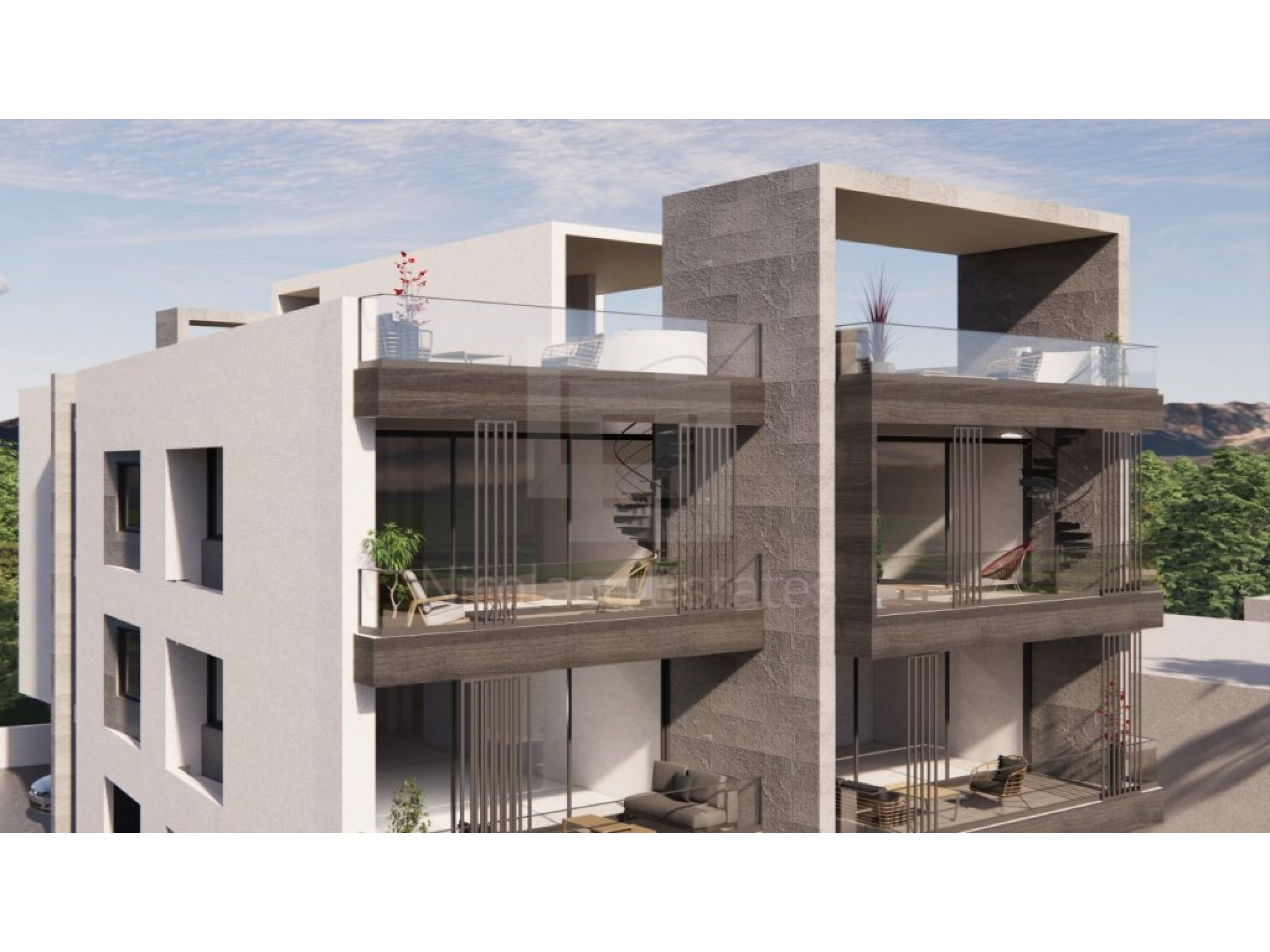 Upper-floor apartments include private roof terraces with open views towards the sea and Livadia’s surrounding landscape.