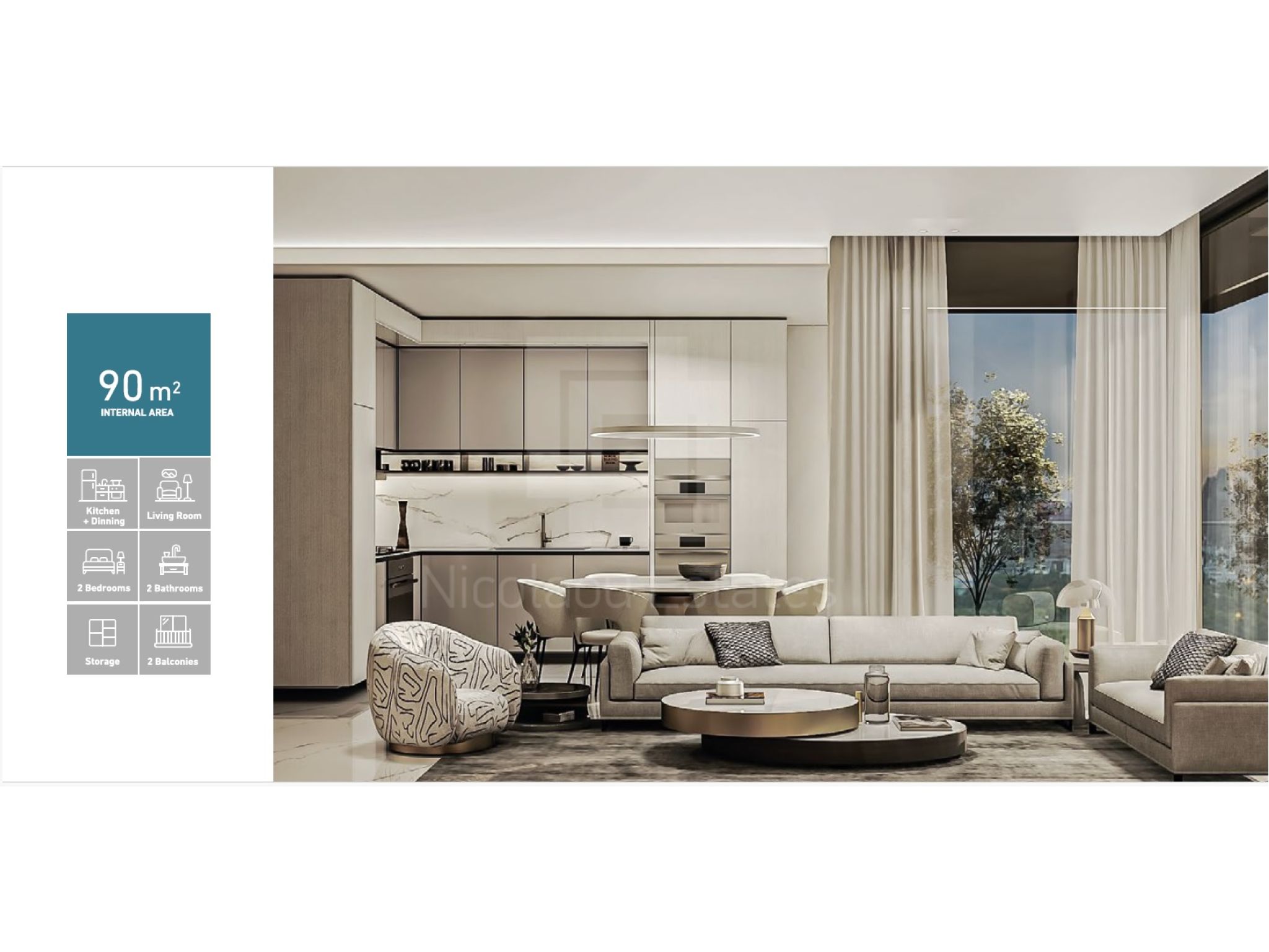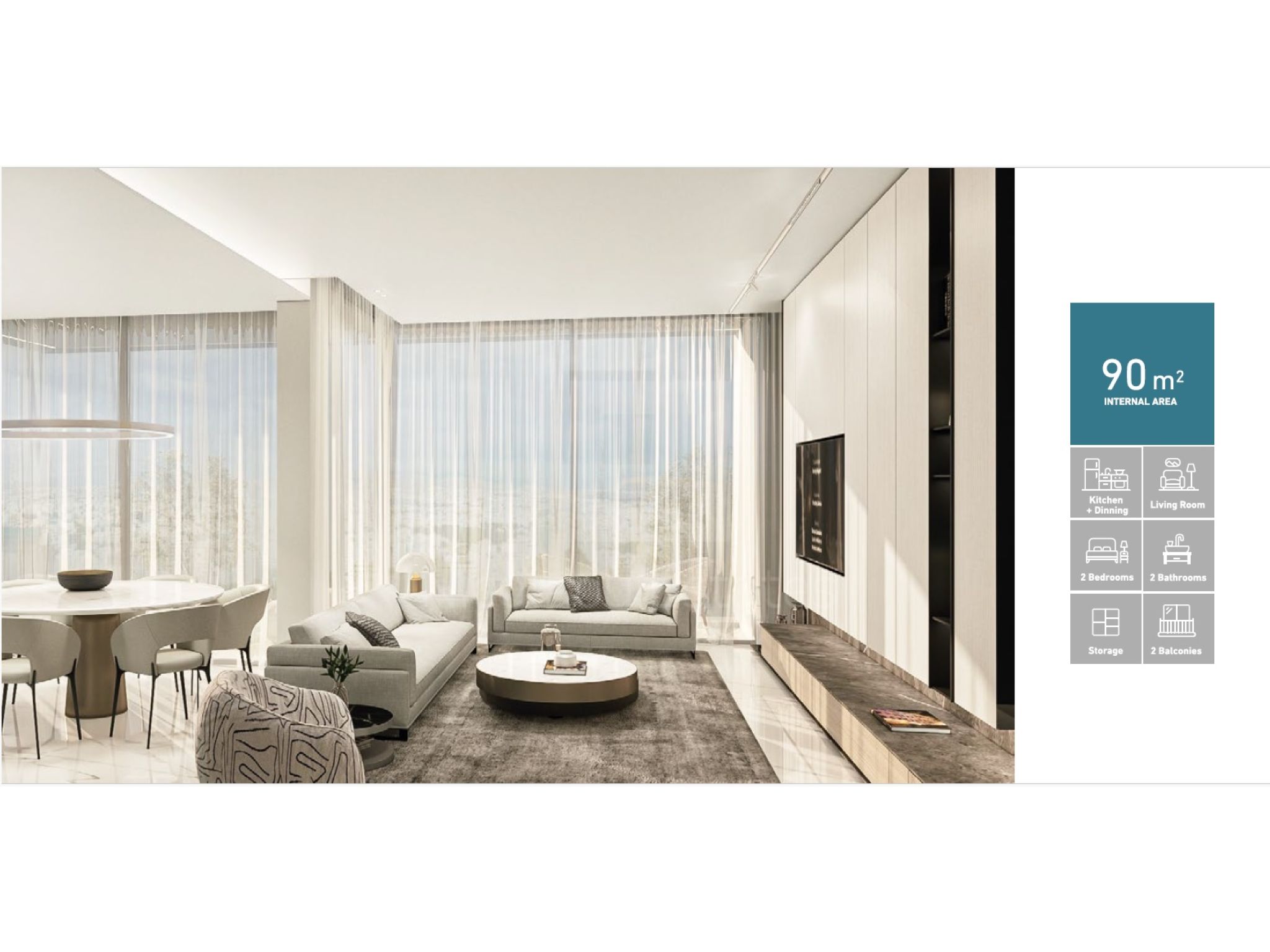 The residents of these apartments will benefit from very spacious interior areas of 90sq.m (968.75sq.f) and very comfortable balconies of over 30sq.m (323sq.f), covered parking space for each flat as well as a private storage room on ground level.