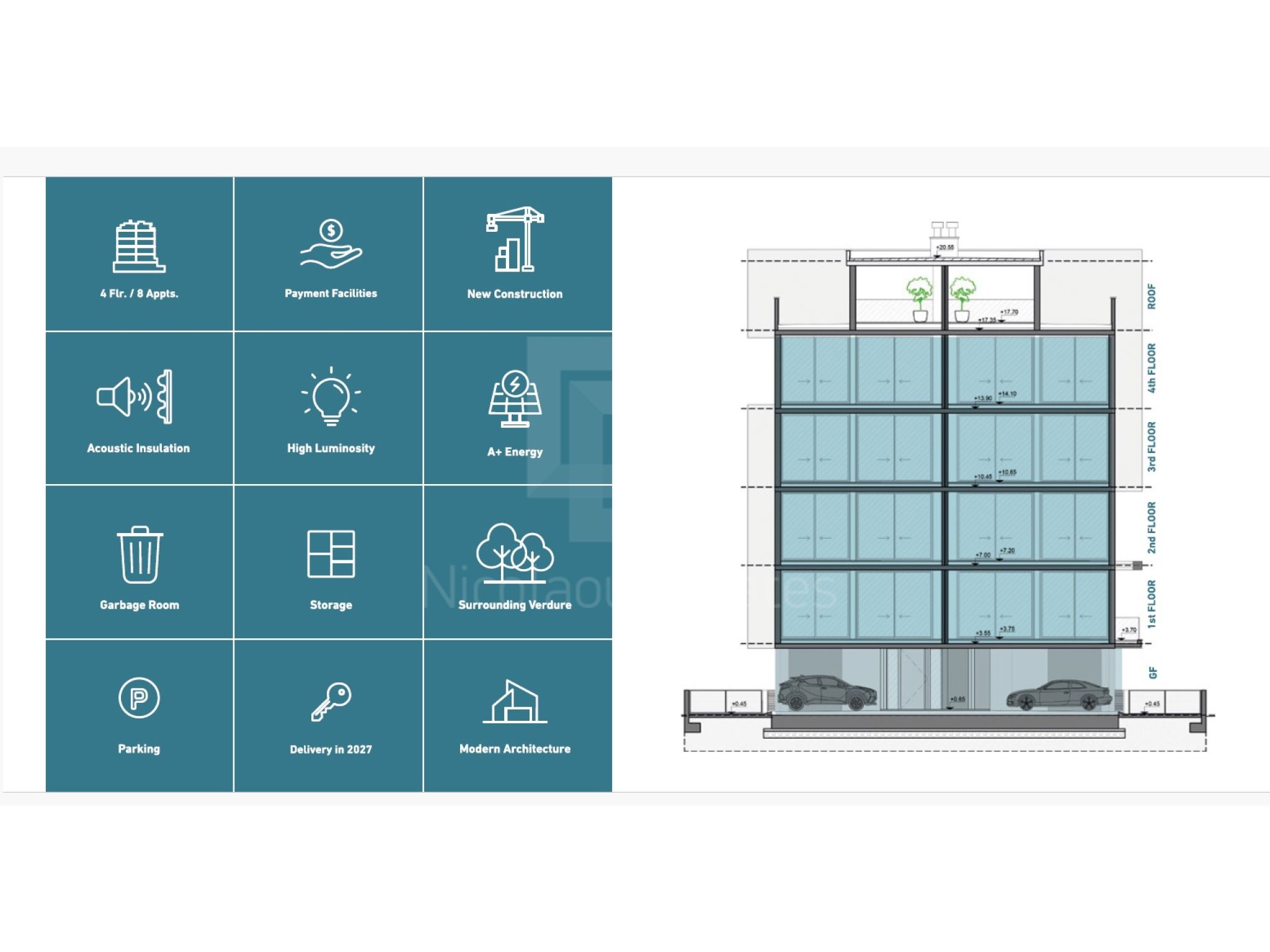 This modern building which is currently under construction (Delivery in March 2027), comprises of 4 floors with only 2 apartments of 2 bedrooms/2 bathrooms on each floor. That’s a total of only 8 luxury flats. The apartments on the 4th floor benefit from a private Roof garden.