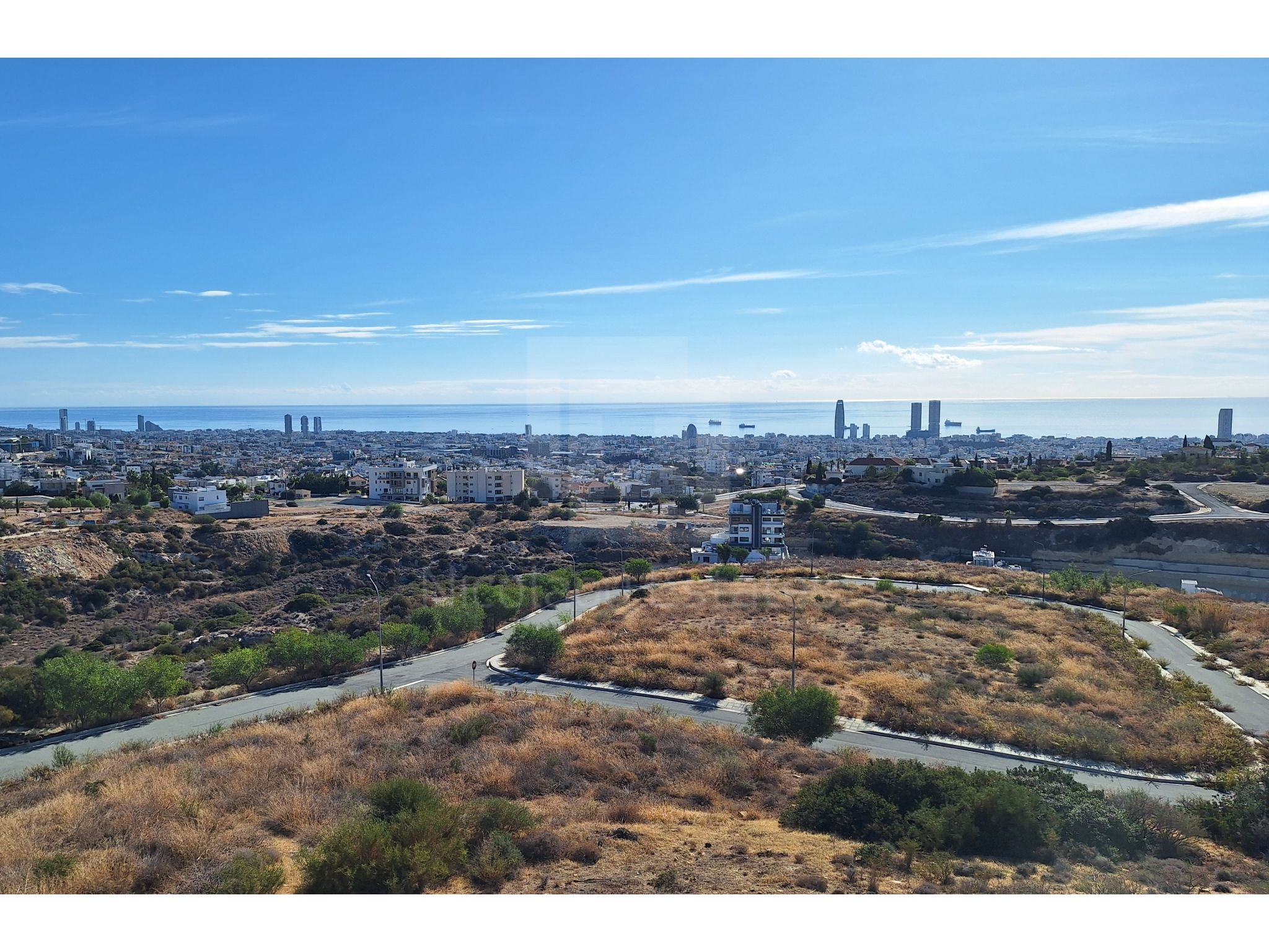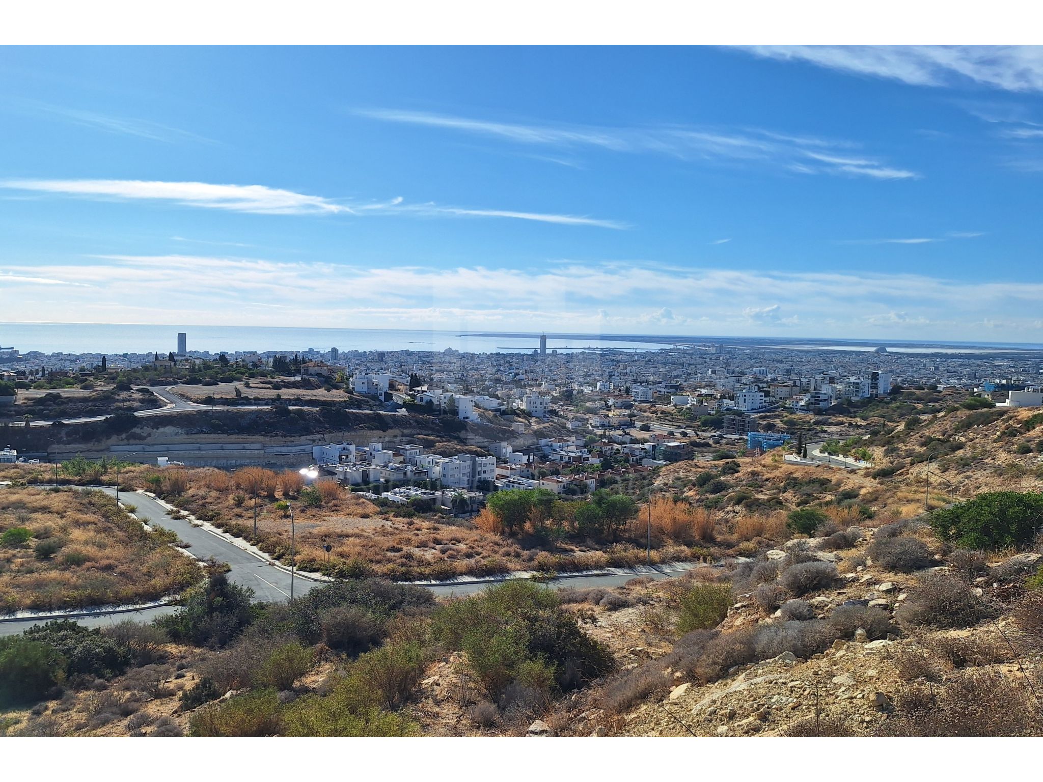 Panoramic views of Limassol bay to the South and South East, all the way to Akrotiri to the South and Episkopi bay to the West.