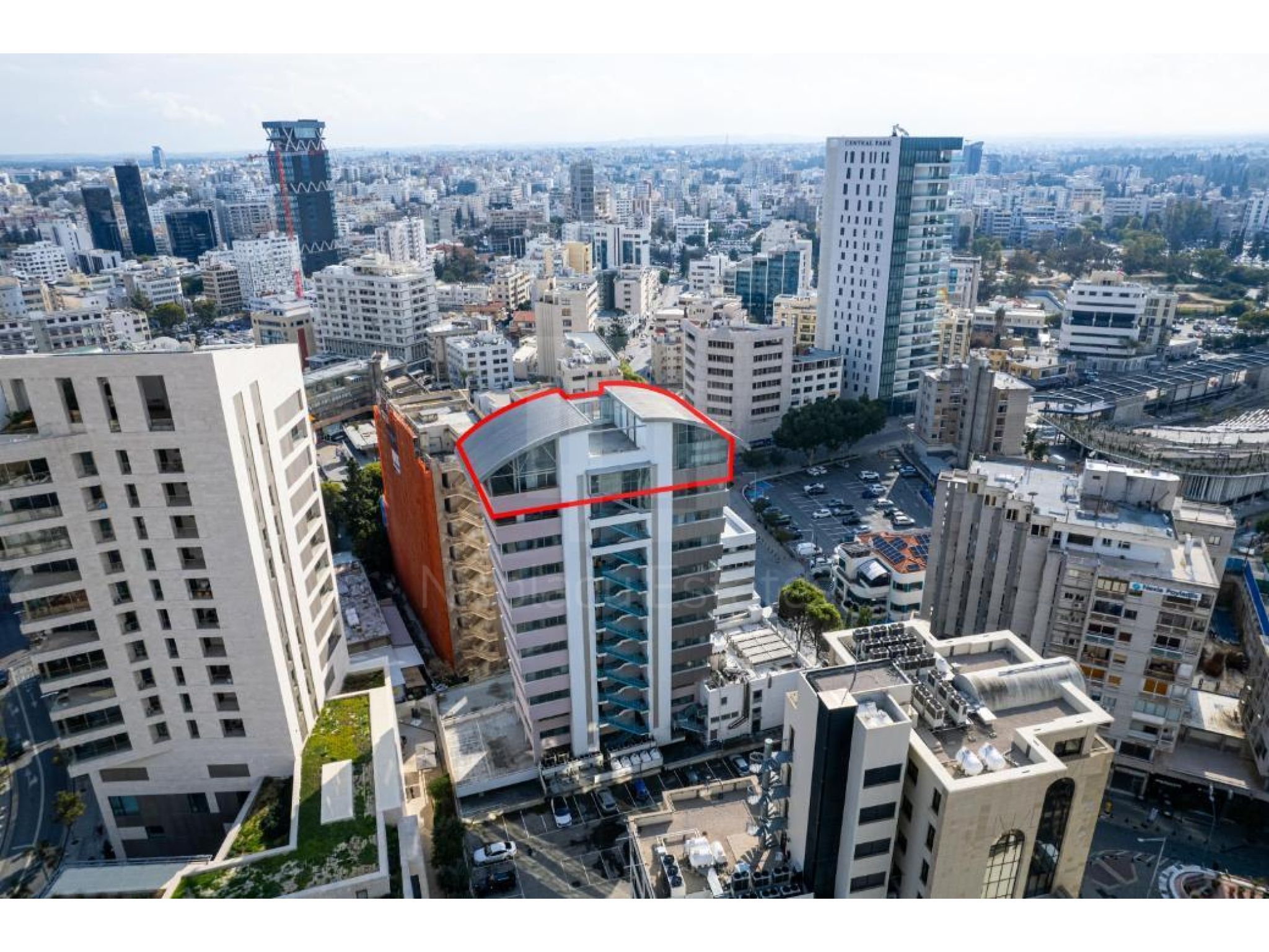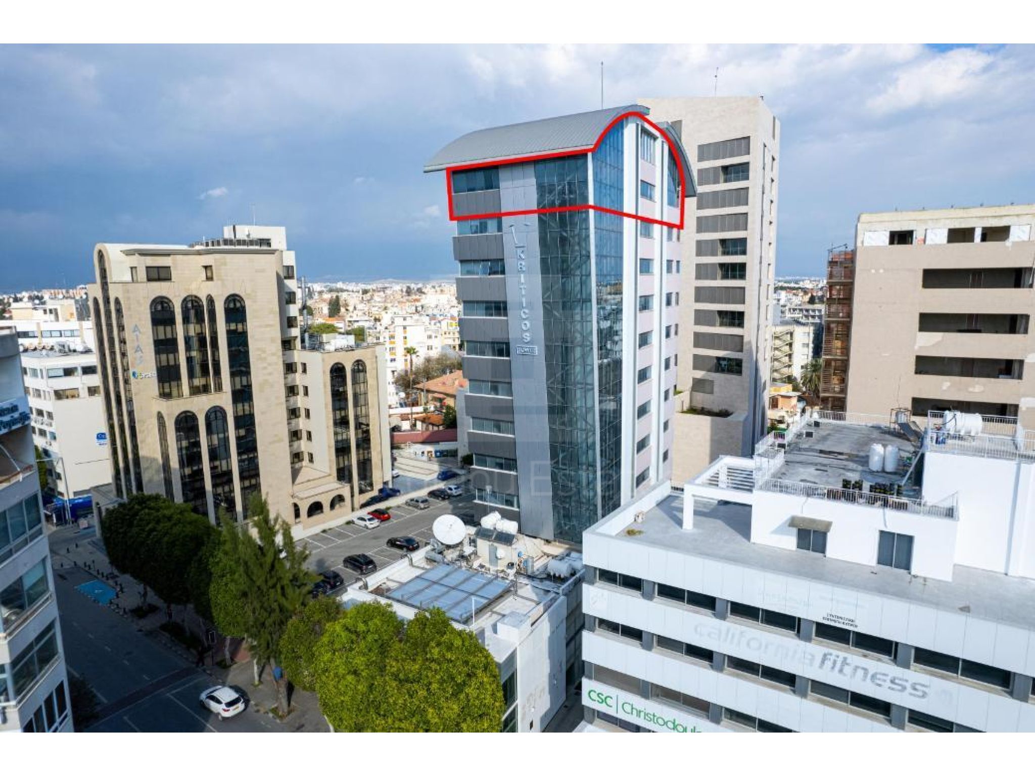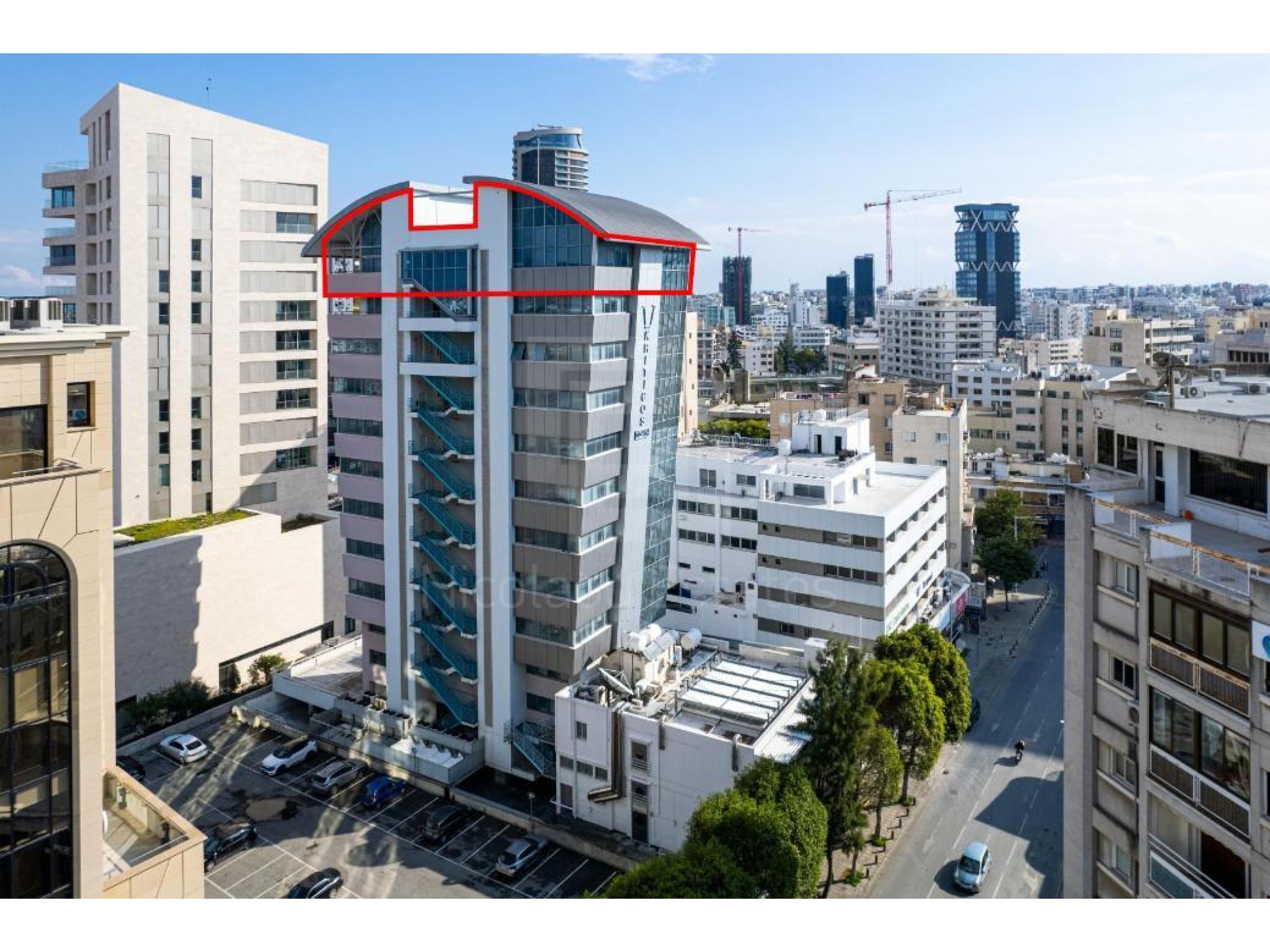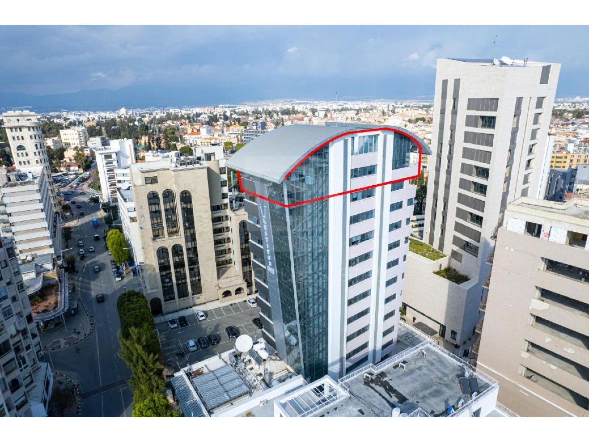 The property concerns an office (no. 1) on the 11th floor of a mixed-use building in Trypiotis. The building known as 'Kriticos Tower' is located on Diagorou and Evagorou streets, 75m from Themistokli Dervi avenue.