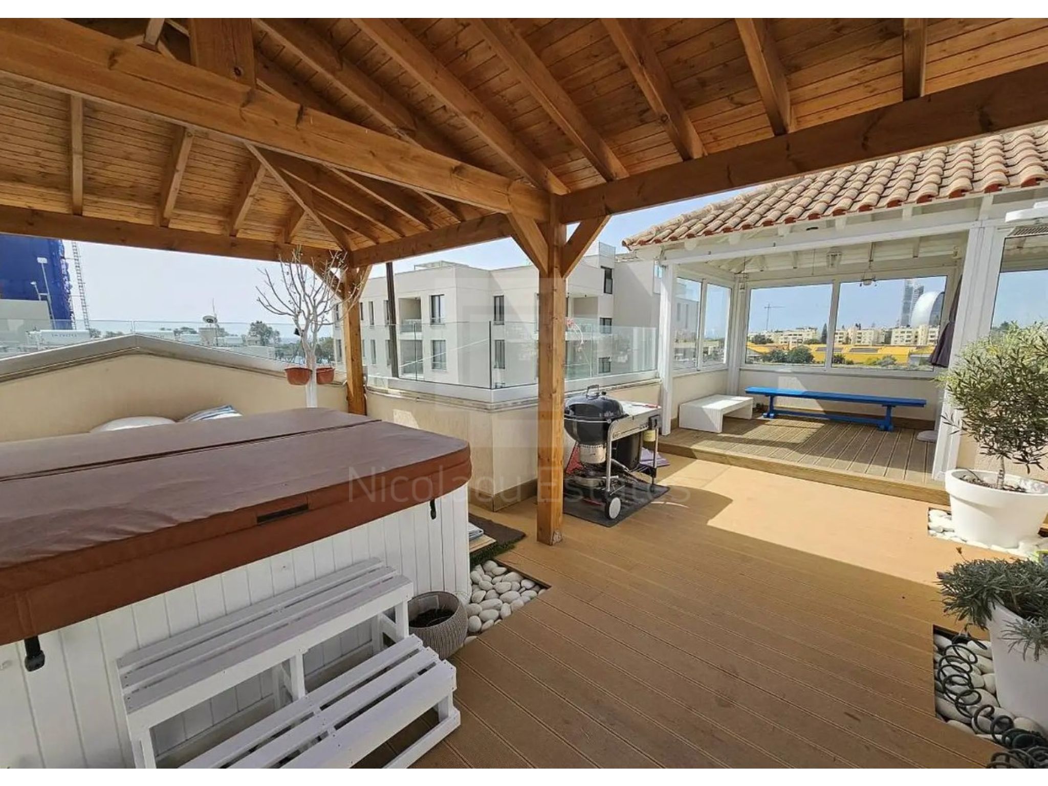 On the roof there is a jacuzzi and three covered pergolas.