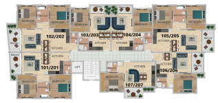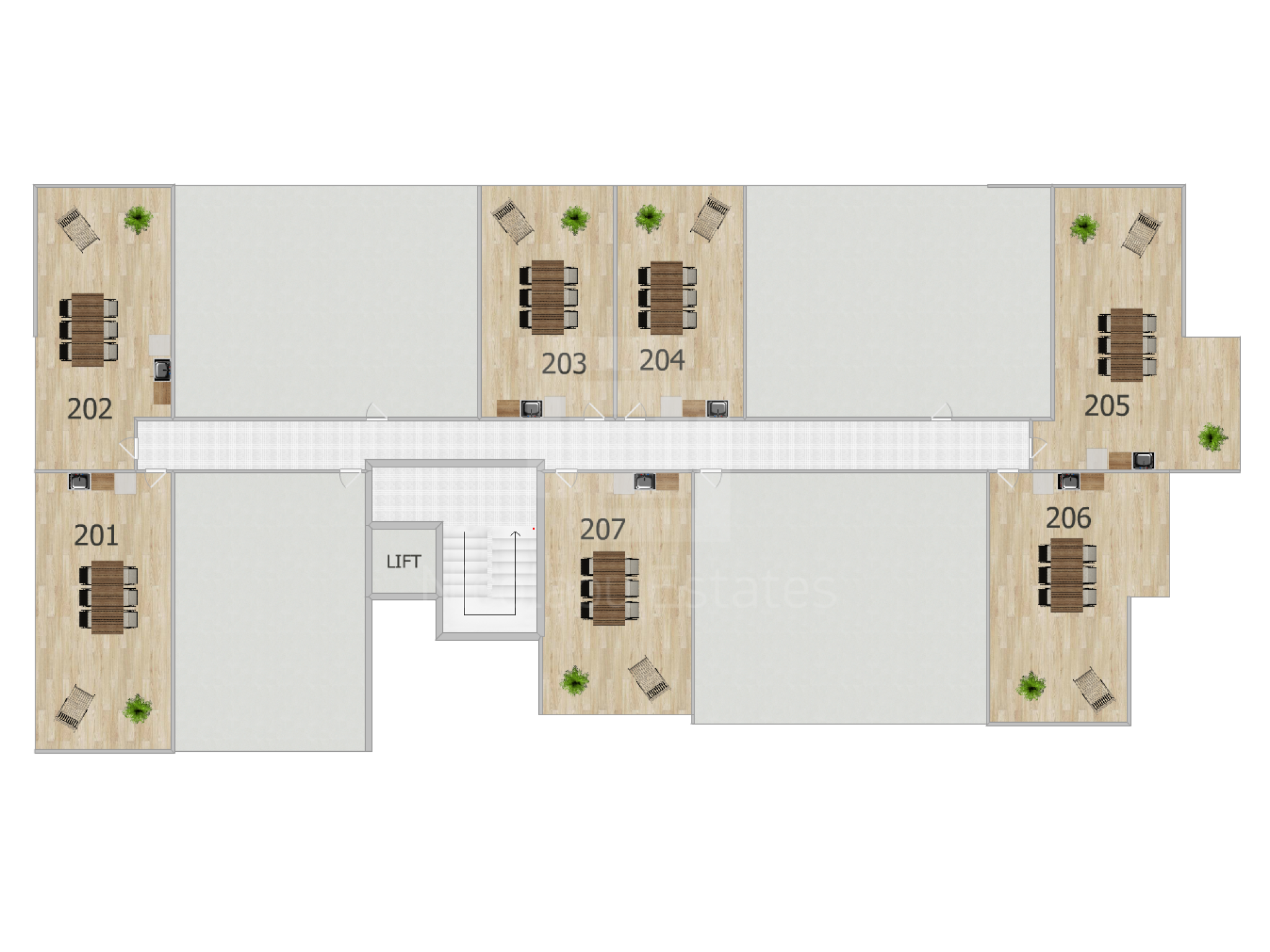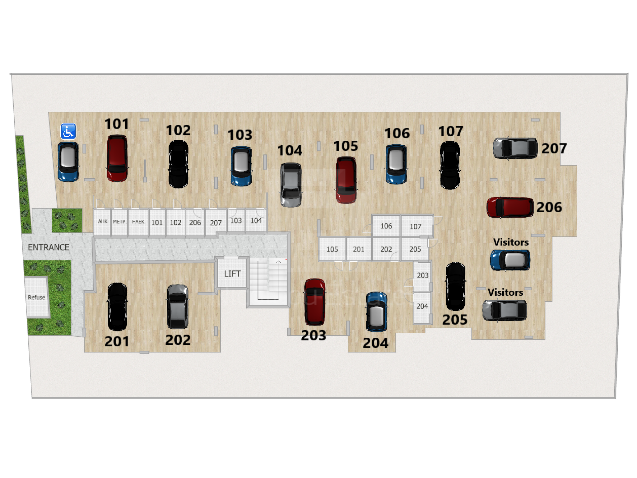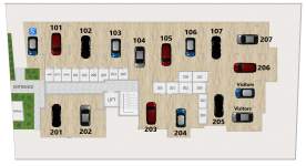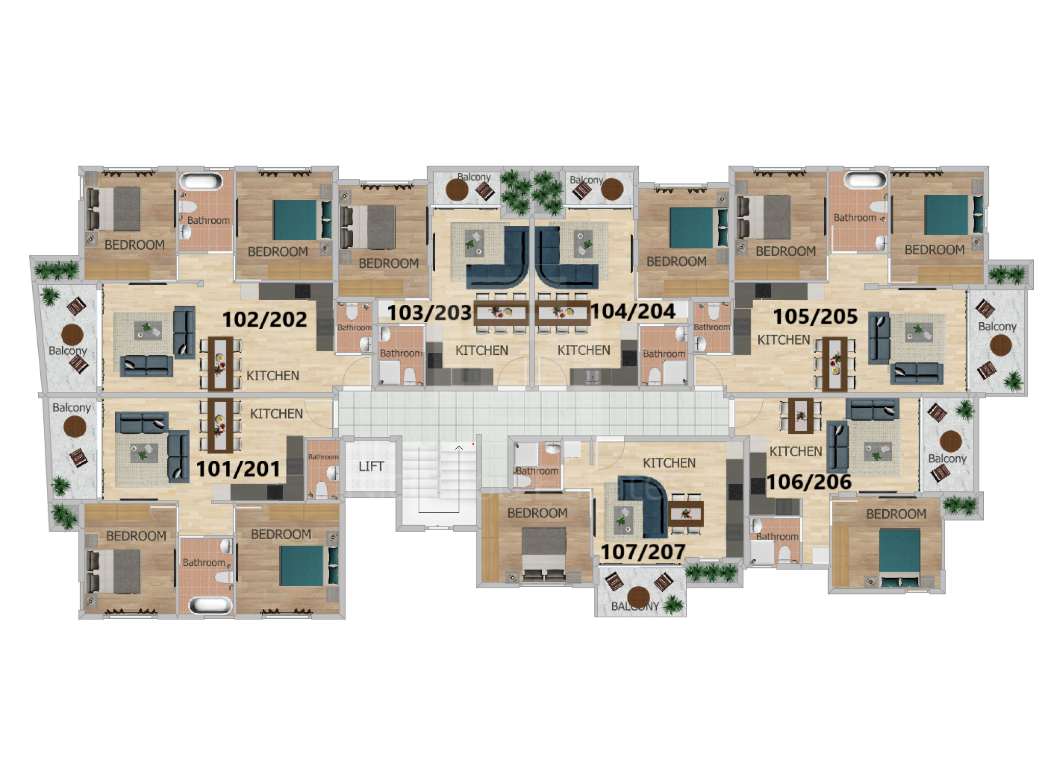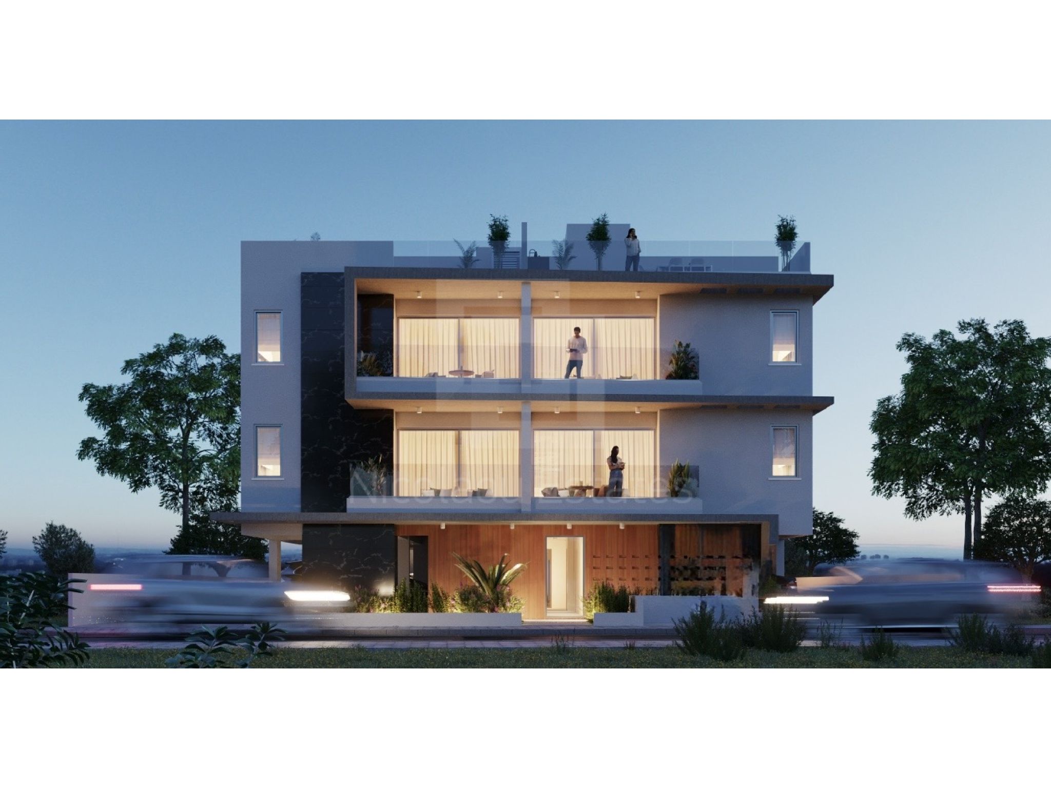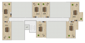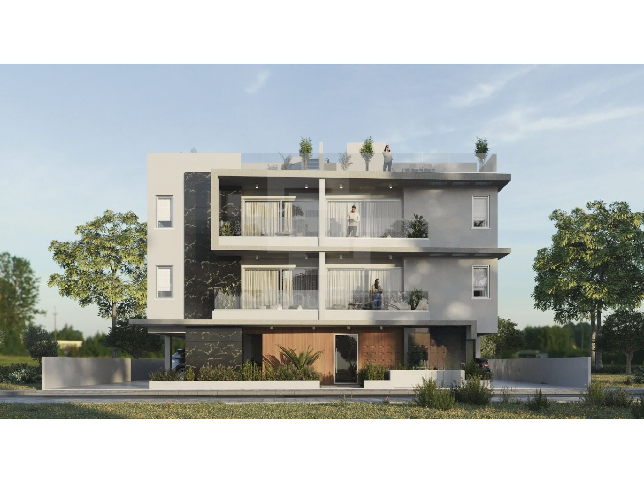 Διαμέρισμα 201 (210.000 συν ΦΠΑ): 72τμ εσωτερικός καλυμμένος χώρος, 8τμ καλυμμένη βεράντα, 40τμ roof garden, 2 υπνοδωμάτια, 2 μπάνια, καλυμμένος χώρος στάθμευσης και αποθήκη.