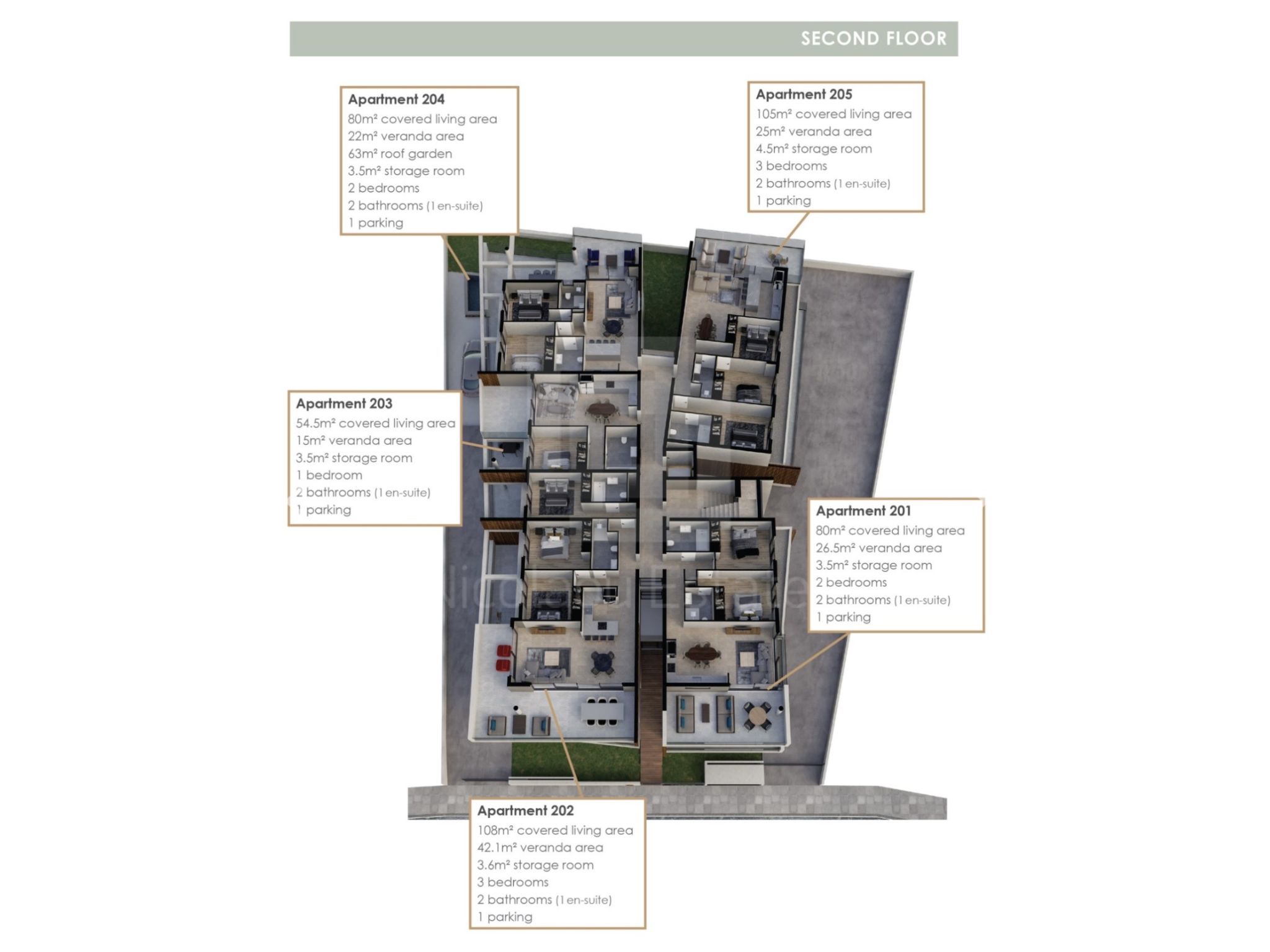 Apartment 204 (265,000 plus VAT): 80sqm indoor covered area, 22sqm covered veranda, 63sqm roof garden, 2 bedrooms, 2 bathrooms, a covered parking and a storageroom.