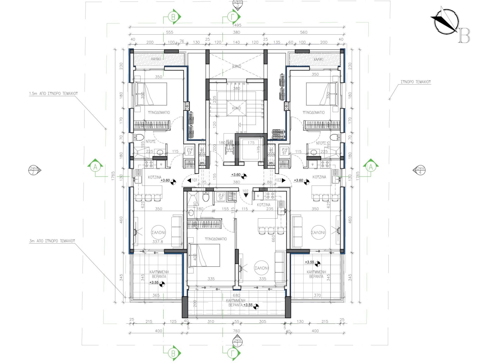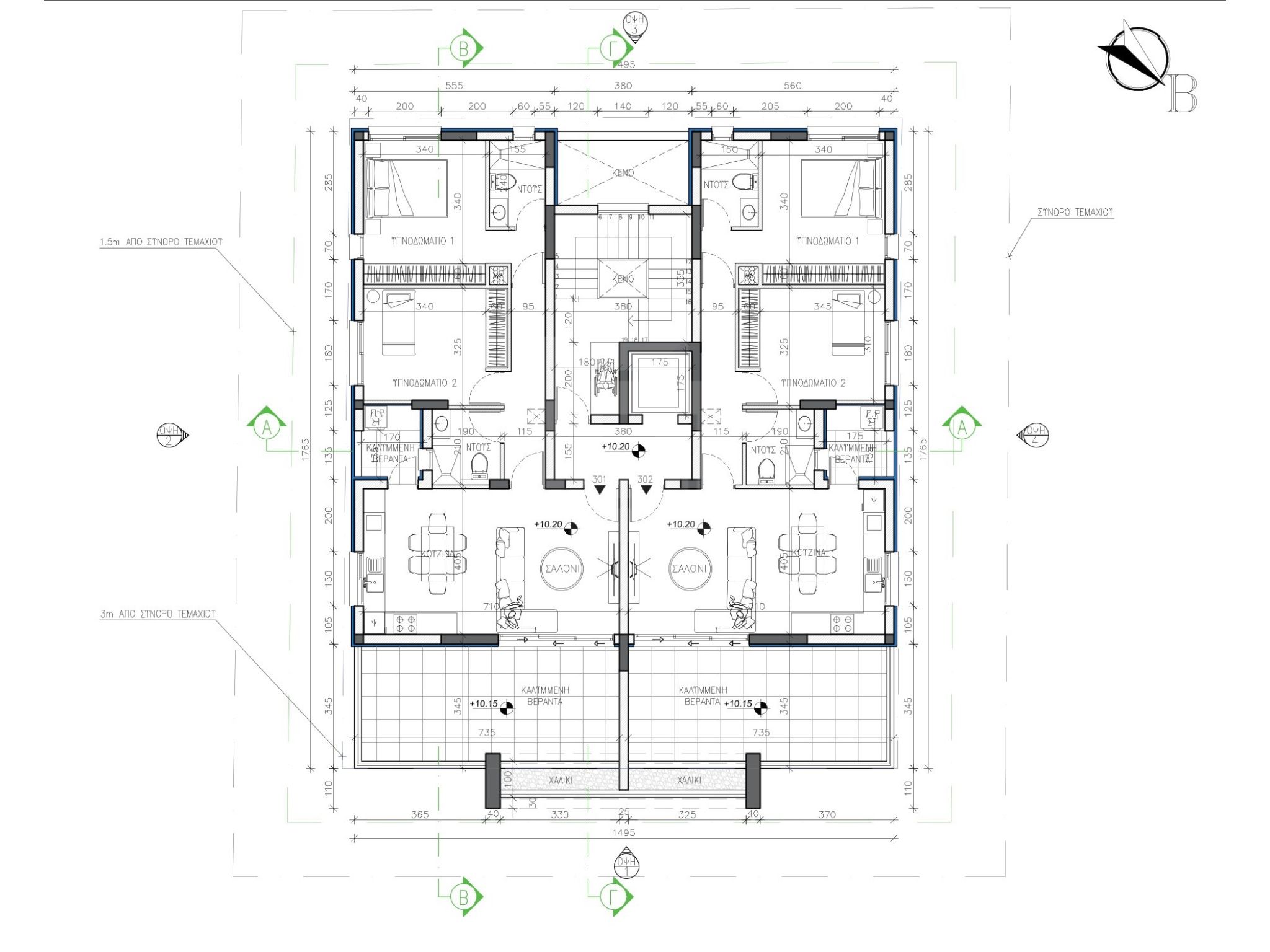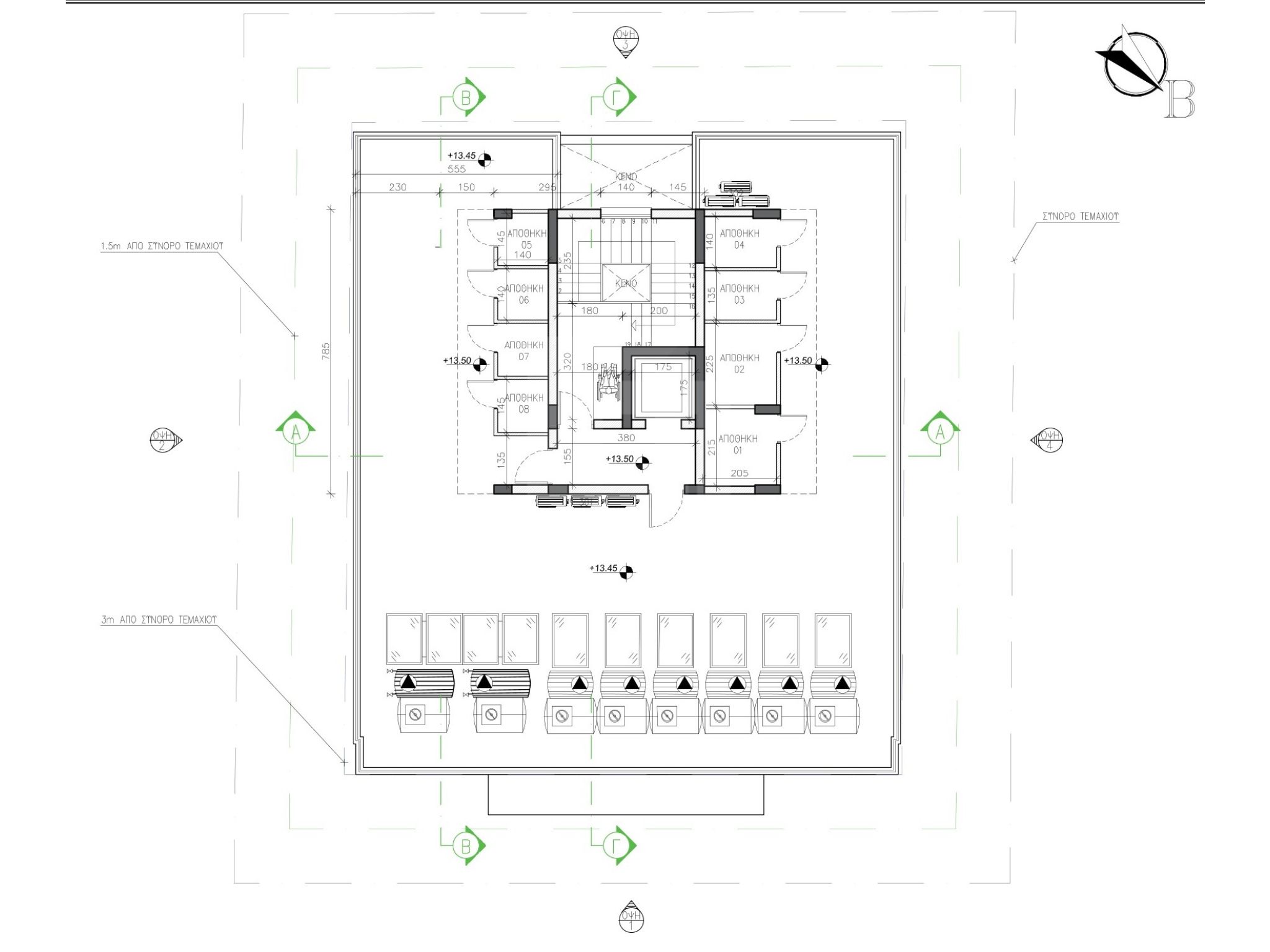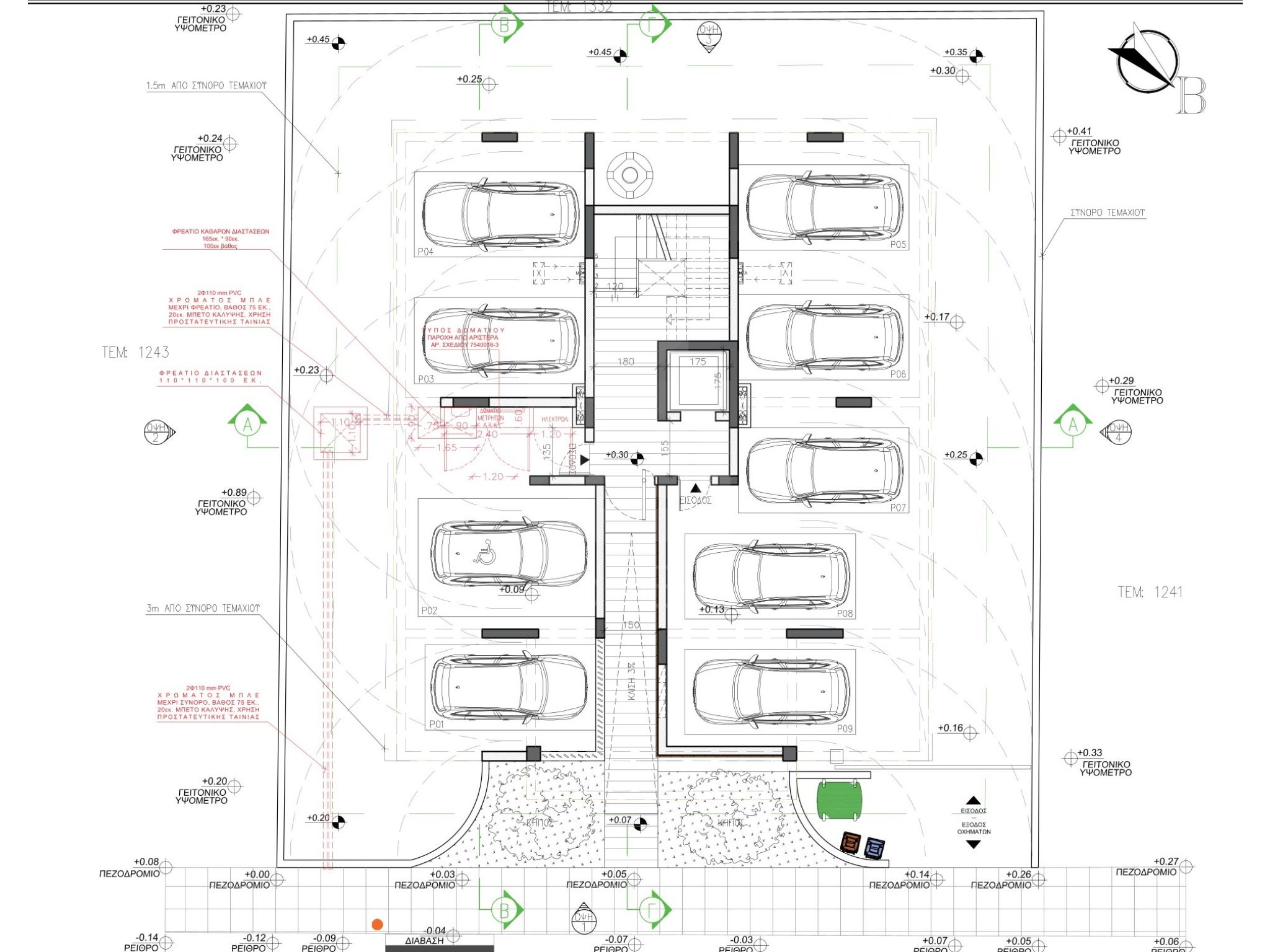 Η απόσταση του κτιρίου από τα όρια είναι μεγάλη για την ομαλή κίνηση των αυτοκινήτων εντός και εκτός του χώρου στάθμευσης.