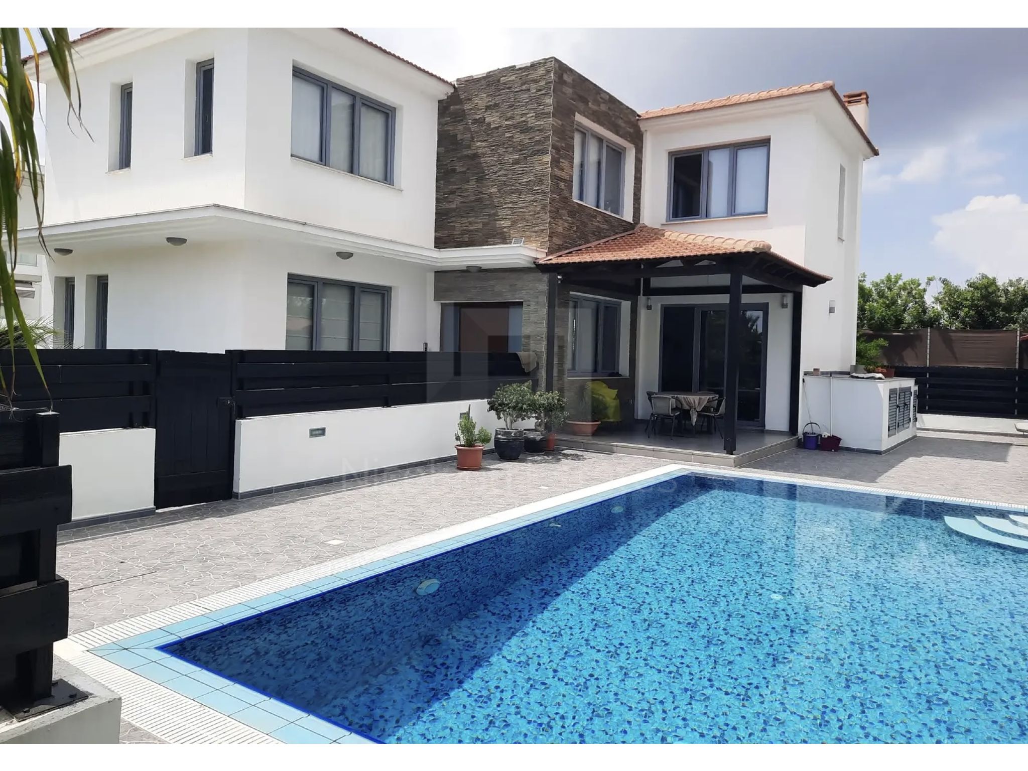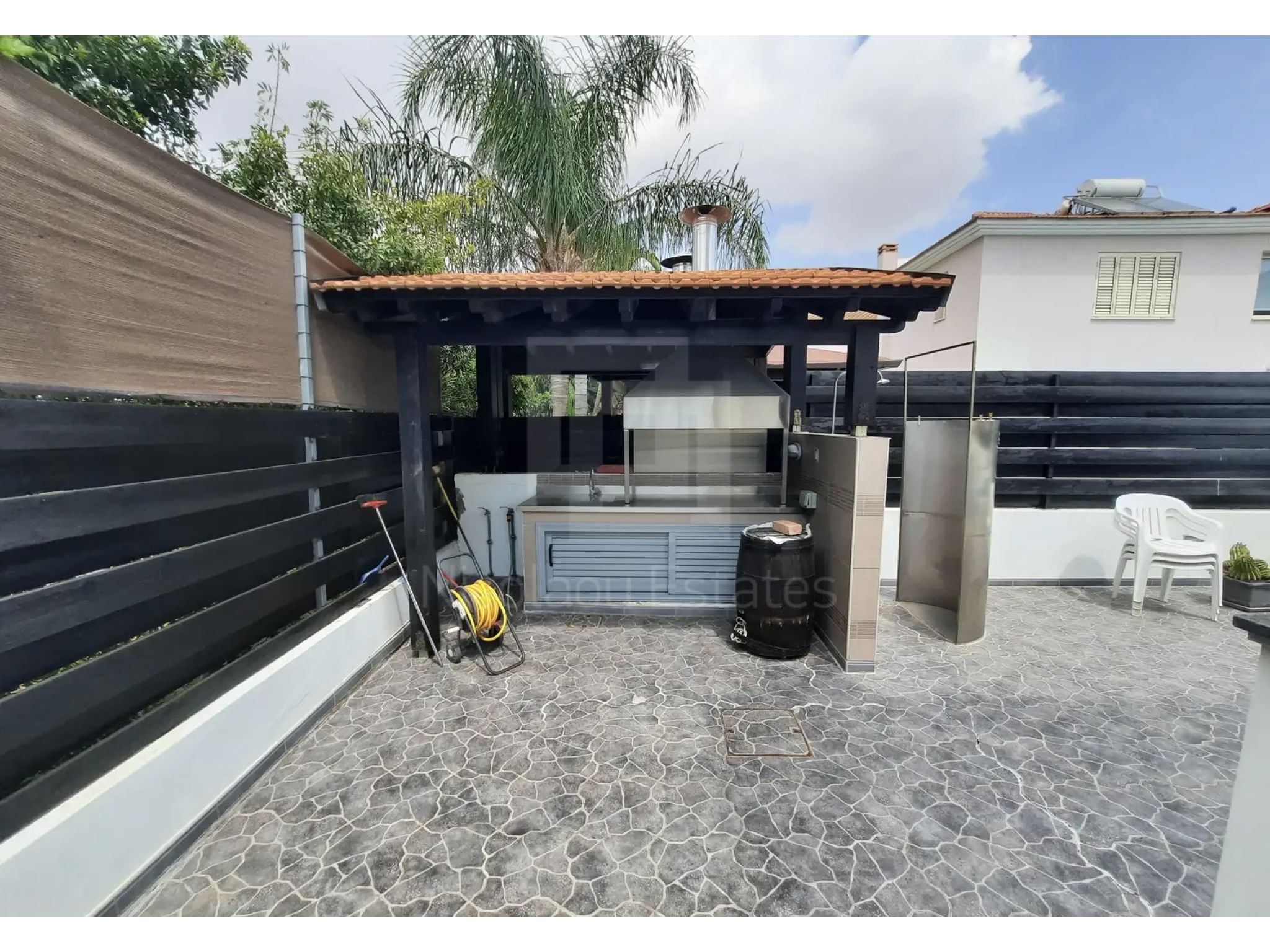 Στην αυλή υπάρχει πισίνα με κάλυμμα, νέα κεραμικά στον περιβάλλοντα χώρο, μπάρμπεκιου με λεκάνη και extractor hood, εξωτερική αποθήκη και άνετος κήπος.