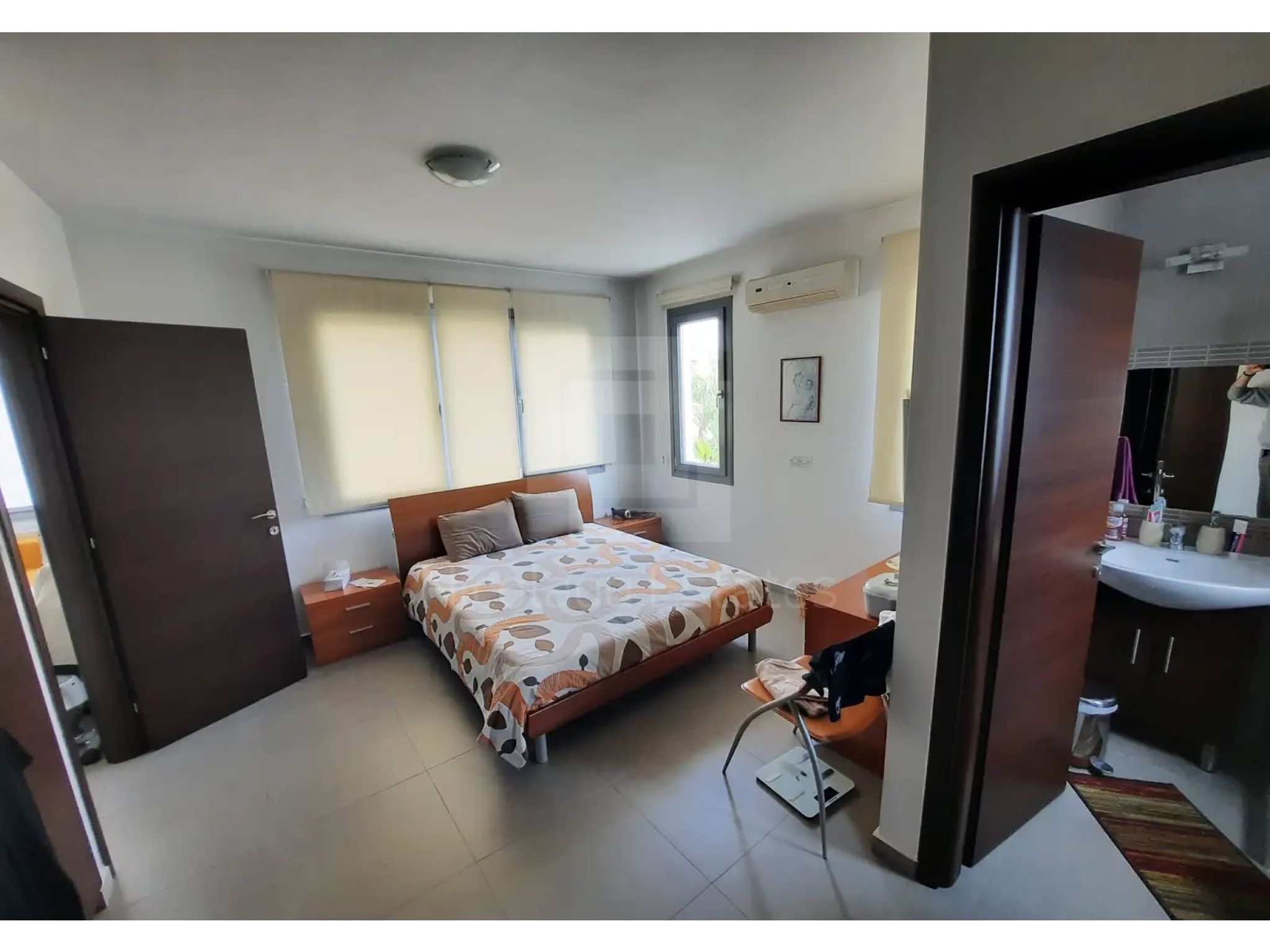 Στον όροφο υπάρχουν τρία μεγάλα υπνοδωμάτια (το κυρίως με en-suite WC/ ντουζιέρα) και ένας μεγάλος ανοιχτός χώρος που λειτουργεί ως μικρό καθιστικό γυμναστήριο πλυσταριό. Ο χώρος αυτός ήταν στα αρχικά σχέδια ως τέταρτο υπνοδωμάτιο και μπορεί πολύ εύκολα να κλείσει με γυψοσανίδα αν το επιθυμεί ο νέος ιδιοκτήτης.
