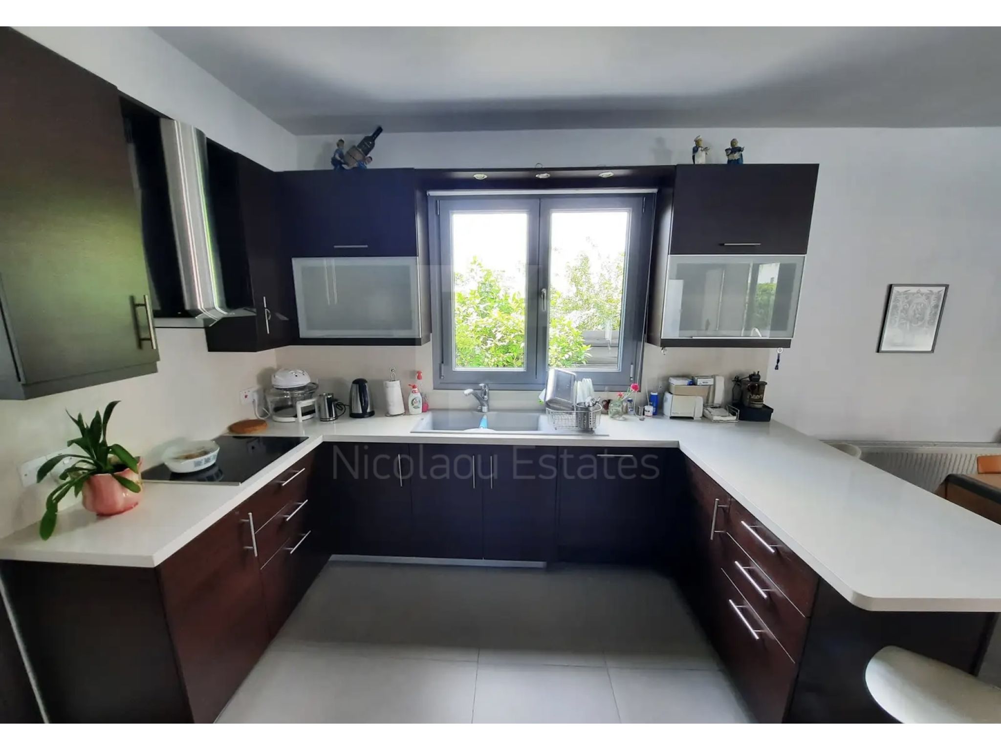 Στο ισόγειο υπάρχει ευρύχωρο καθιστικό/τραπεζαρία, ανεξάρτητη πλήρως εξοπλισμένη κουζίνα με τραπέζι και καθημερινό καθιστικό, καθώς και βοηθητική κουζινούλα/ πλυσταριό.