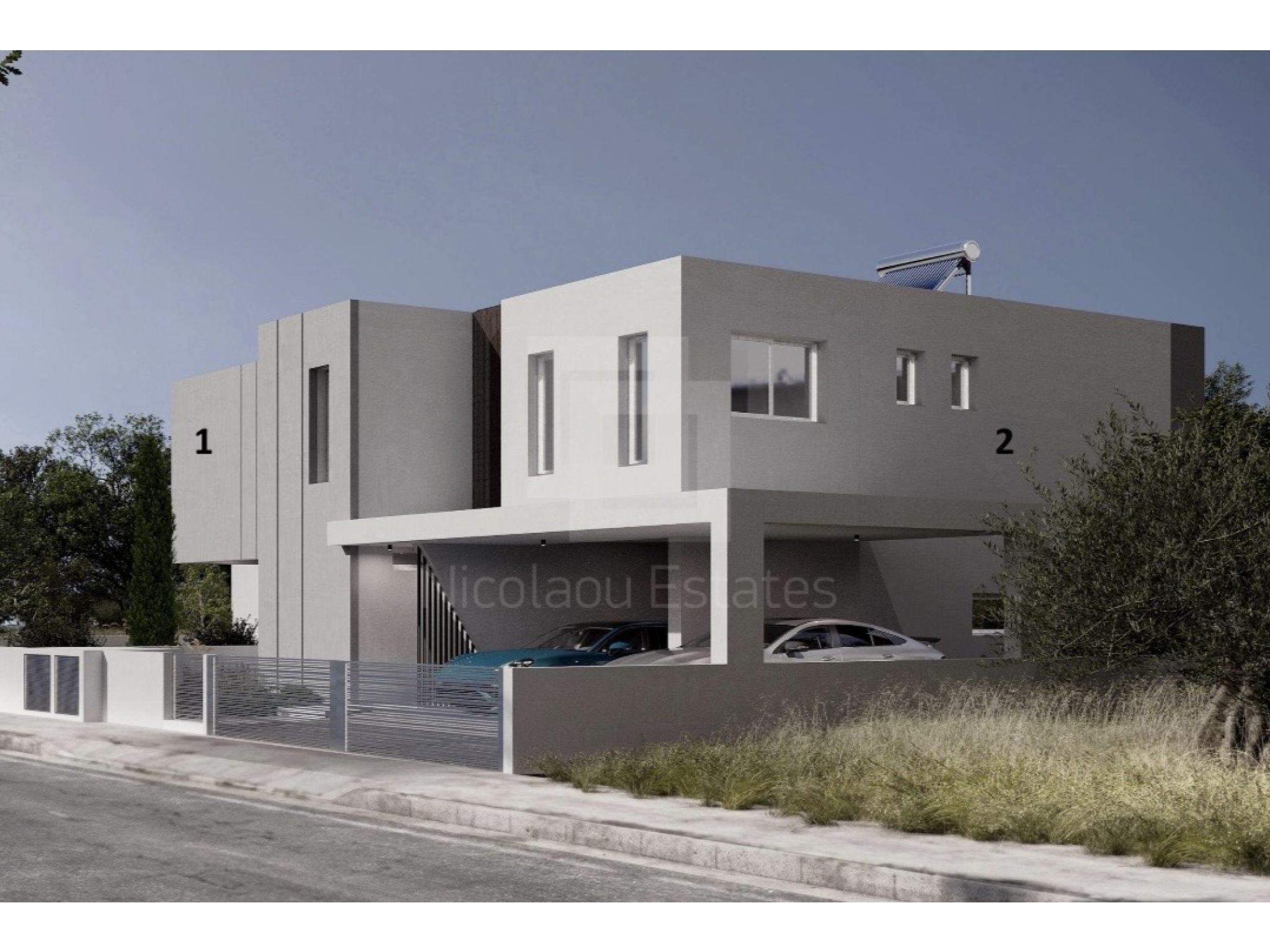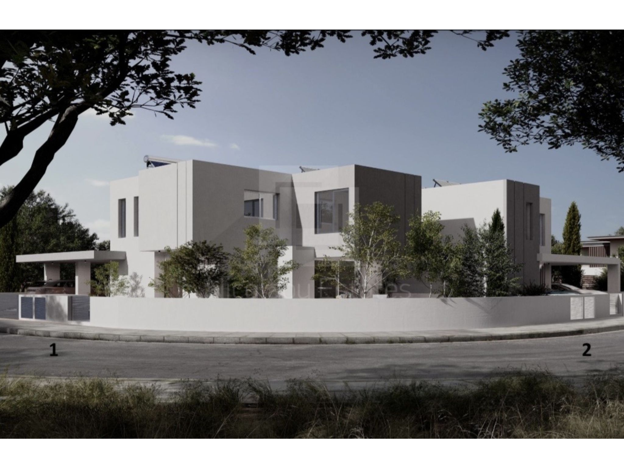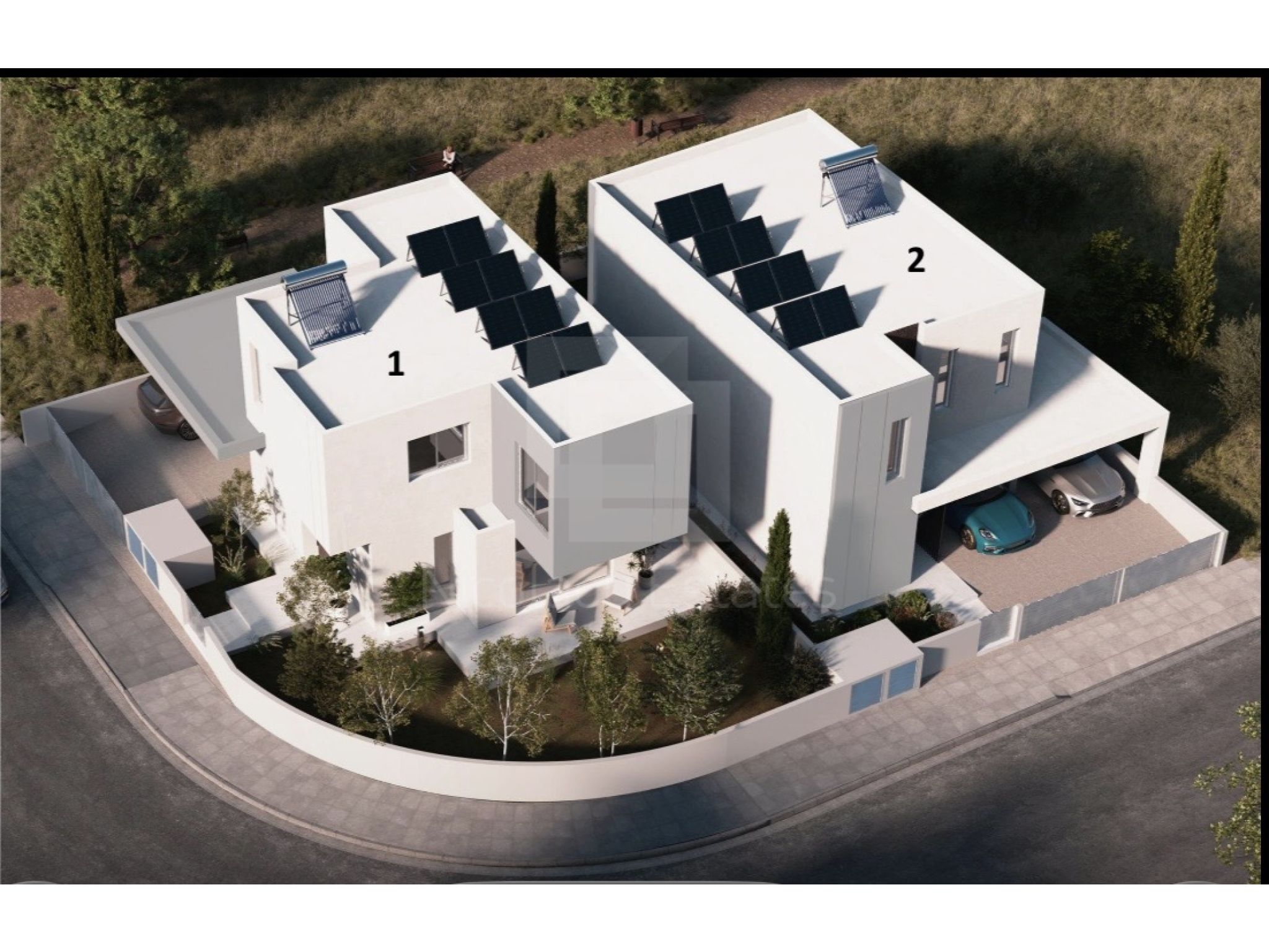 House 1 (354,000.00 plus VAT): 271sqm plot, 155sqm interior space, 16sqm covered verandas, 134sqm garden, 38sqm covered parking space for 2 cars and storage room.