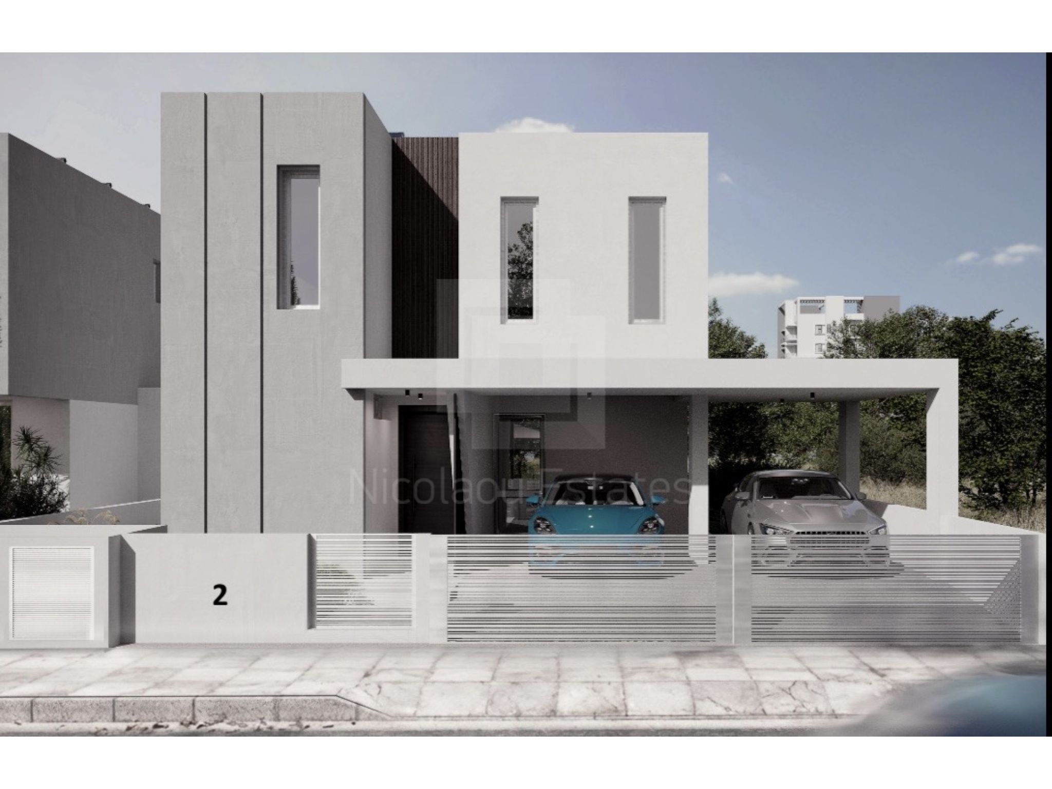 Οικία 2 (349,000.00 συν ΦΠΑ): 271τμ οικόπεδο, 155τμ εσωτερικός χώρος, 17τμ καλυμμένες βεράντες, 134τμ αυλή, 39τμ καλυμμένος χώρος στάθμευσης για 2 αυτοκίνητα και αποθήκη.