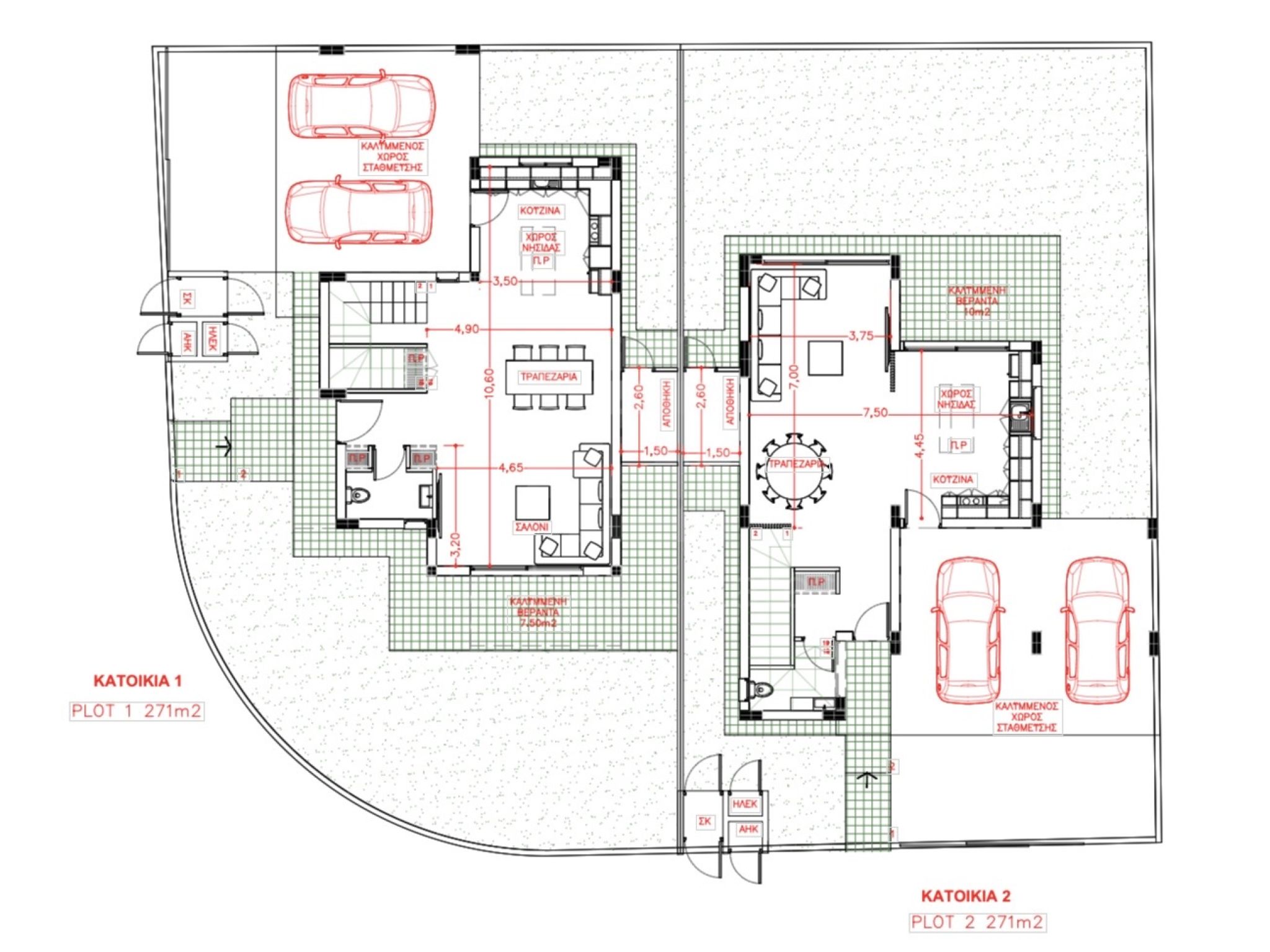 House 2 (349,000.00 plus VAT): 271sqm plot, 155sqm interior space, 17sqm covered verandas, 134sqm garden, 39sqm covered parking space for 2 cars and storage room.