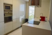 The apartment features a bright open-plan living and dining area with a fully equipped modern kitchen, two bedrooms, including a master bedroom with en-suite shower, and a family bathroom. Premium specifications include underfloor heating, home automation system, solid wood furnishings, natural marble flooring, and a granite/Corian kitchen.