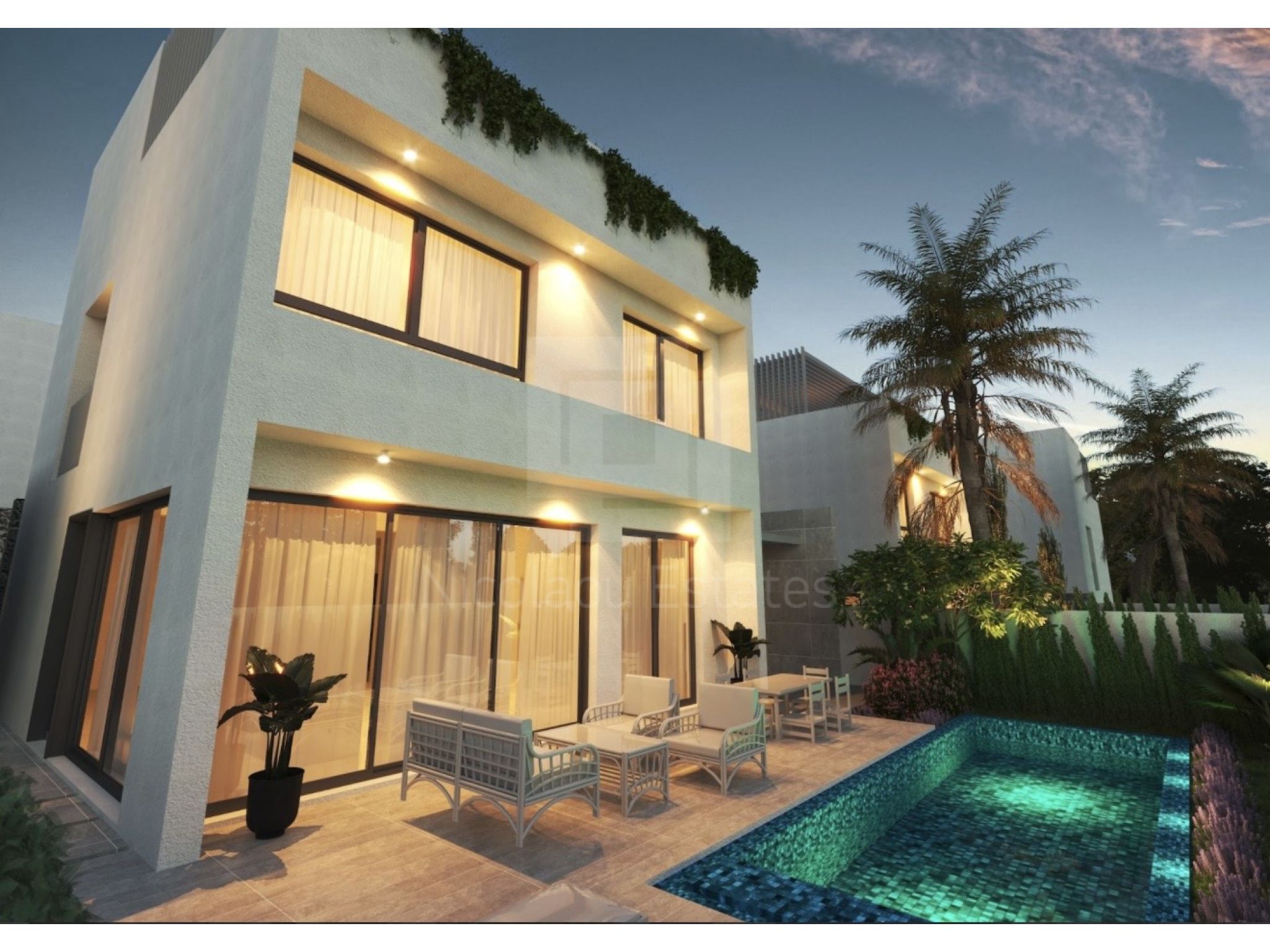 Villa 1 (750,000 plus VAT): 350 sqm plot, 180 sqm internal space, 5 bedrooms, 5 bathrooms, 50 sqm verandas, 55 sqm roof garden