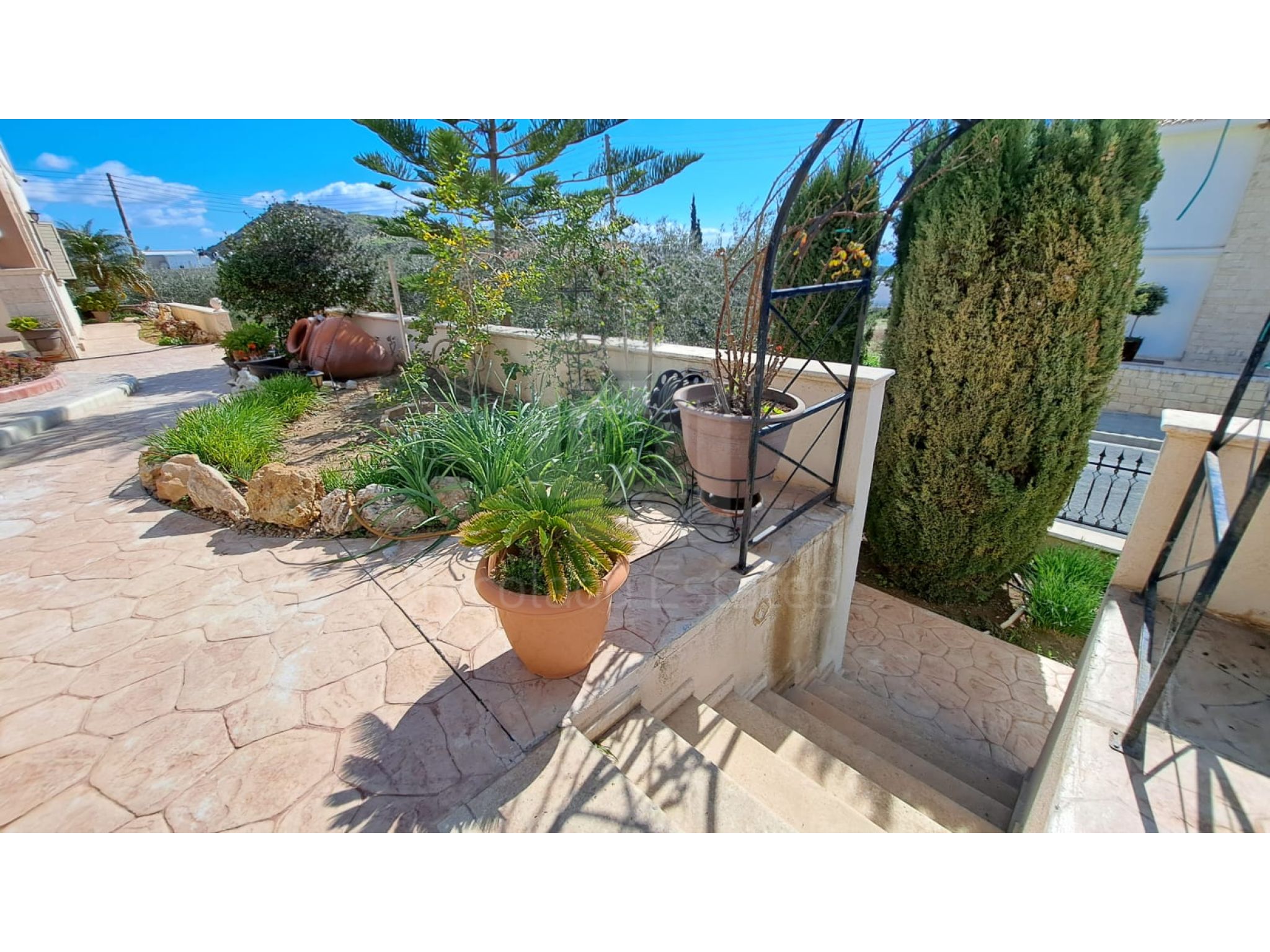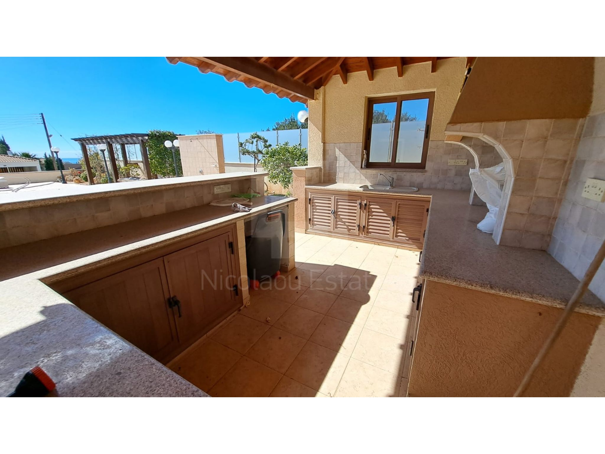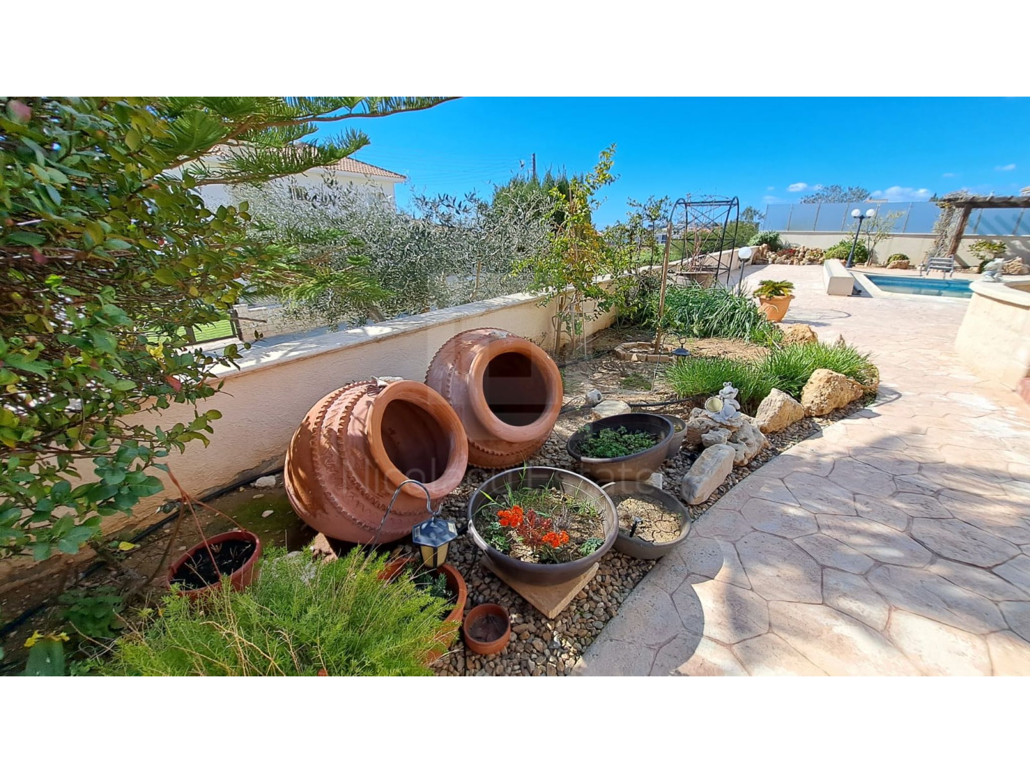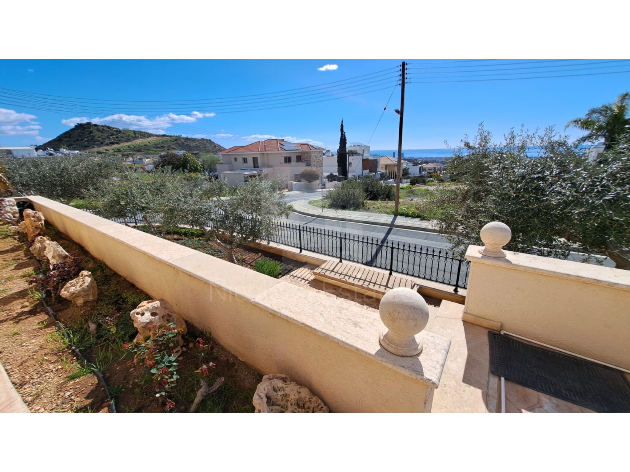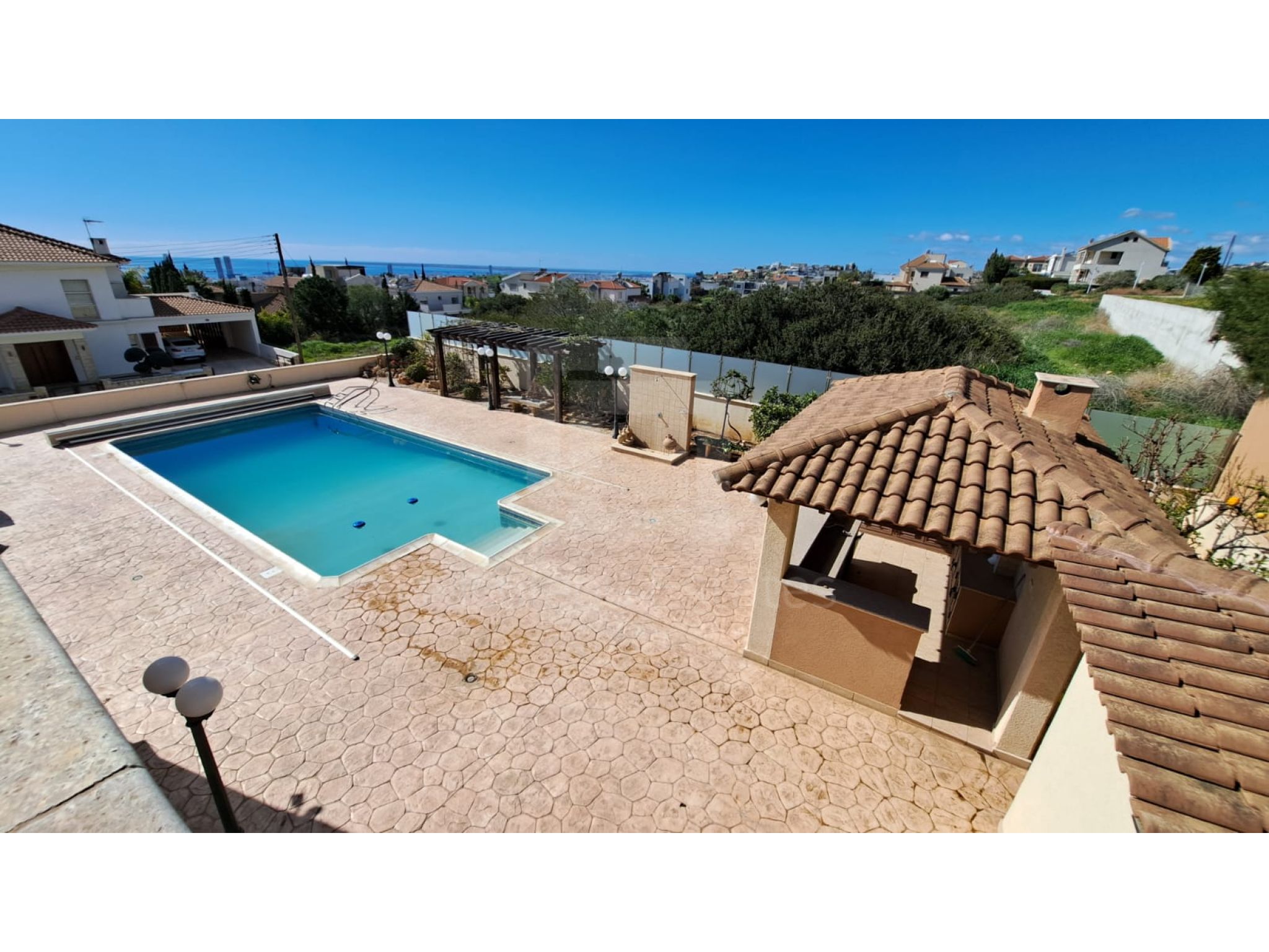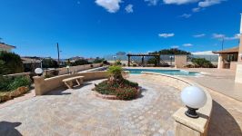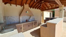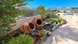 The outside space is truly spectacular with mature olive and fruit trees on the property perimeter,a large pool and a lovely BBQ Kiosk/kitchen for those pool parties all areas offering stunning sea views.