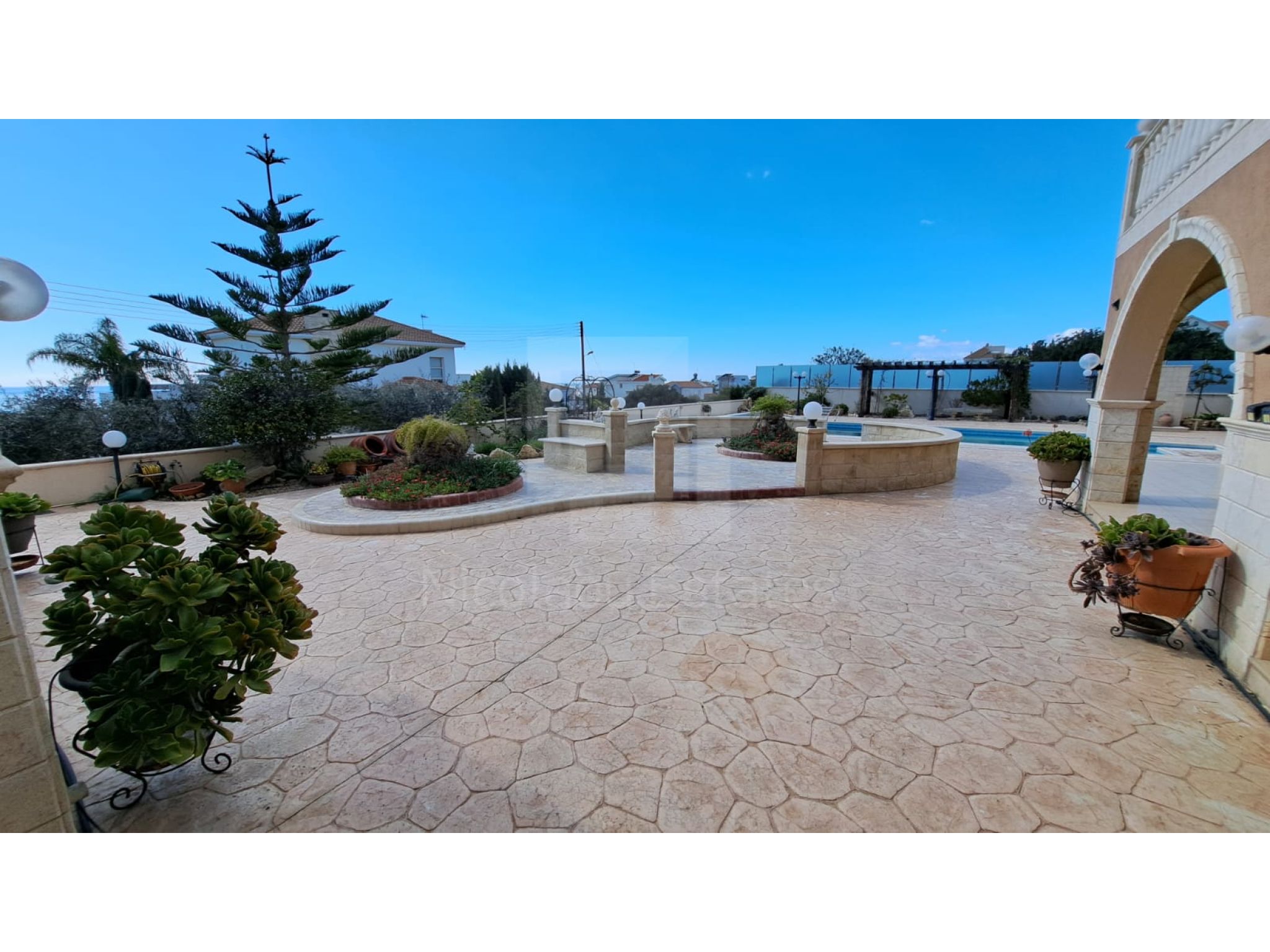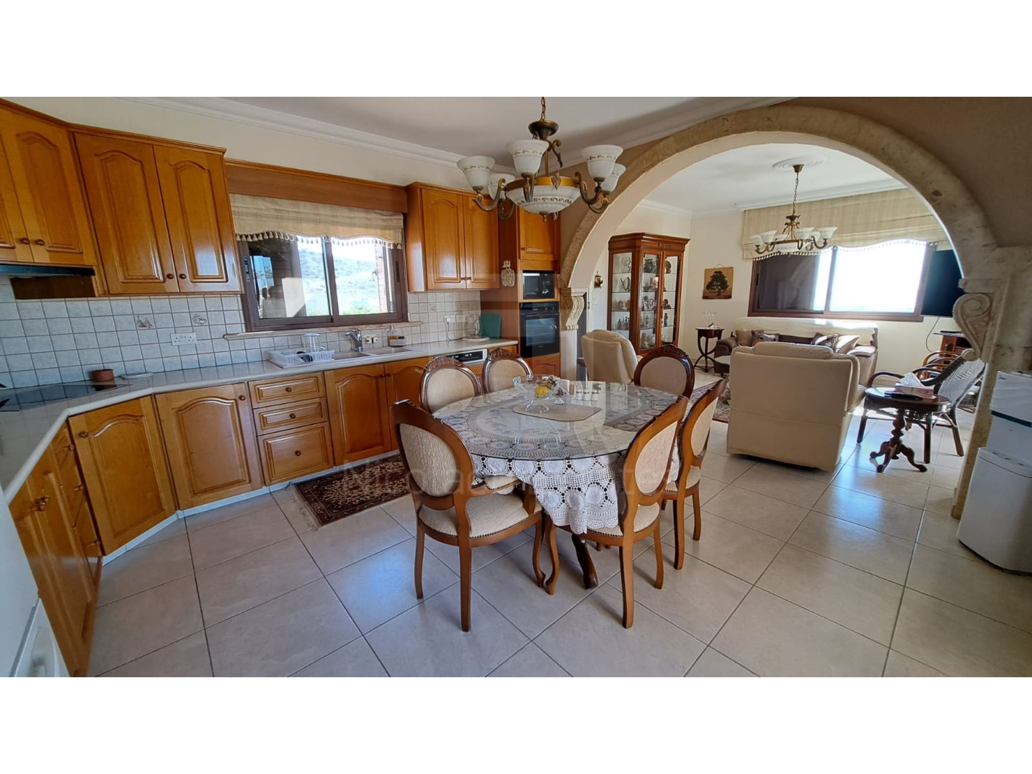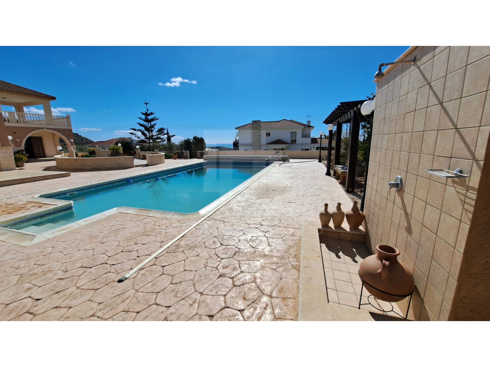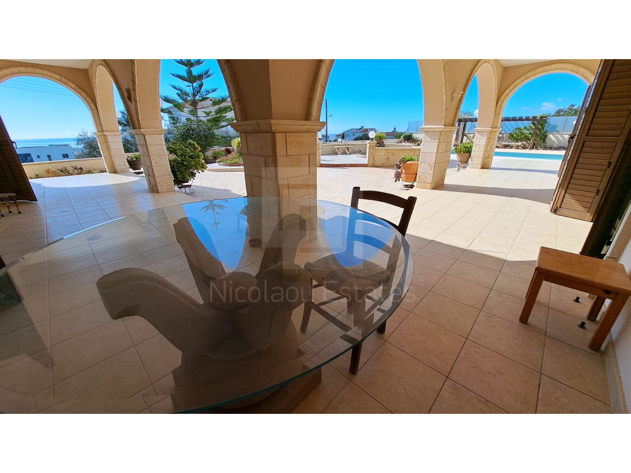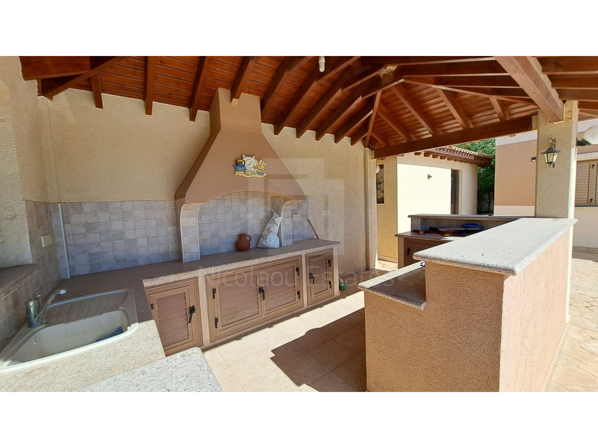 The outside space is truly spectacular with mature olive and fruit trees on the property perimeter,a large pool and a lovely BBQ Kiosk/kitchen for those pool parties all areas offering stunning sea views.
