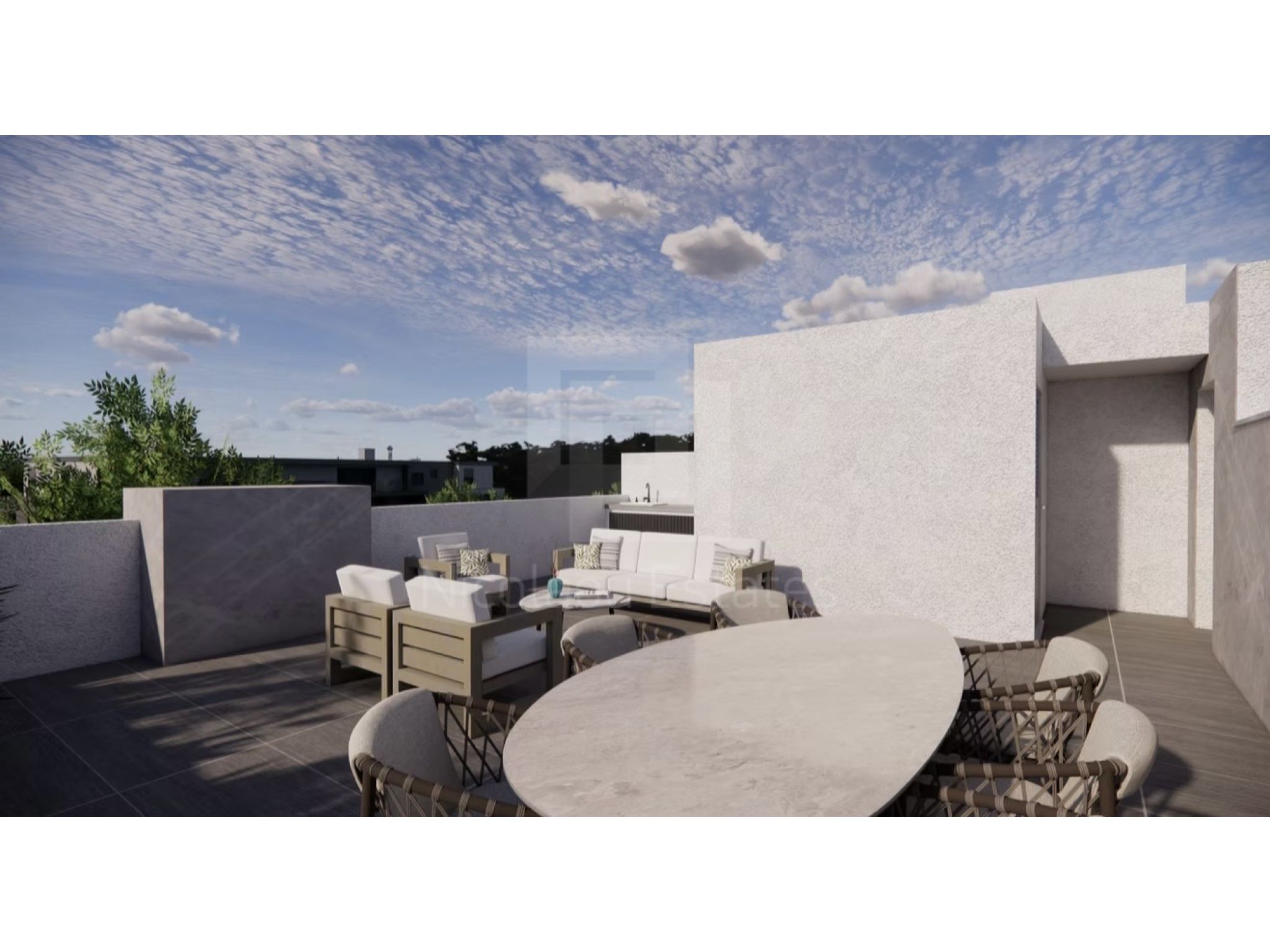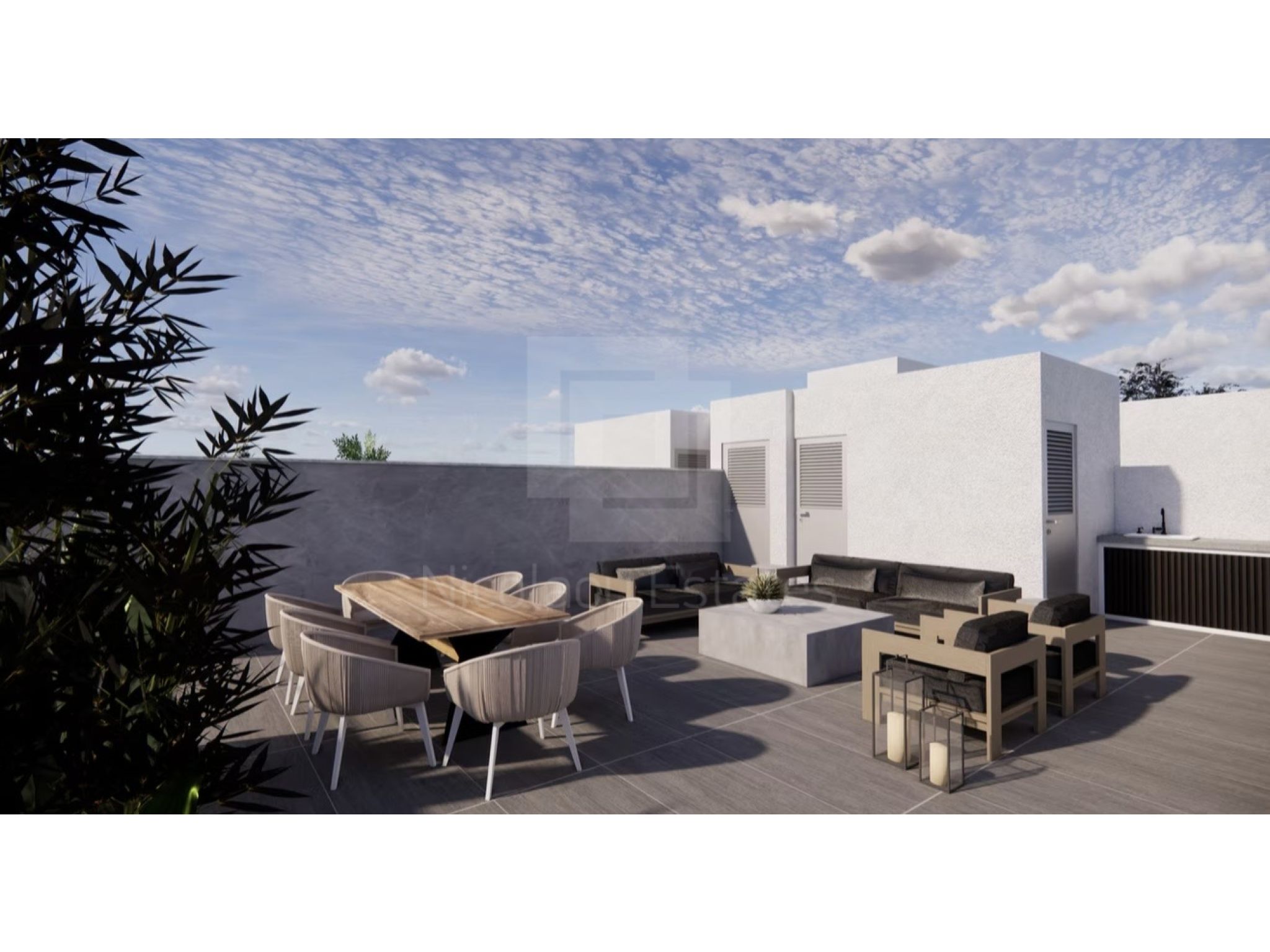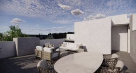 Apartment 202 (215,000 plus VAT): 2 bedrooms, 2 bathrooms, 79.2m2 of interior space, 17.3m2 of covered veranda, 66m2 of roof garden, private storage room and covered parking space.