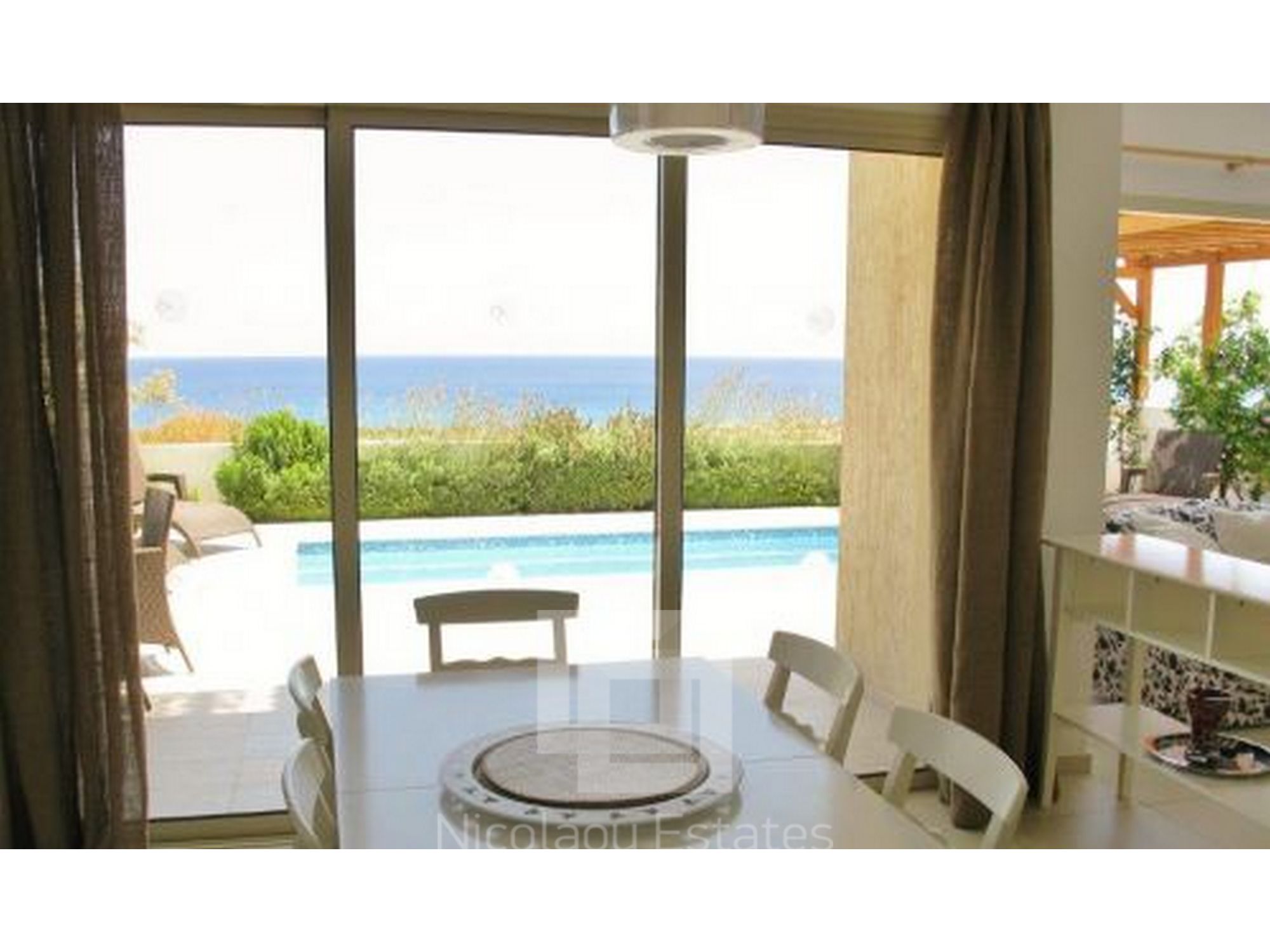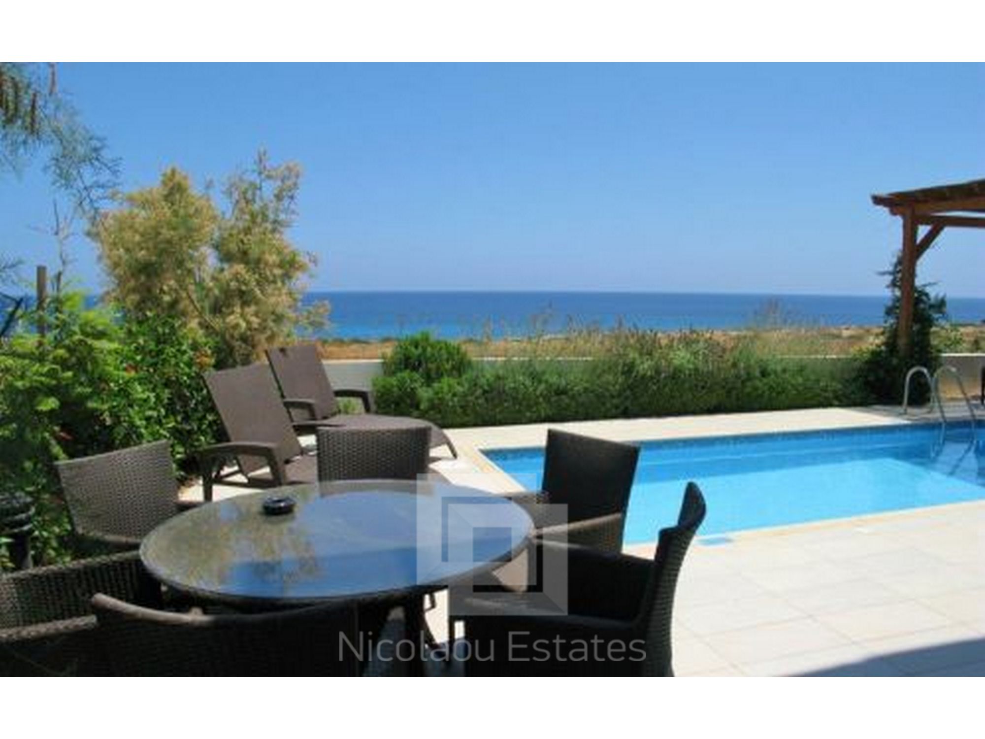 On the outside, the sunbeds, the swimming pool with its shower, a pergola and outdoor dining and lounging furniture complete the broad picture, all within well-landscaped grounds.